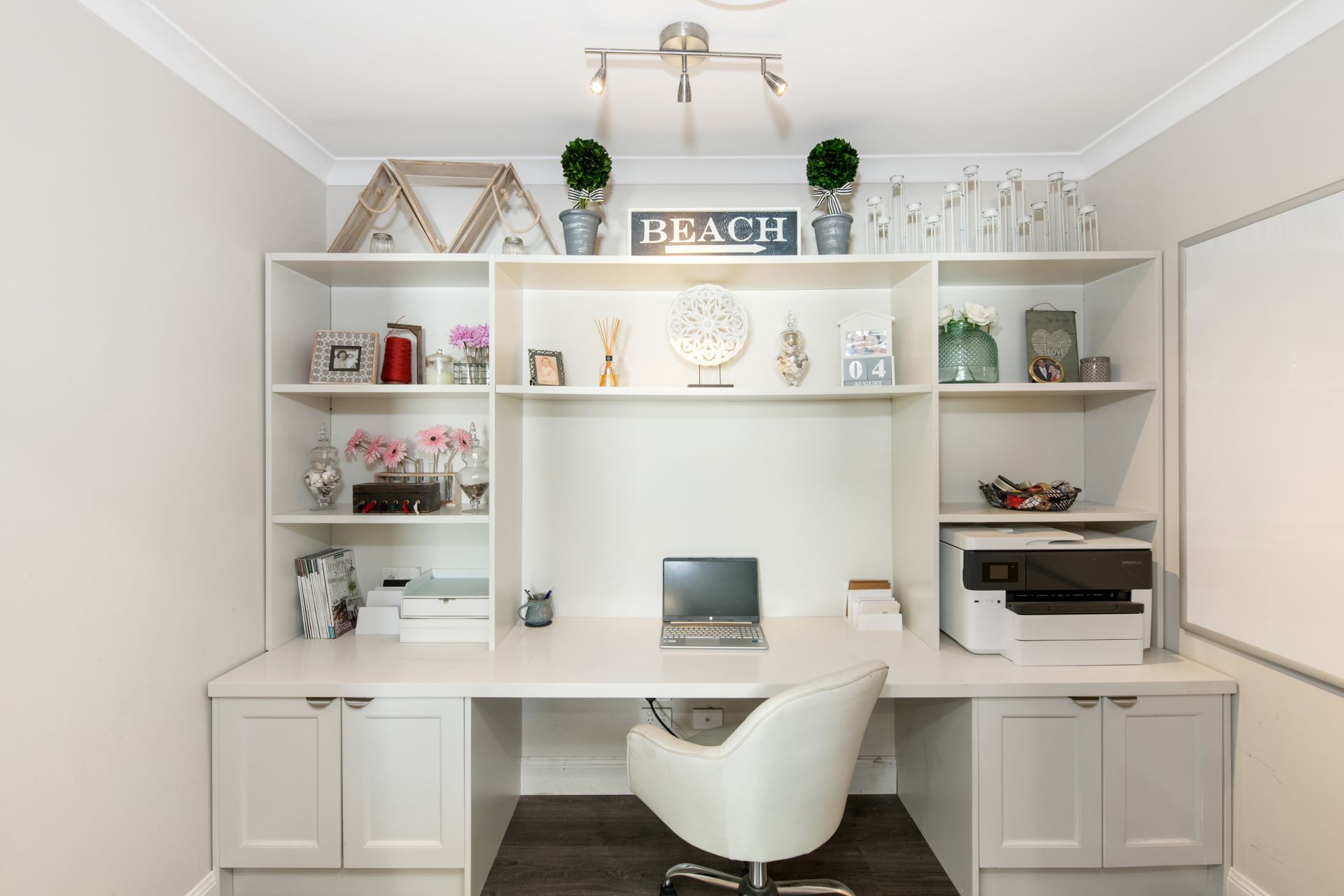 > Study is enclosed behind stylish barn doors and features timber flooring, ducted air-conditioning and built-in desk and shelving with stone benchtop.