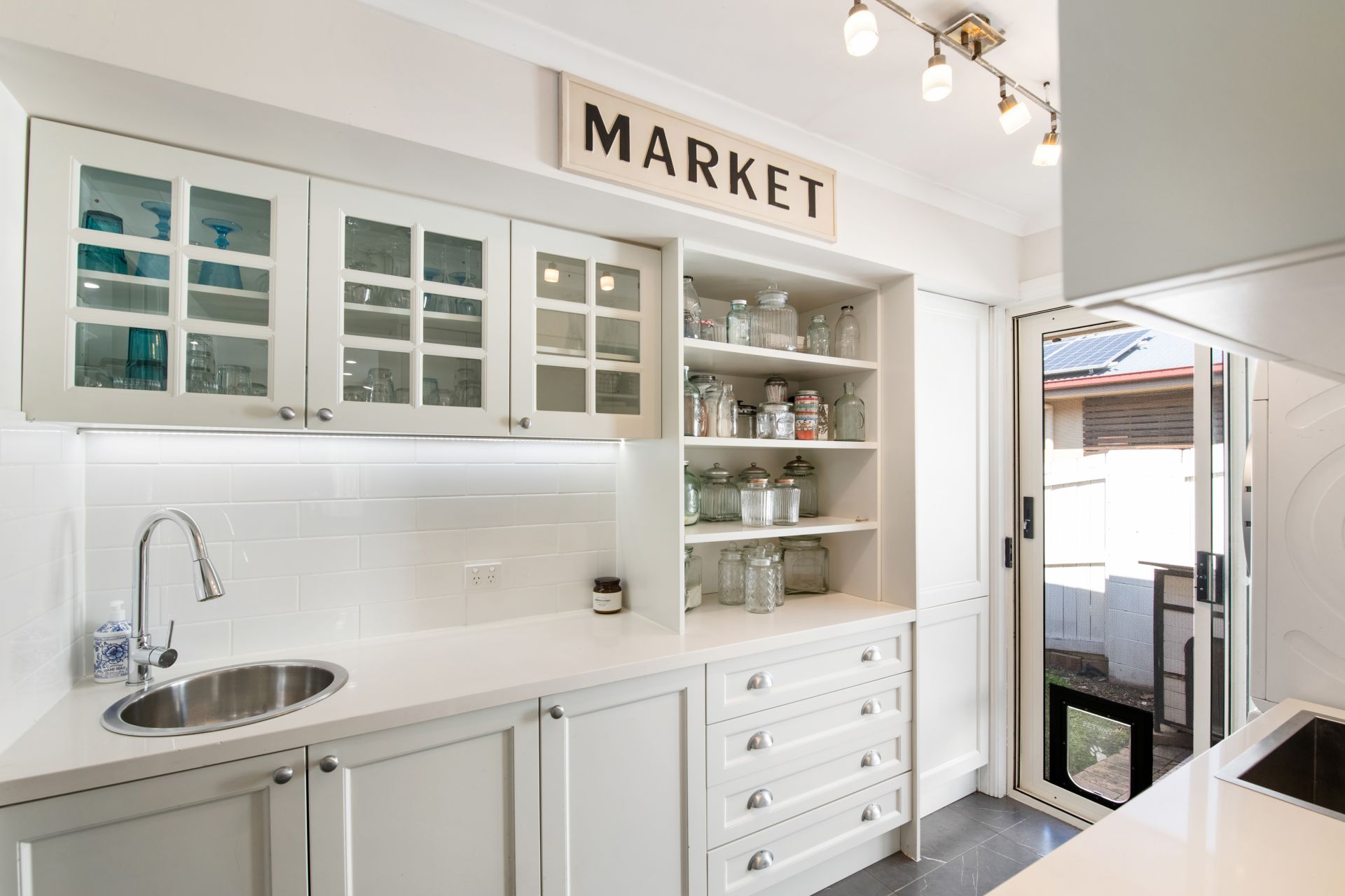 - The Laundry shares a space in the large Butler's pantry with room for a washing machine and dryer, separate washtub with extendable tap surrounded by a stone benchtop, security-mesh door and access to side yard.