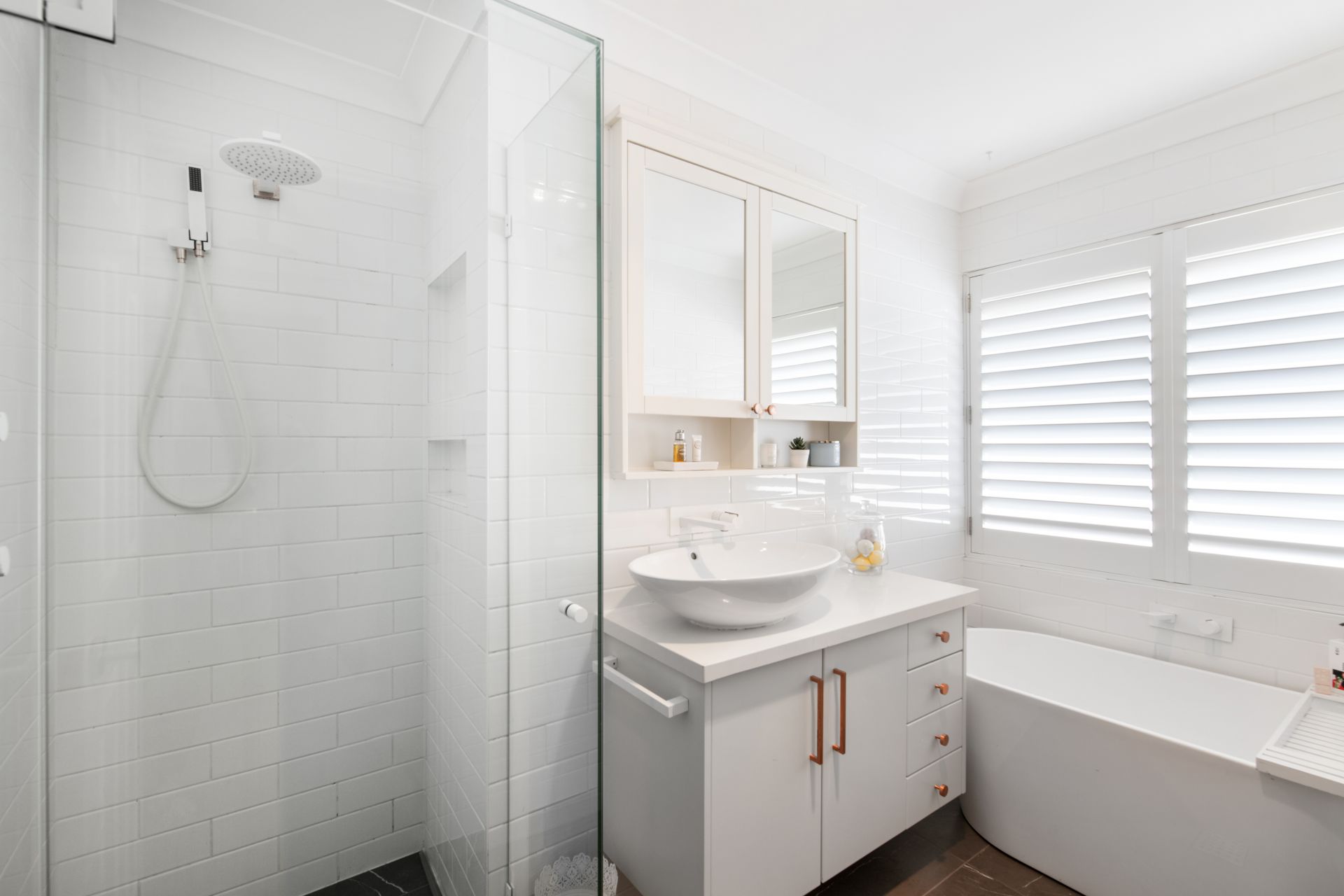 > The home's main bathroom has been stunningly renovated and features tiled flooring, floor-to-ceiling tiles, frameless glass shower with rainfall and detachable showerheads, separate deep-soaker bath, single custom vanity with stone benchtop and soft-close cabinetry, mirrored, plantation shutters and separate toilet.
