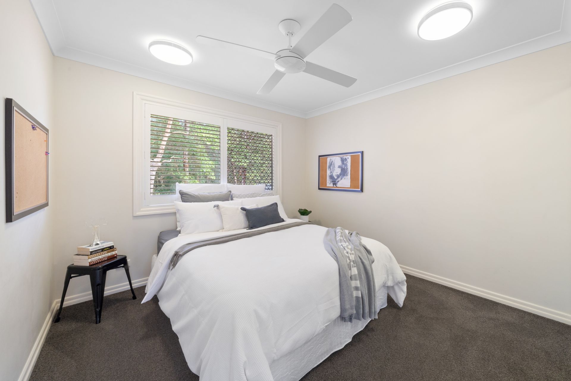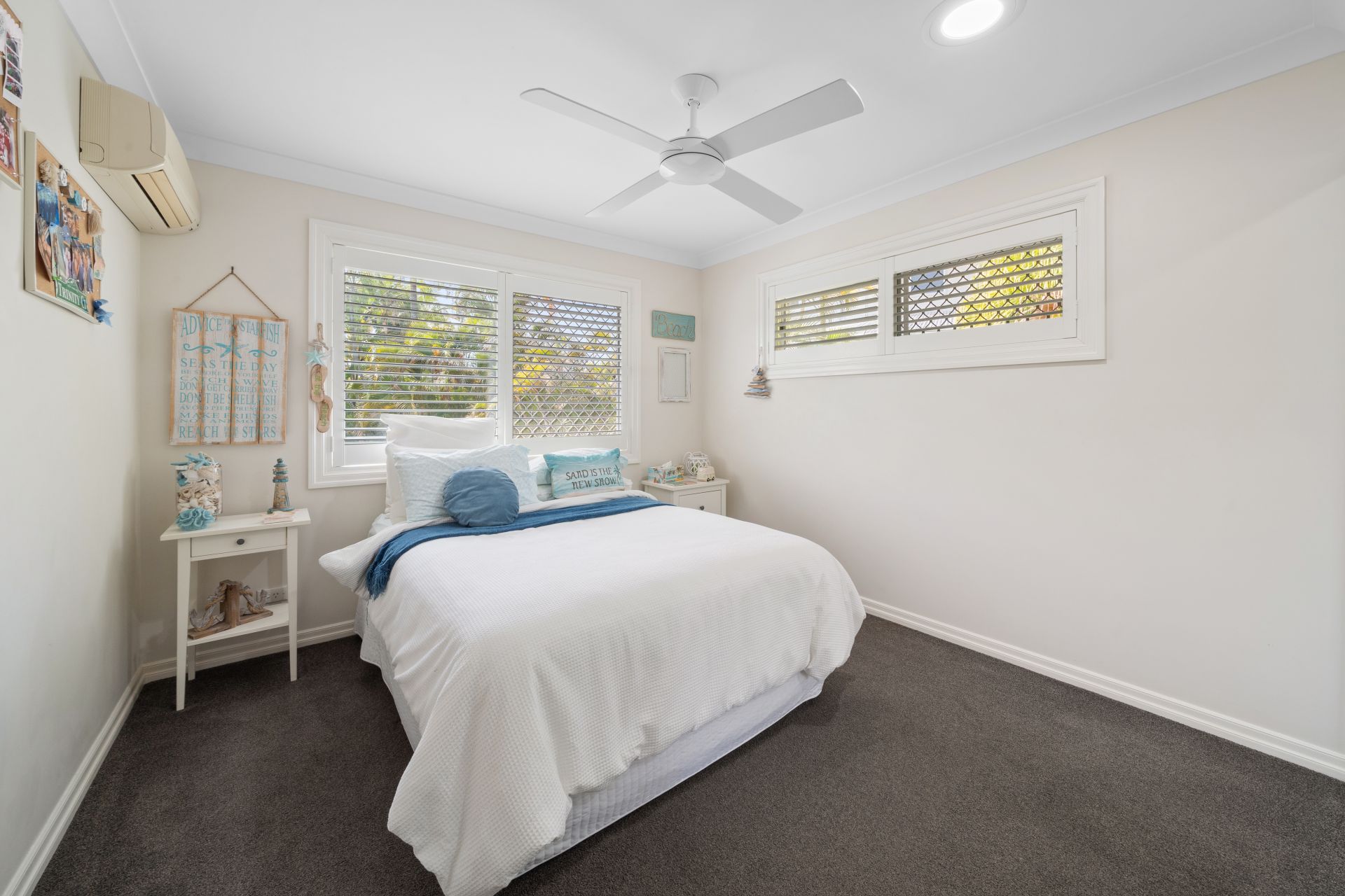 > Bedroom 5, located on the top level, features a ceiling fan, downlighting, plush carpet flooring, a built-in mirror-fronted robe, and sliding windows with security screens and plantation shutters.