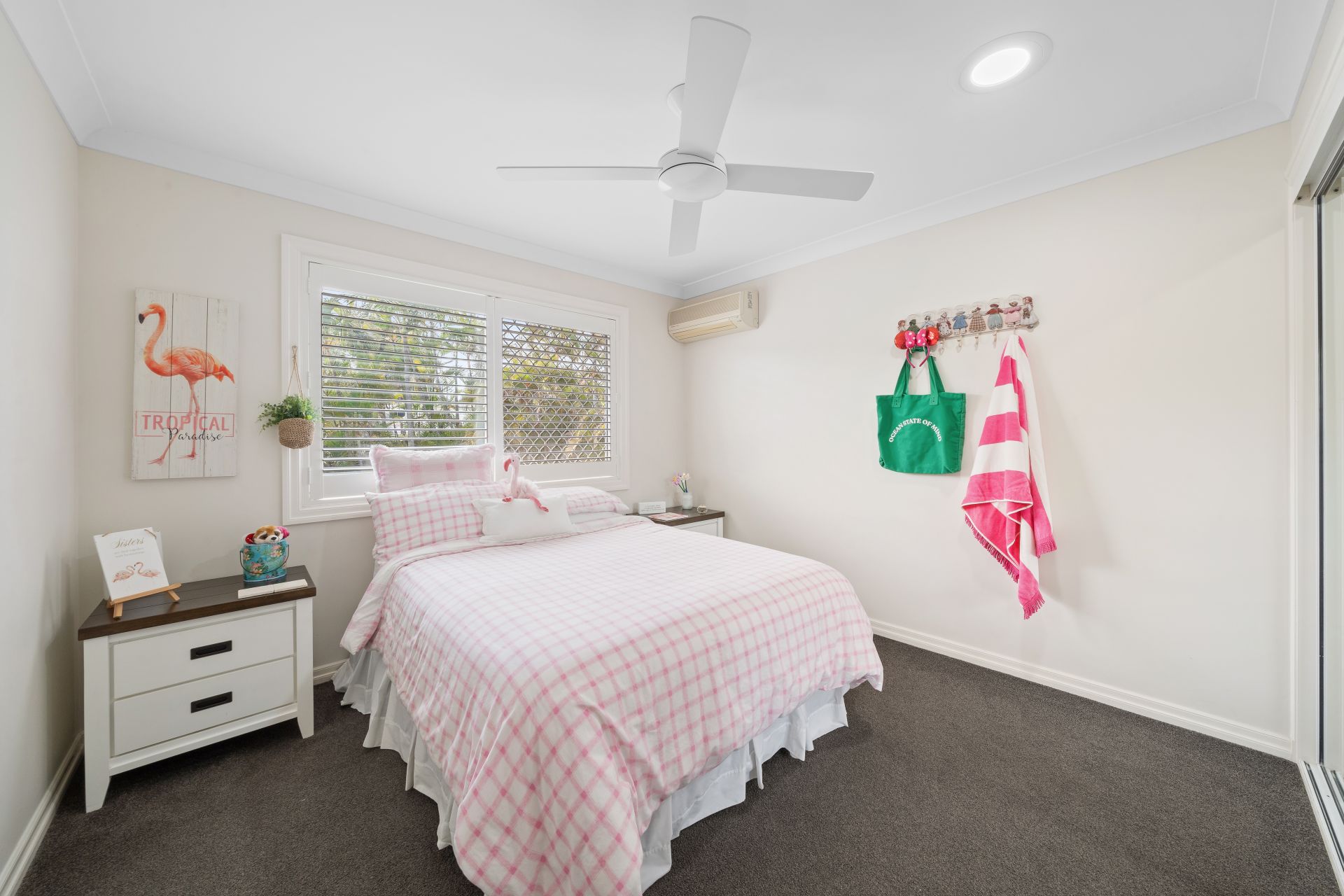 > Bedrooms 3 and 4, located on the top level, feature Daikin split-system air conditioning, ceiling fans, downlighting, plush carpet flooring, built-in mirror-fronted robes, and sliding windows with security screens and plantation shutters.