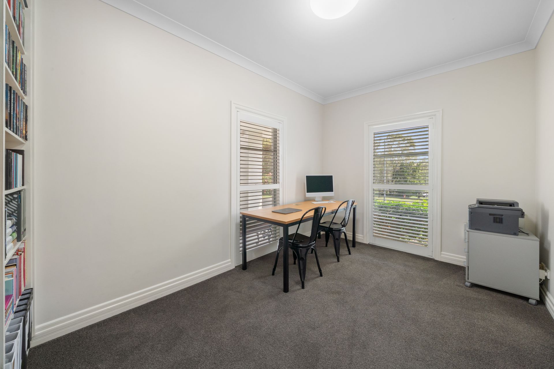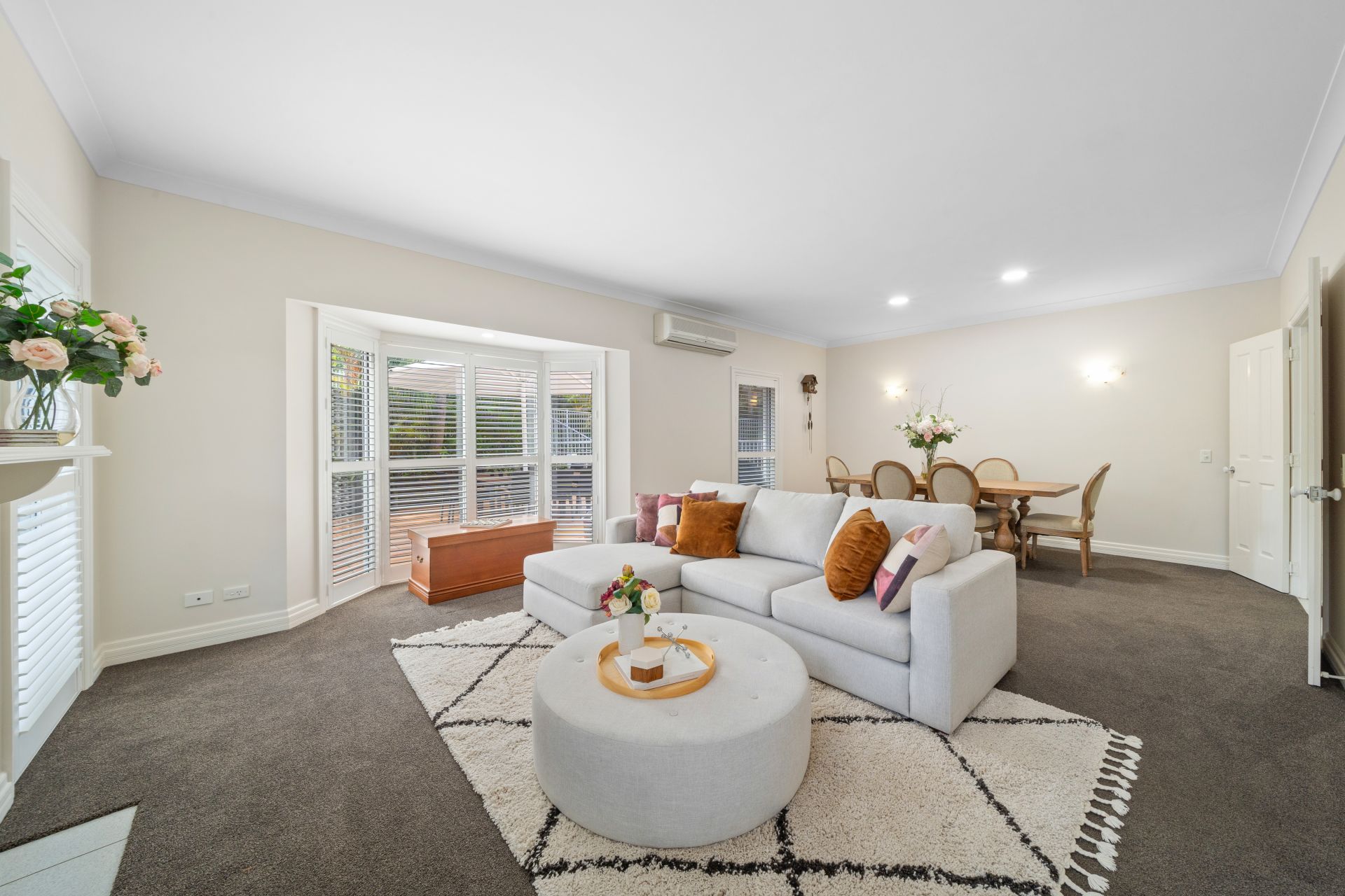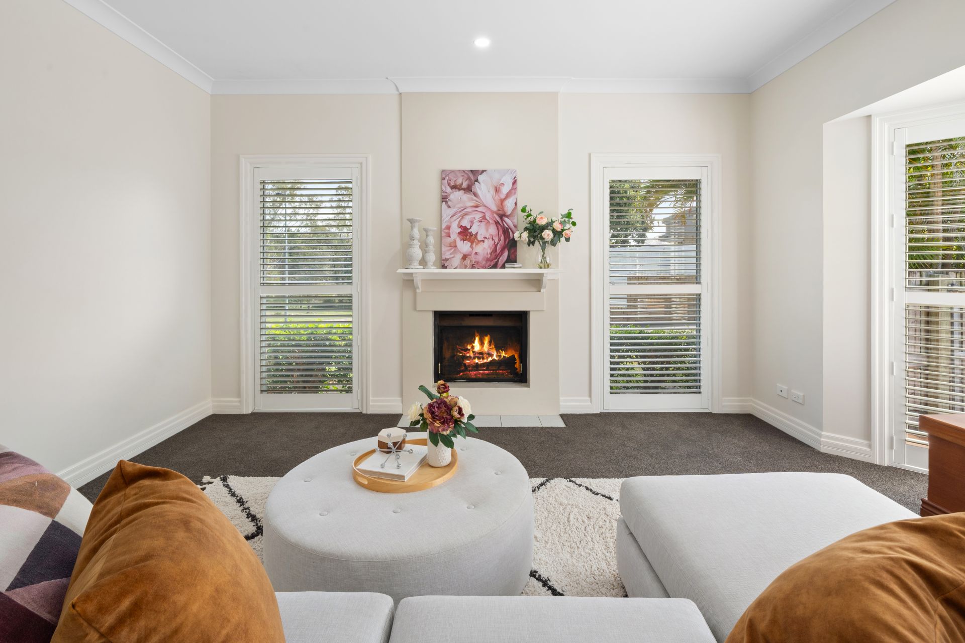 > Located at the front of the property is the large lounge/dining room, boasting a working fireplace, plush carpet flooring, Fujitsu split-system air conditioning, sconces as well as downlighting, and sash bay windows with security screens and plantation shutters.