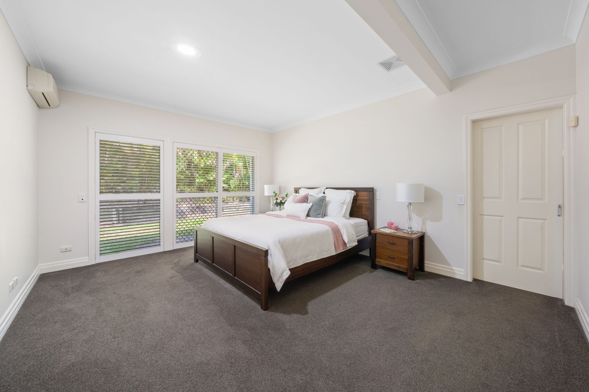 > The palatial master bedroom located on the entry level is perfect for those who enjoy their own space, boasting high ceilings, Daikin split-system air conditioning, plush carpet flooring, downlighting, a walk-in robe, a large ensuite, sash windows, and a sliding door with security screens and plantation shutters, giving you access to the yard.