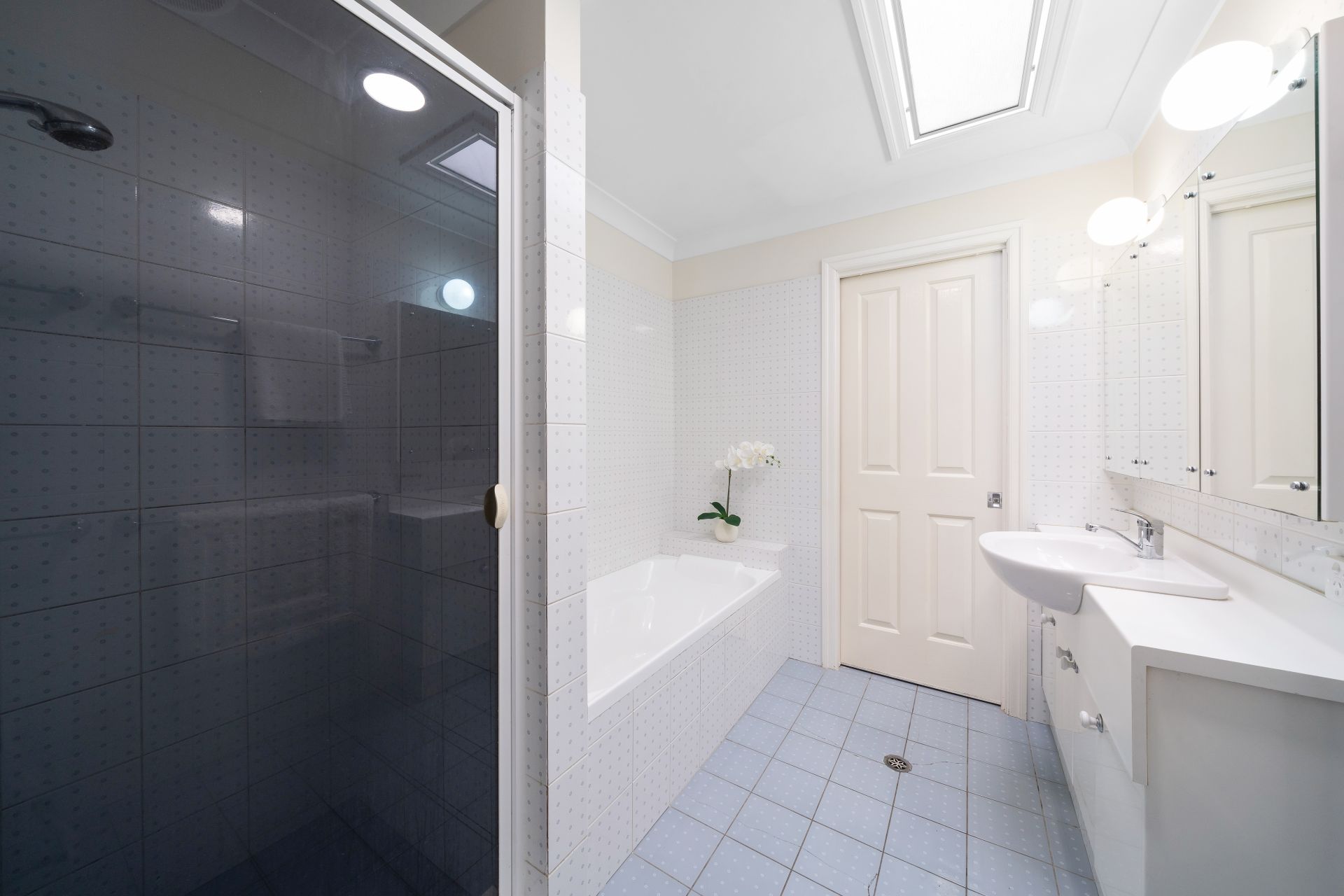 > The ensuite to the master features a shower with a separate bath configuration, a large double basin vanity with plenty of storage, towel racks, a large vanity mirror-fronted cabinet, an extractor fan, vanity and standard lighting, a sliding window with security screens, and a separate toilet.