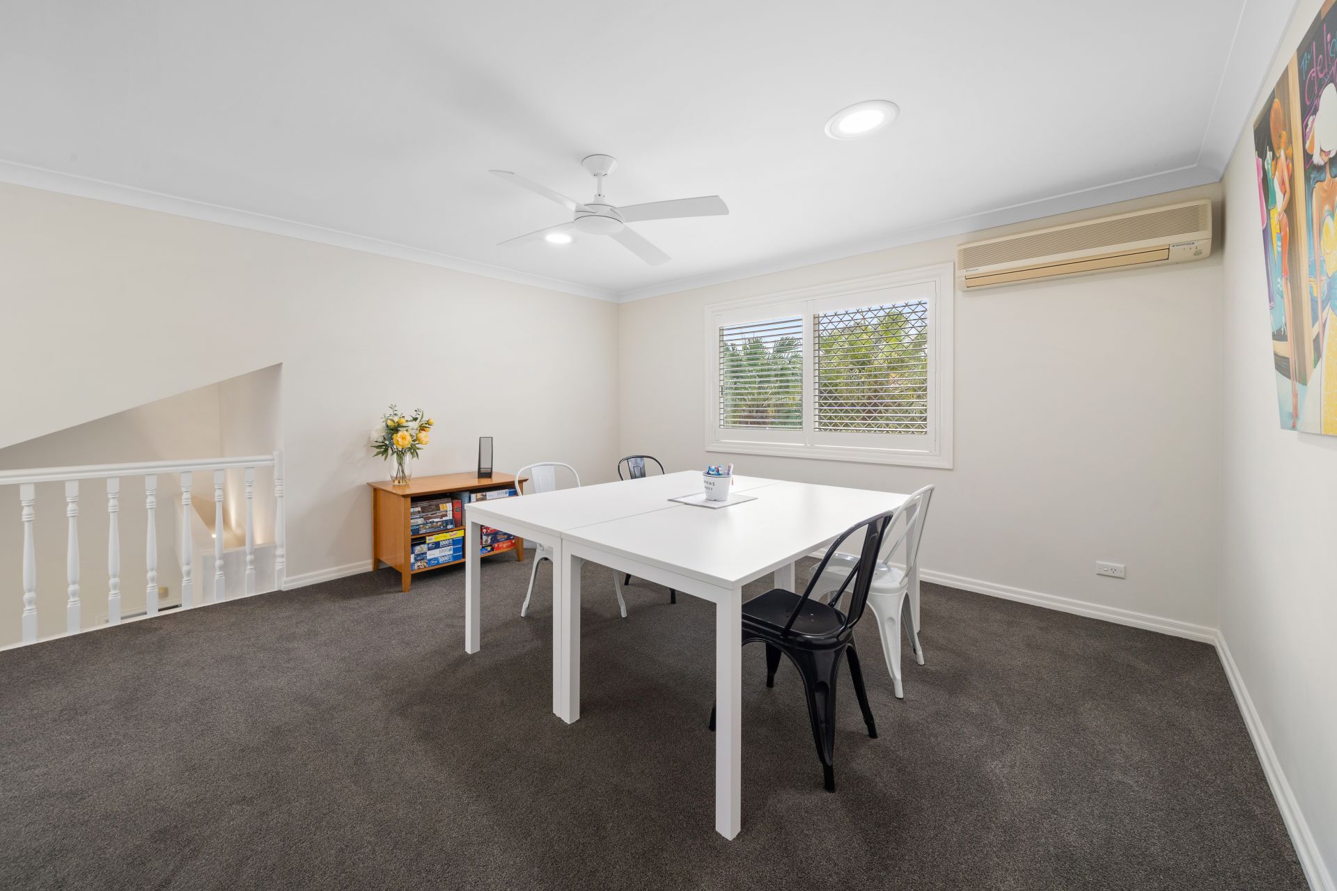 > Located on the top level is the retreat, featuring plush carpet flooring, downlighting, Daikin split-system air conditioning, a ceiling fan, sliding windows with security screens, and plantation shutters.
