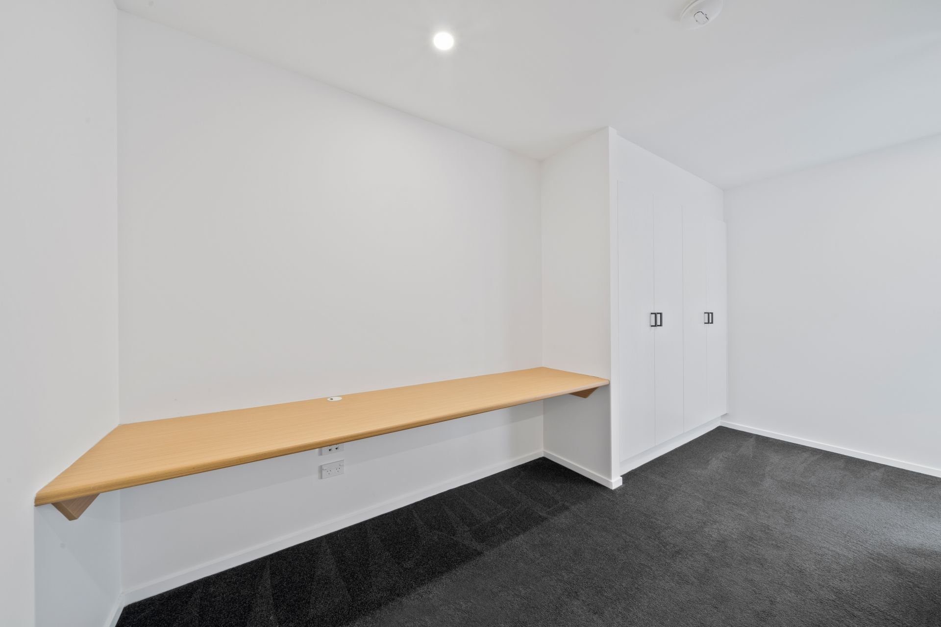 > Bedrooms 2, 3, and 4 feature plush charcoal carpet, LED downlights, ceiling fans, white roller blinds, and built-in mirrored wardrobes.