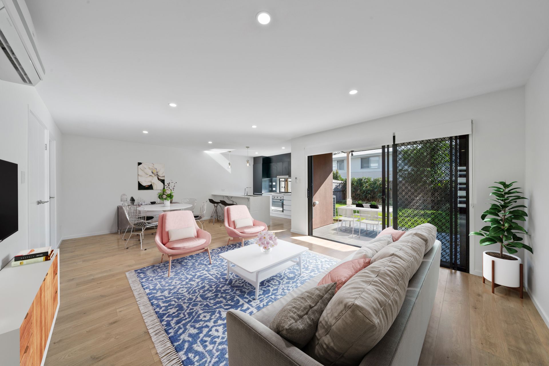 - Open-plan living and dining area featuring LED downlights, a split-system air conditioner, white roller blinds, timber-look flooring, a linen closet, and a triple stacker glass sliding door with a security screen providing access to the covered outdoor patio.
