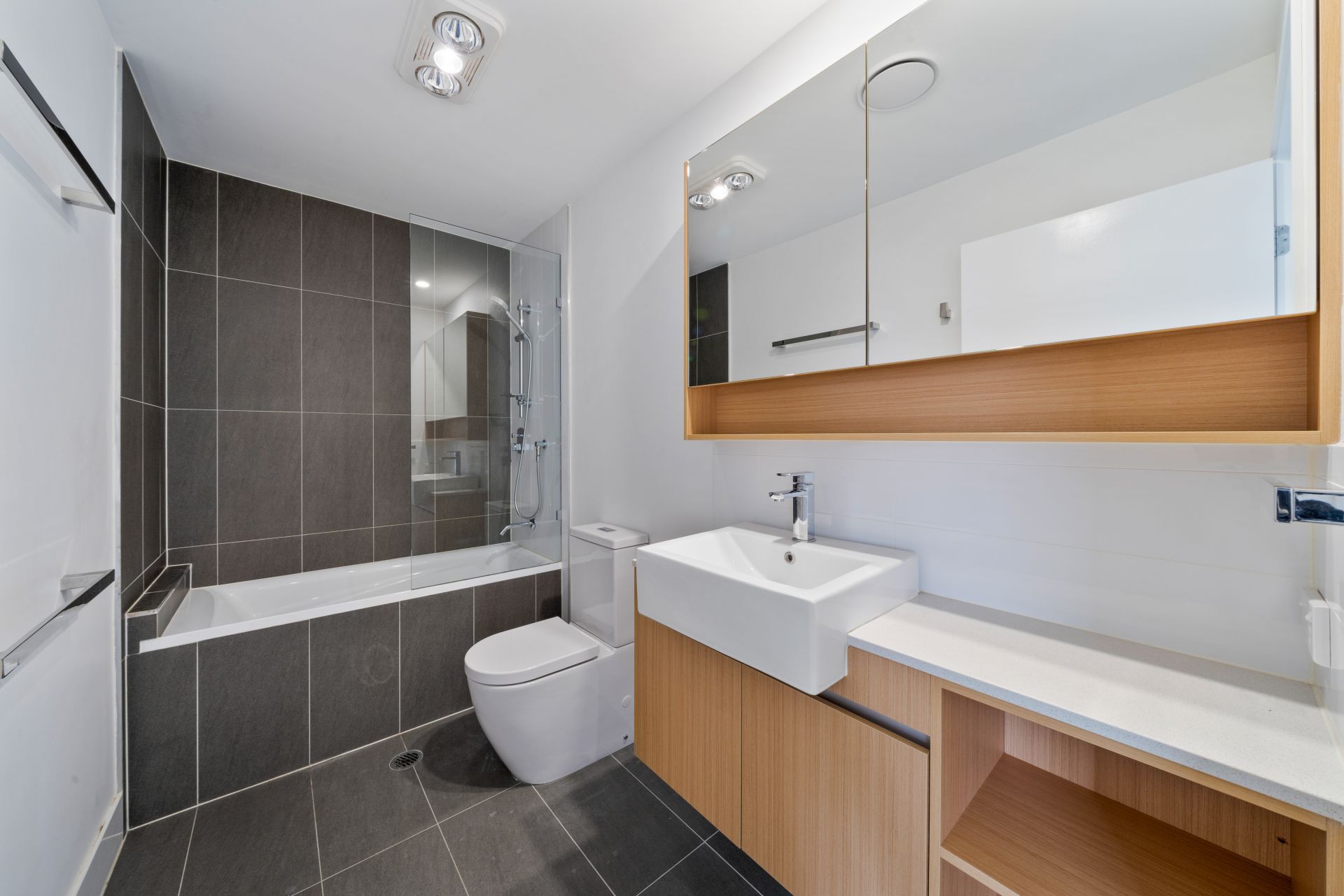 > he second bathroom offers a stone benchtop, double vanity mirror with a shelf, under-bench storage, storage cupboards, a shower over a large bath with frameless glass and chrome fittings, two stainless-steel towel rails, a combination exhaust/heat lamp, and a toilet with a soft-close lid.