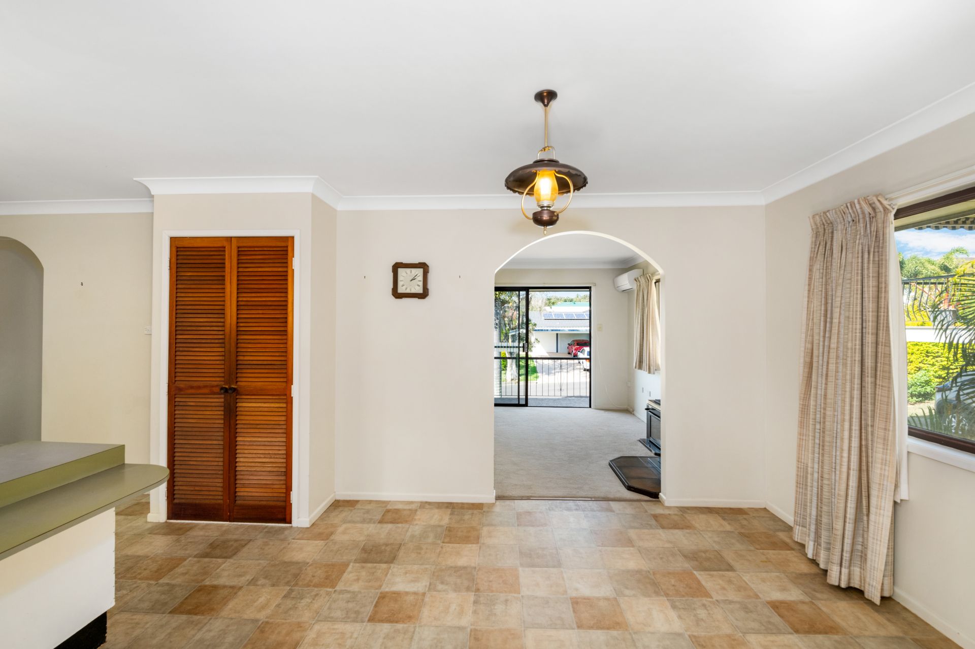 > Dining room adjoins the home's kitchen and features vinyl flooring, split system air-conditioning and access to the rear balcony that overlooks the sprawling back yard.