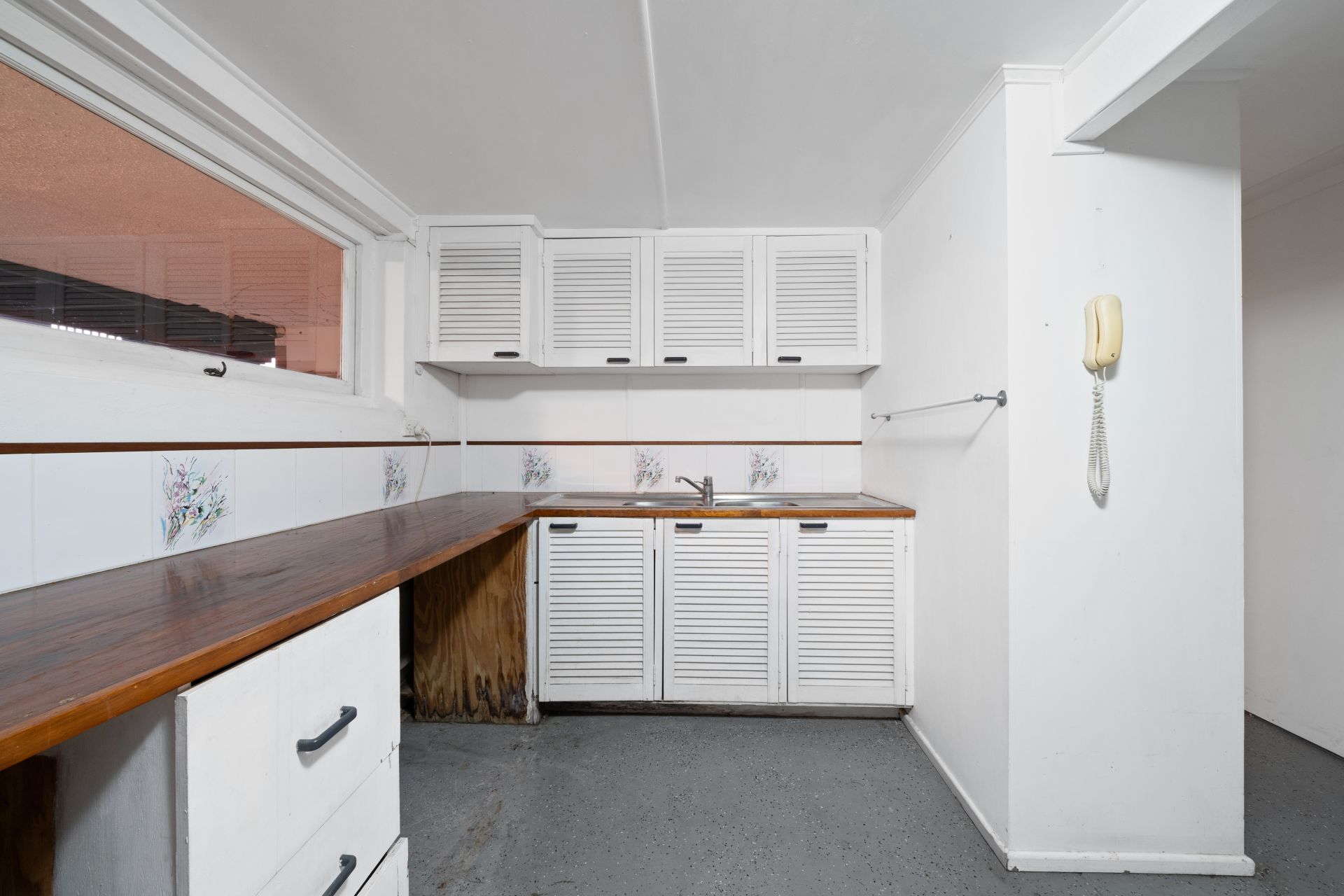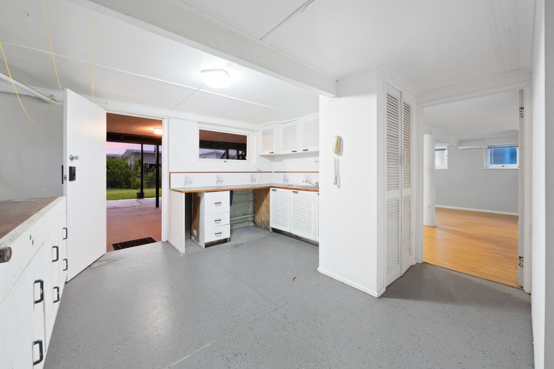 - The laundry, located on the lower level, features a washtub, space for a washer and dryer, a timber benchtop, as well as cabinetry with a large workbench and access to the yard.