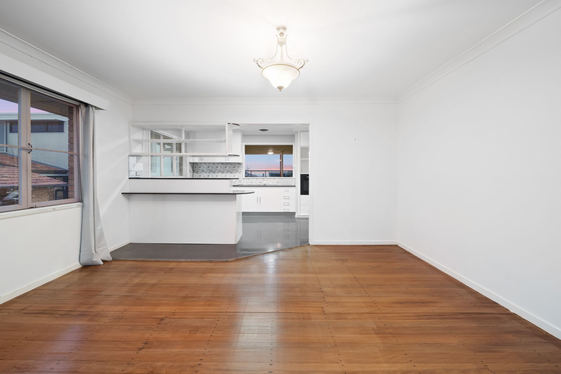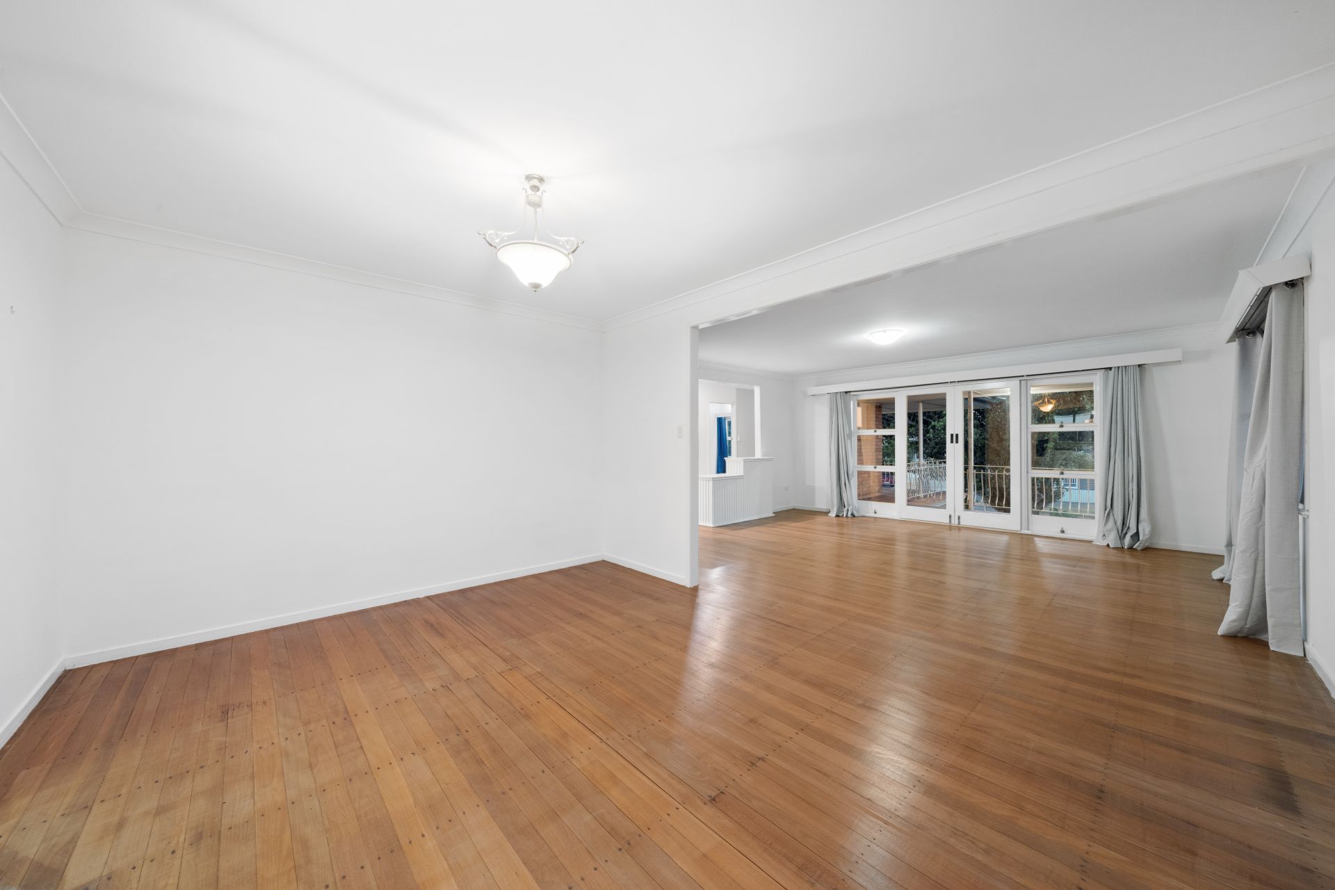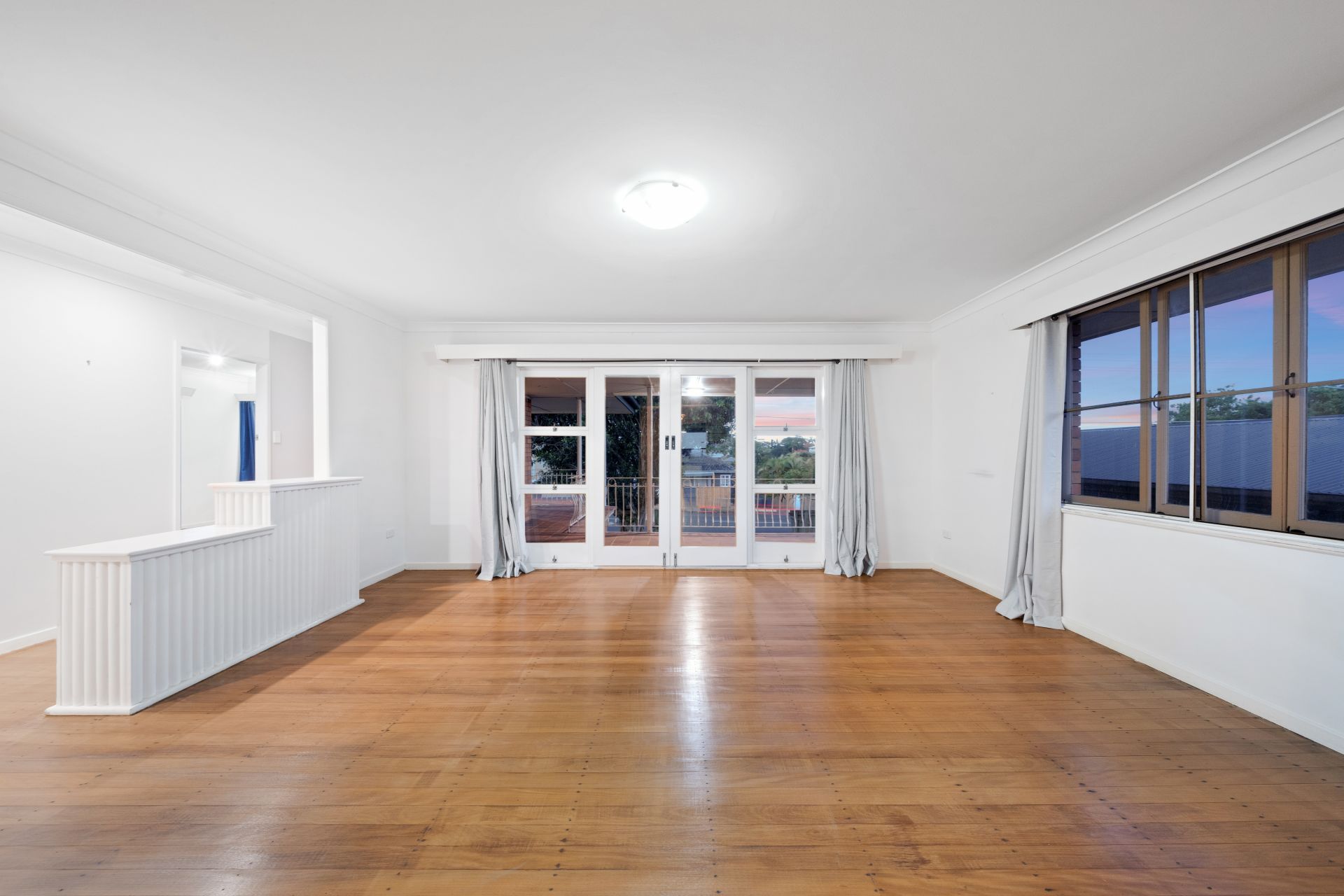 > Located on the top level of the property is the open-plan lounge flowing through to the dining room, featuring rich timber flooring, pendant and oyster lighting, casement windows, curtains, and large glass doors giving access to the front wrap-around balcony.