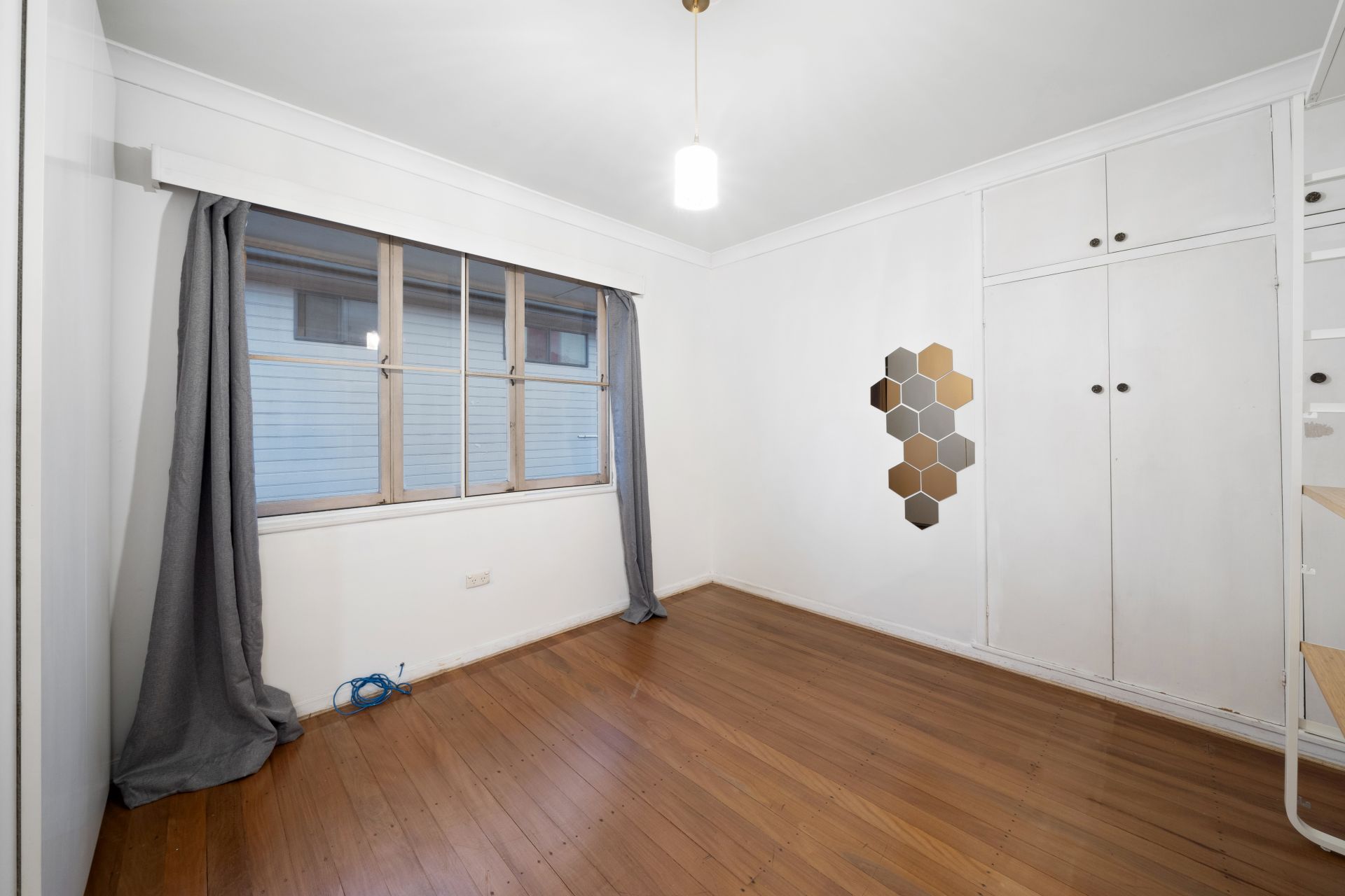 > Bedroom 2 features rich timber flooring, pendant lighting, dual built-in wardrobes, and casement windows with curtains.