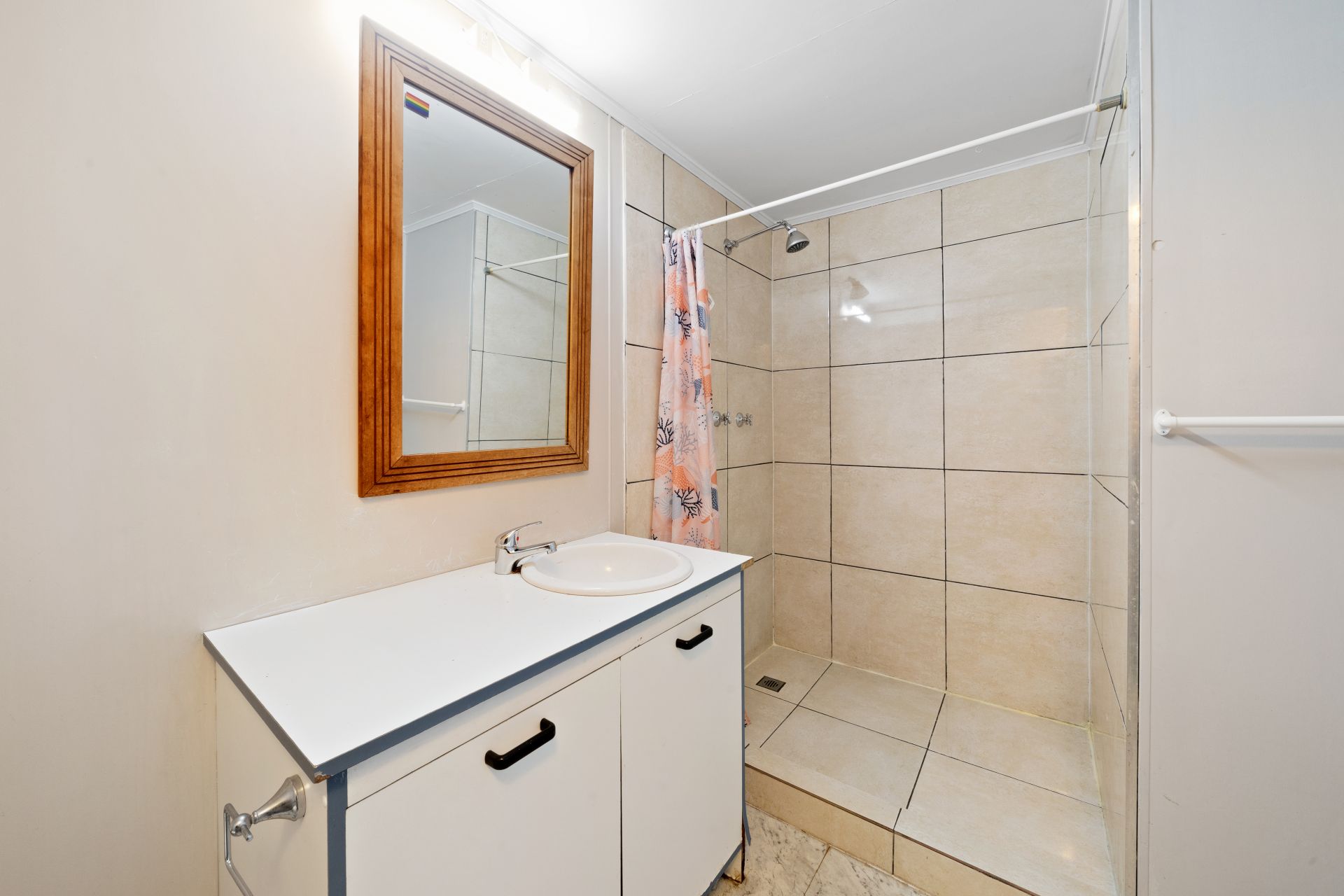 > Bathroom 2 features a shower, a single-basin vanity with storage, dual towel rails, a vanity mirror, standard lighting, a frosted window, and a toilet.