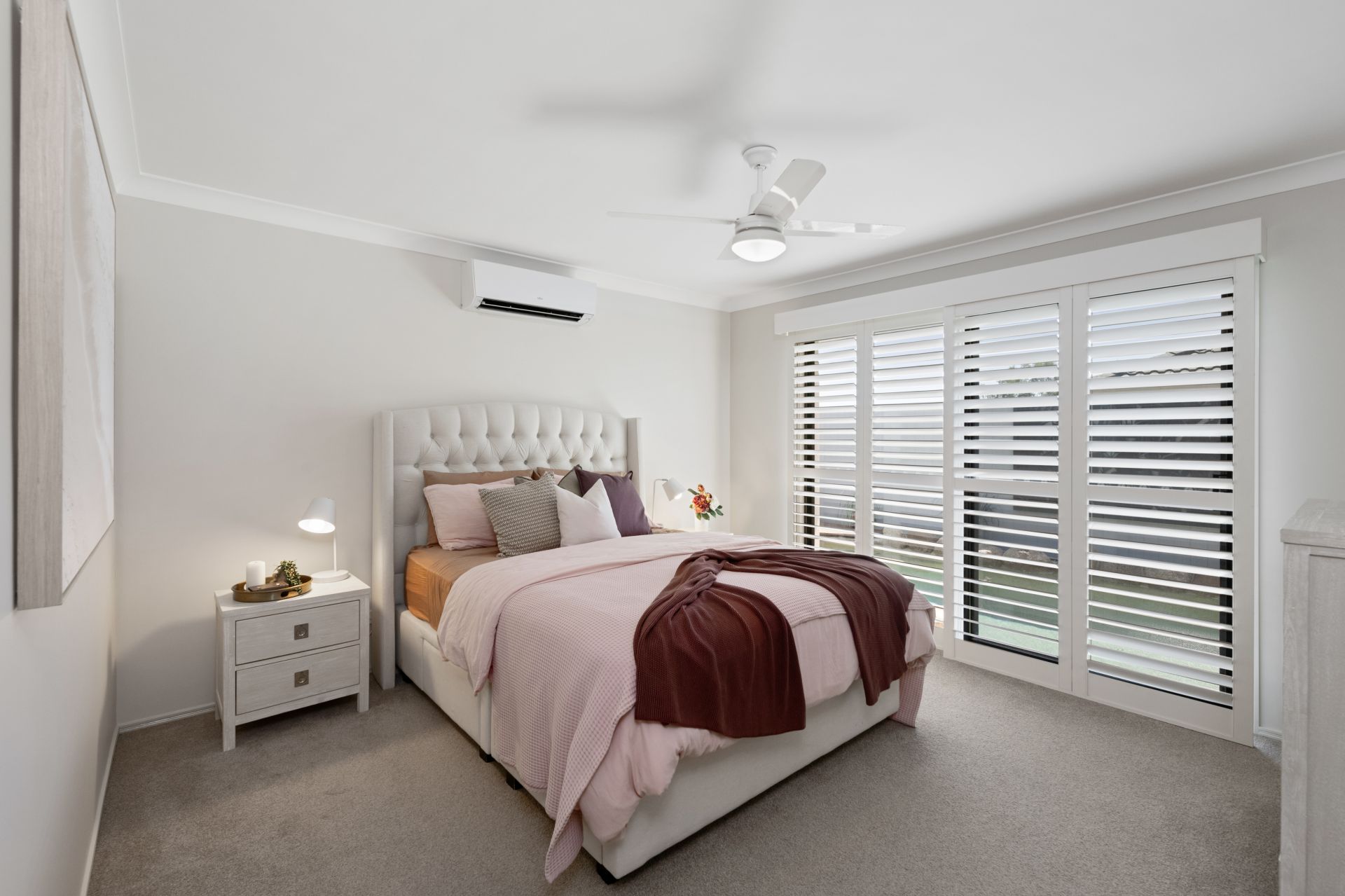 > Bedroom one is the home's spacious master bedroom featuring carpeted flooring, stunningly renovated ensuite, split system air-conditioning, ceiling fan, large walk-thru-robe with custom built-in cabinetry, huge window overlooking the resort style pool and plantation shutters.