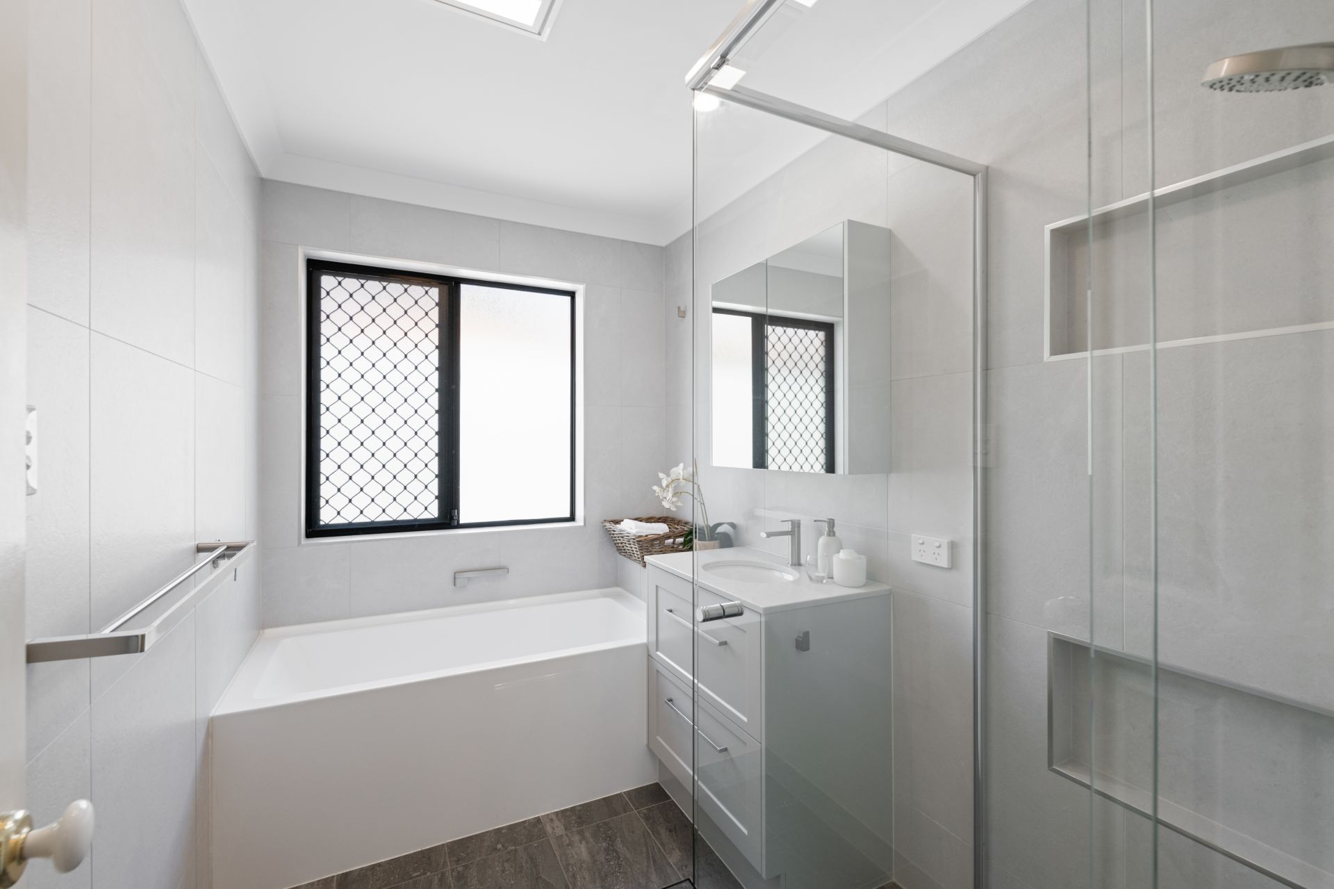 > Bathroom one is the home's beautifully renovated main bathroom boasting tiled flooring, floor-to-ceiling tiles, shower with rainfall and detachable showerheads and wall niches, separate deep-soaker bath, single vanity with stone benchtops and soft-close cabinetry, mirrored cabinet with concealed power points and separate toilet.