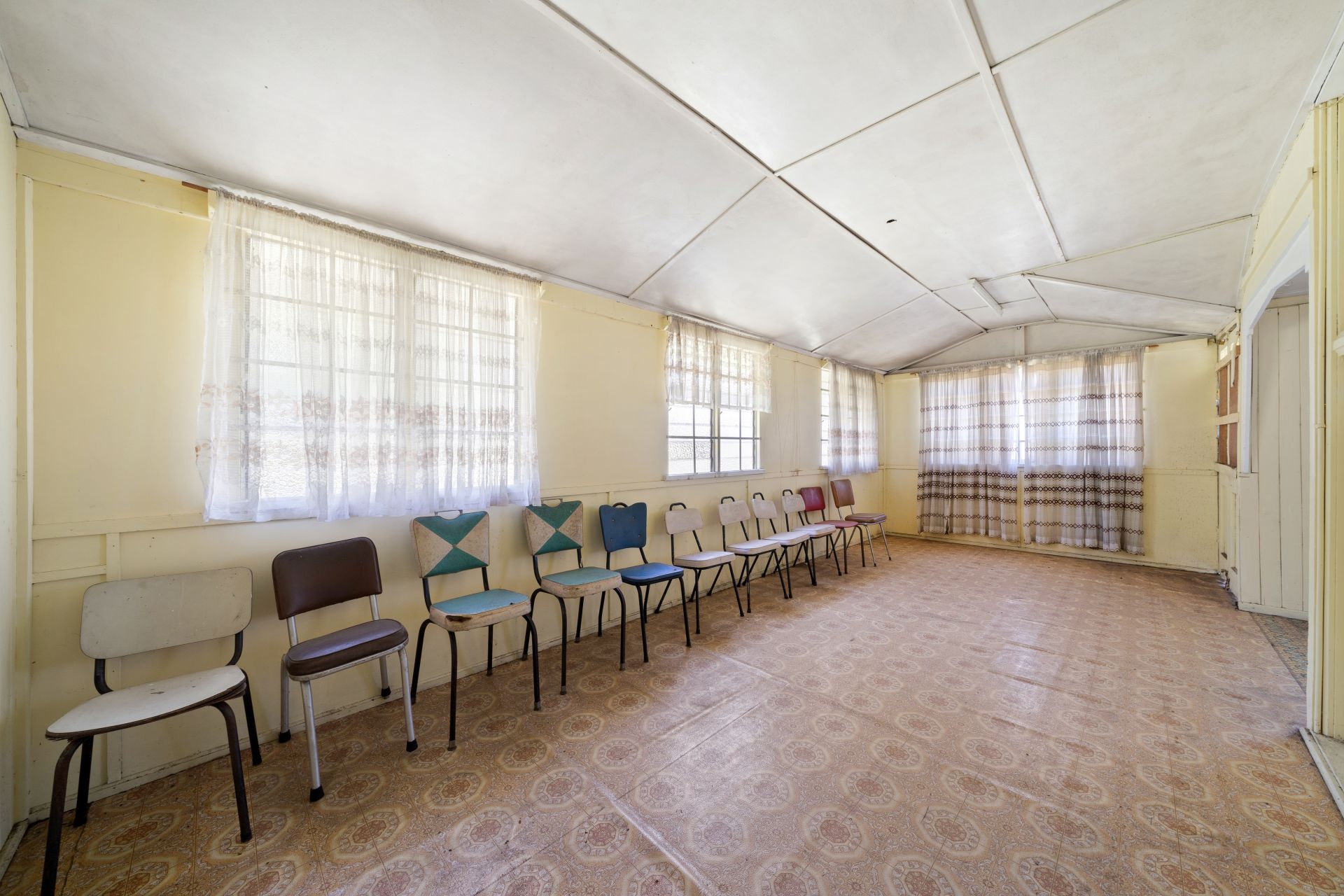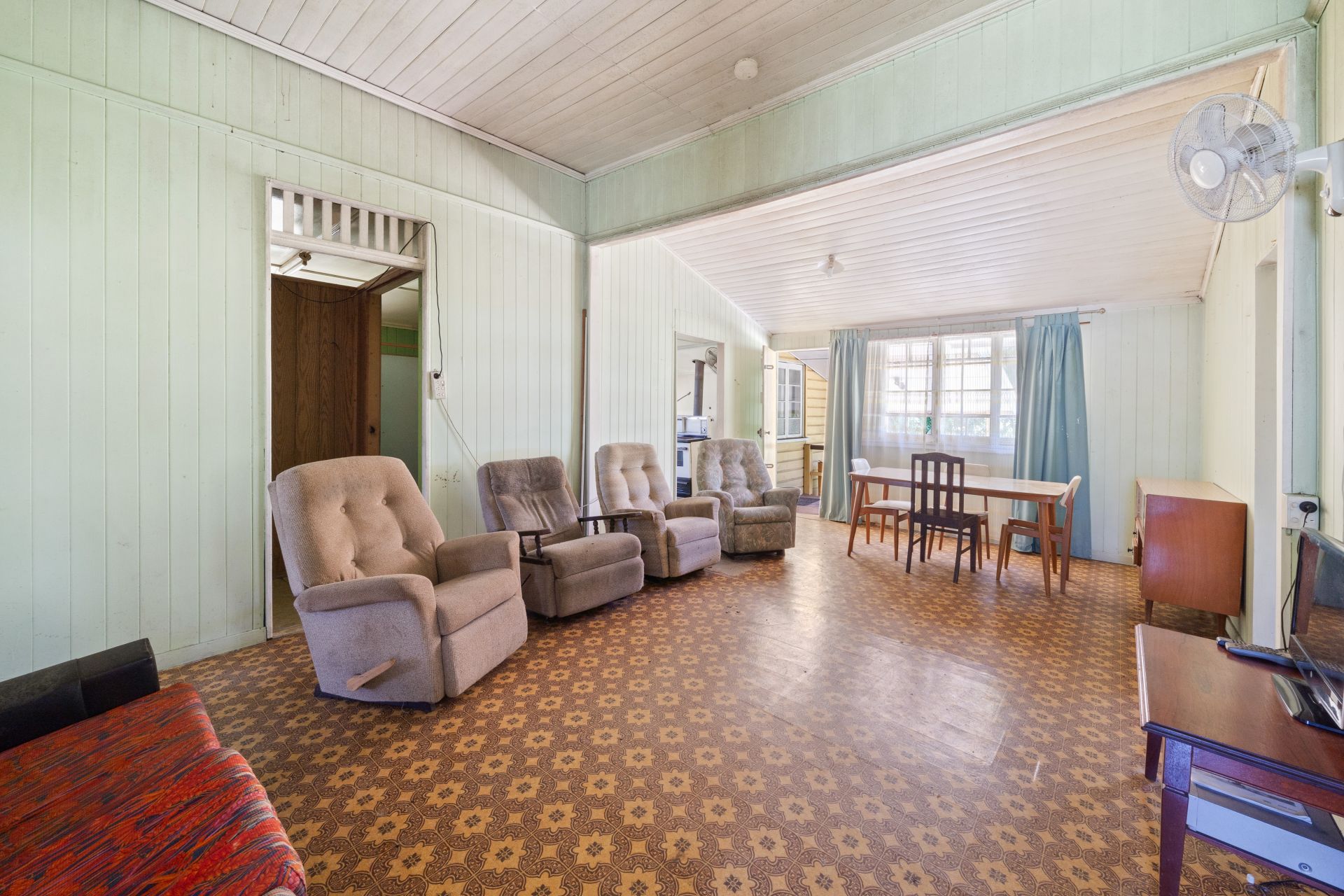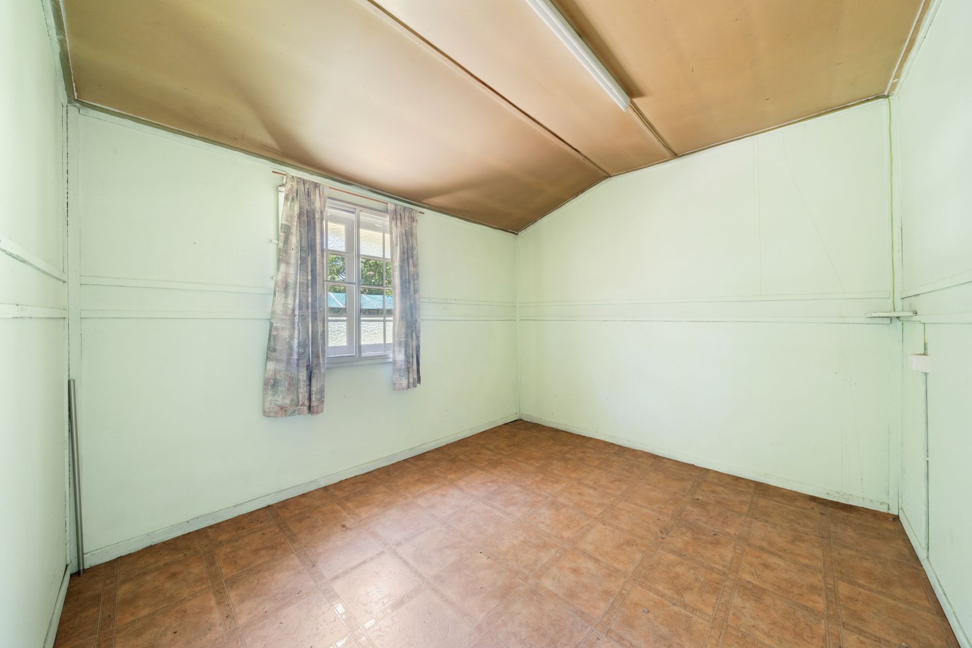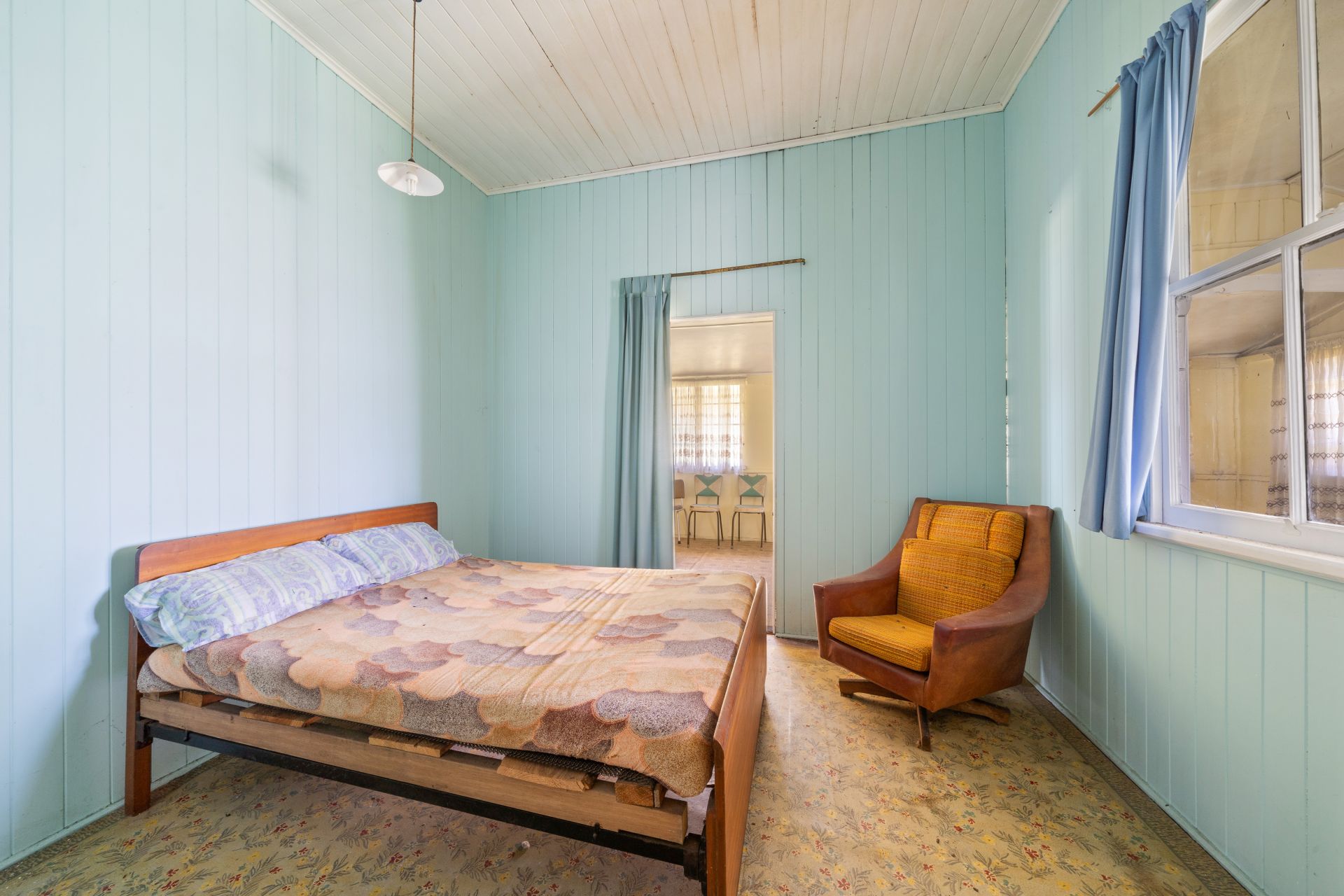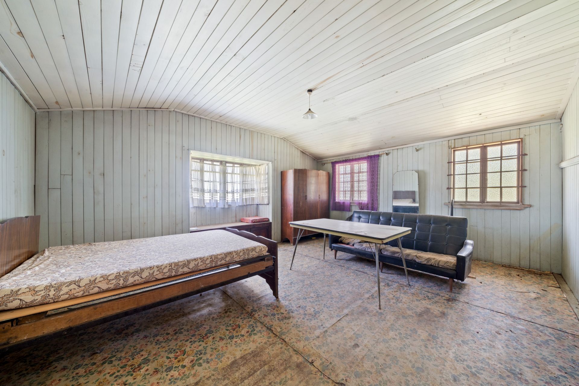 > The master bedroom is perfect for those who enjoy their own space, featuring vinyl flooring, VJ walls, picture rails, high ceilings, standard lighting, casement windows, lace curtains, and French doors that open to the lounge and dining area.