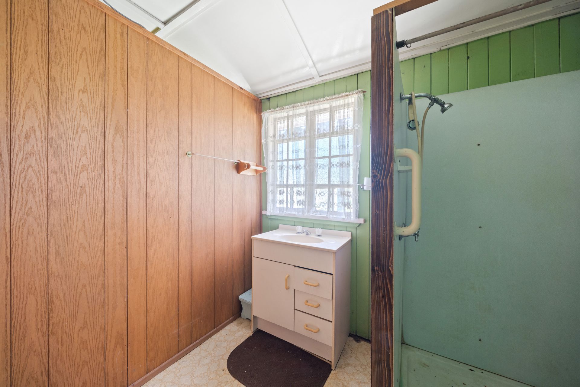> Located just off the living and dining area, the retreat features vinyl flooring, casement windows with curtains, and VJ walls.