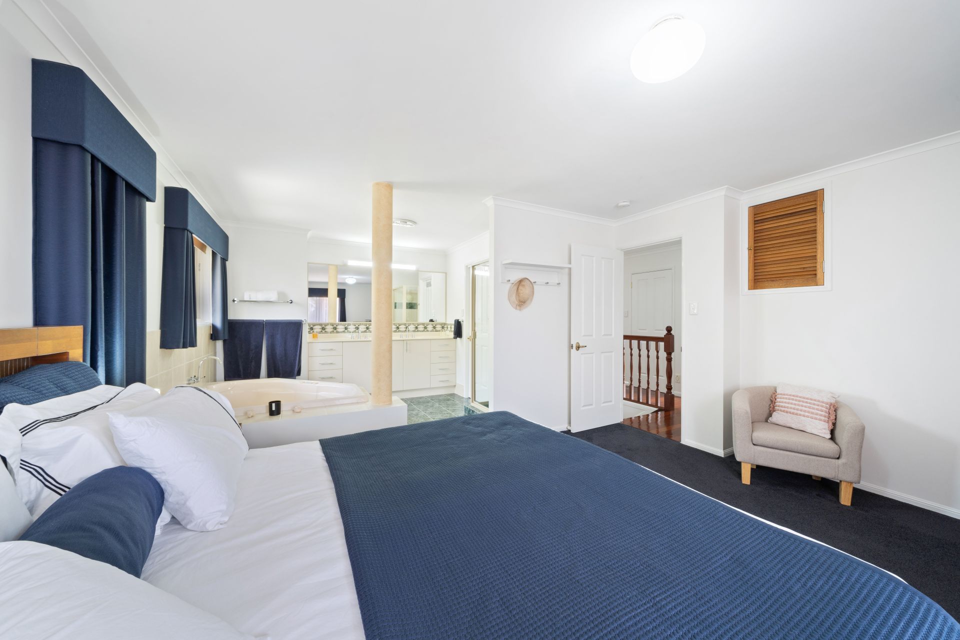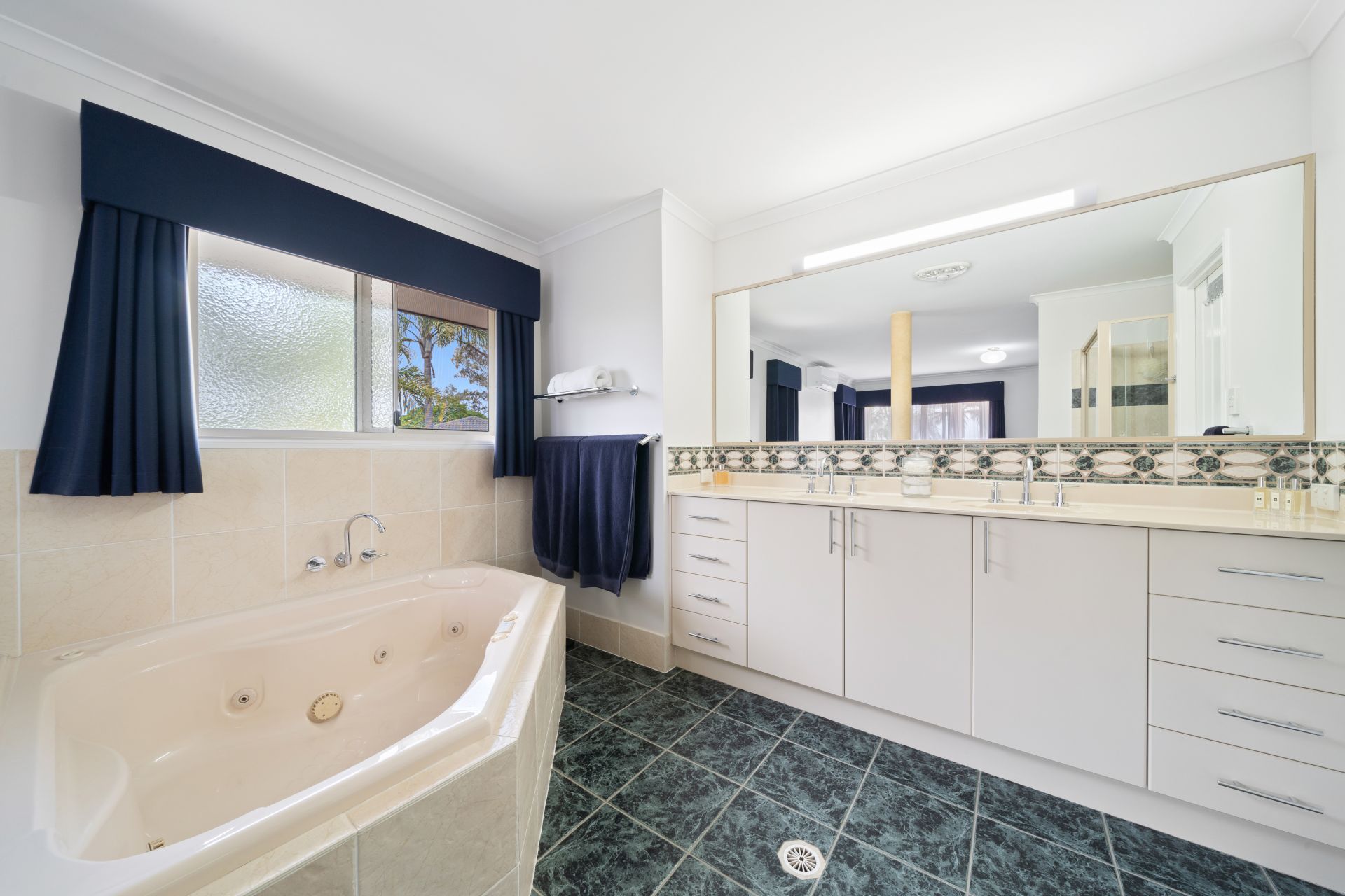 > The Ensuite bathroom features a separate spa bath configuration, shower, double basin vanity with plenty of storage, large vanity mirror, vanity lighting, towel rails, sliding window, security screen, curtains, heat/light/extractor combo, and separate toilet.