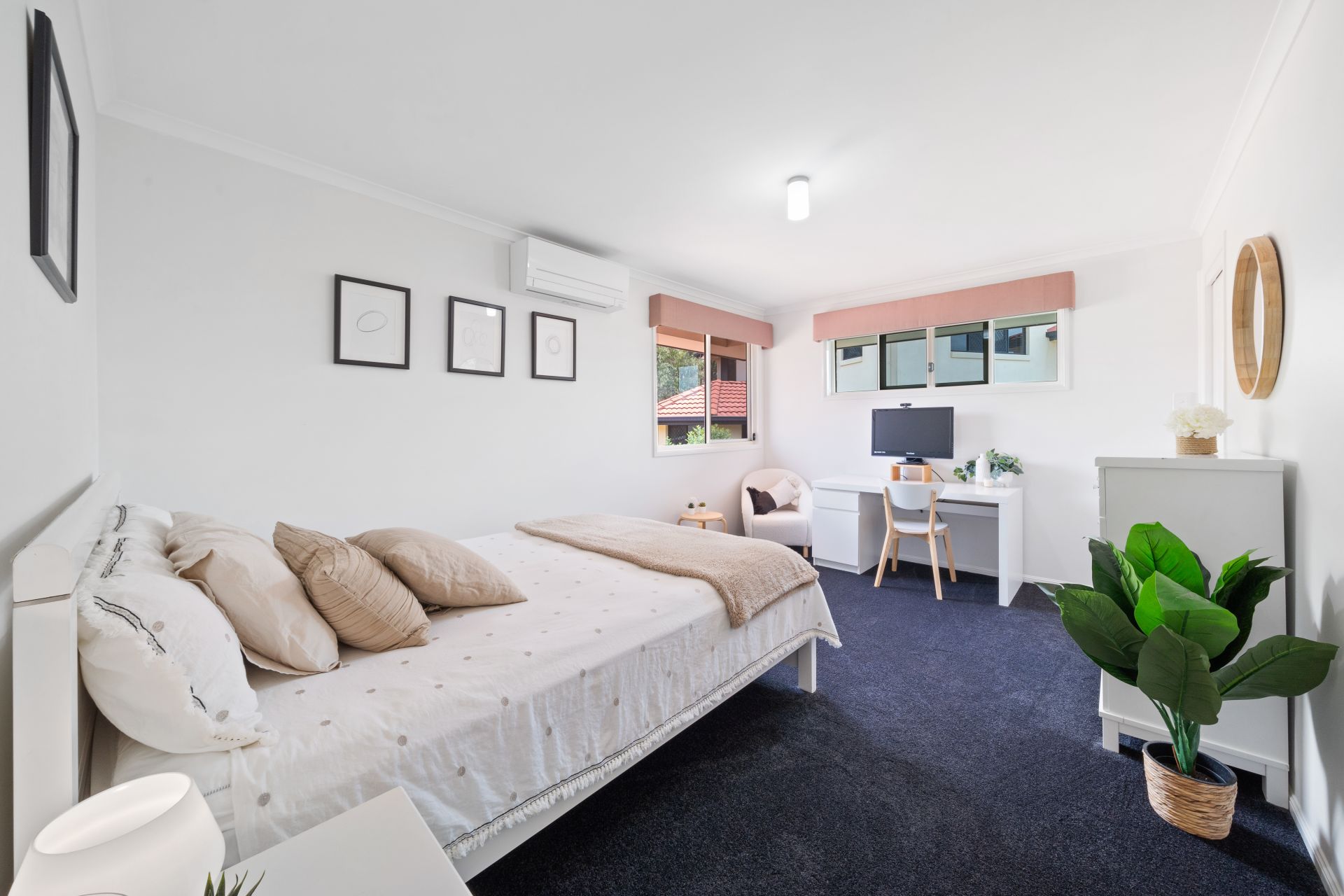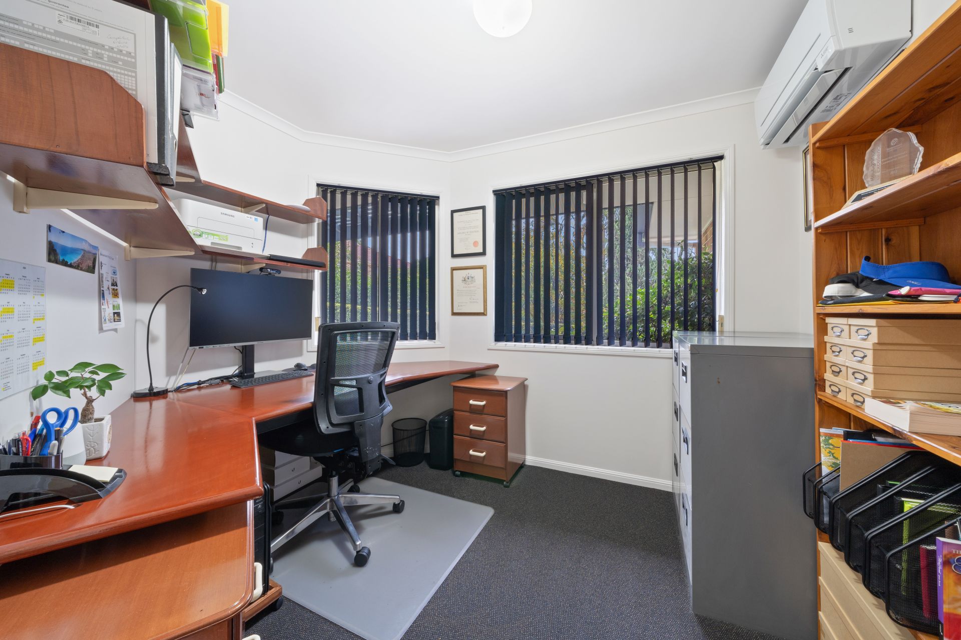 > Located at the front of the property is the home office, boasting air-conditioning, custom desk, carpet flooring, sliding window with security screens, and vertical blinds.