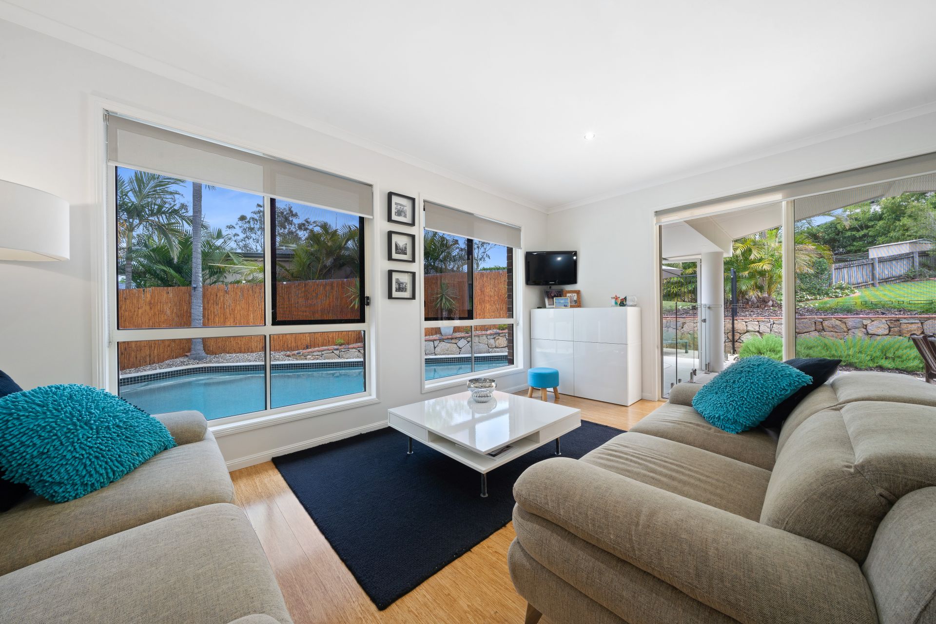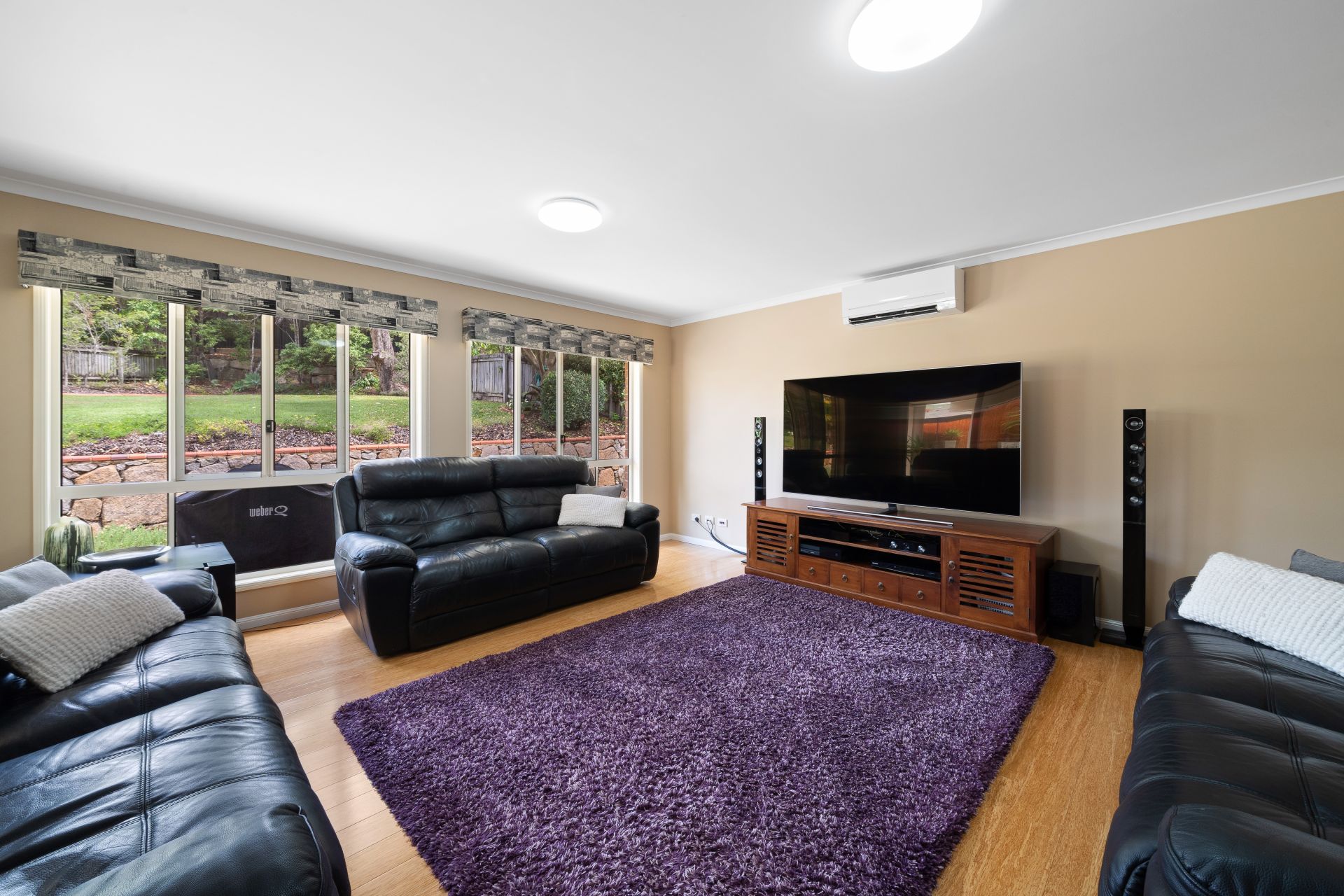 > Located at the rear of the property is the rumpus room, featuring bamboo timber flooring, air-conditioning, roller blinds, sliding windows and doors with security screens, giving you access to the outdoor entertaining area.
