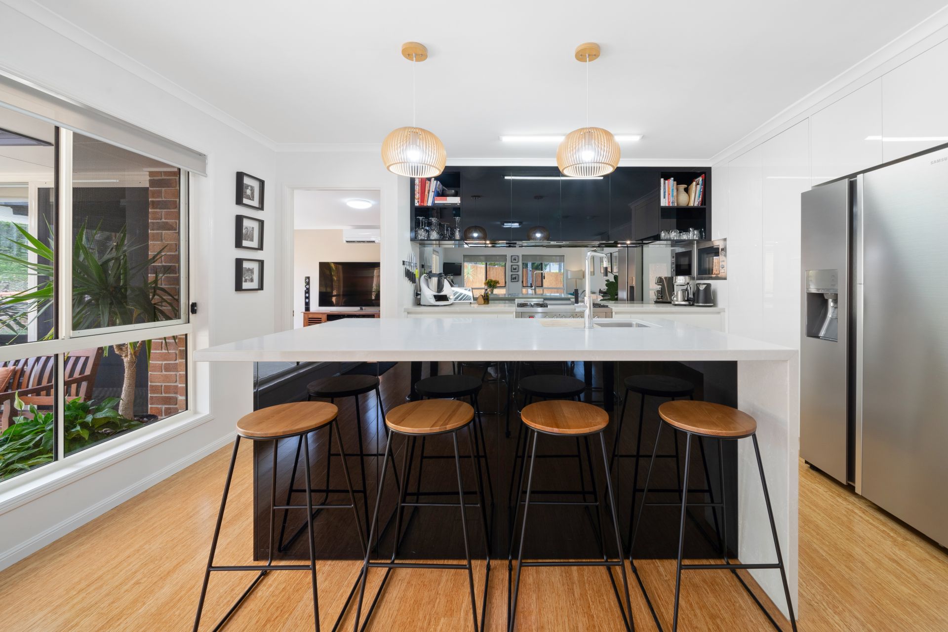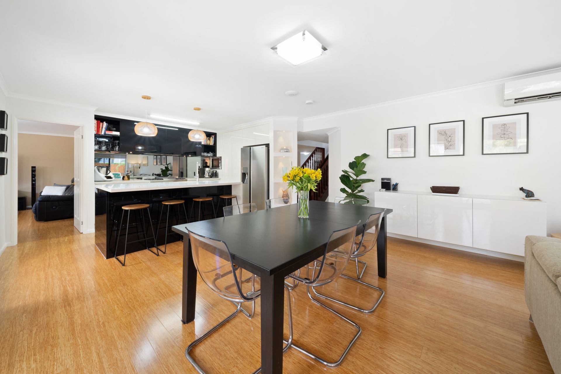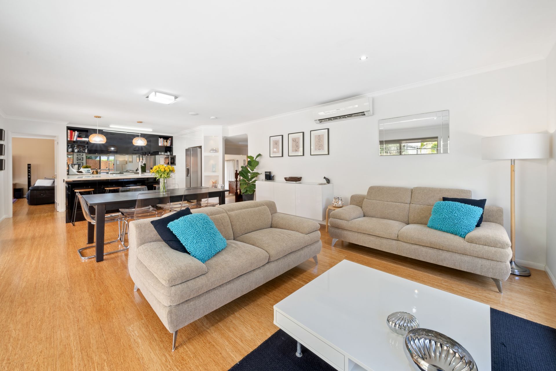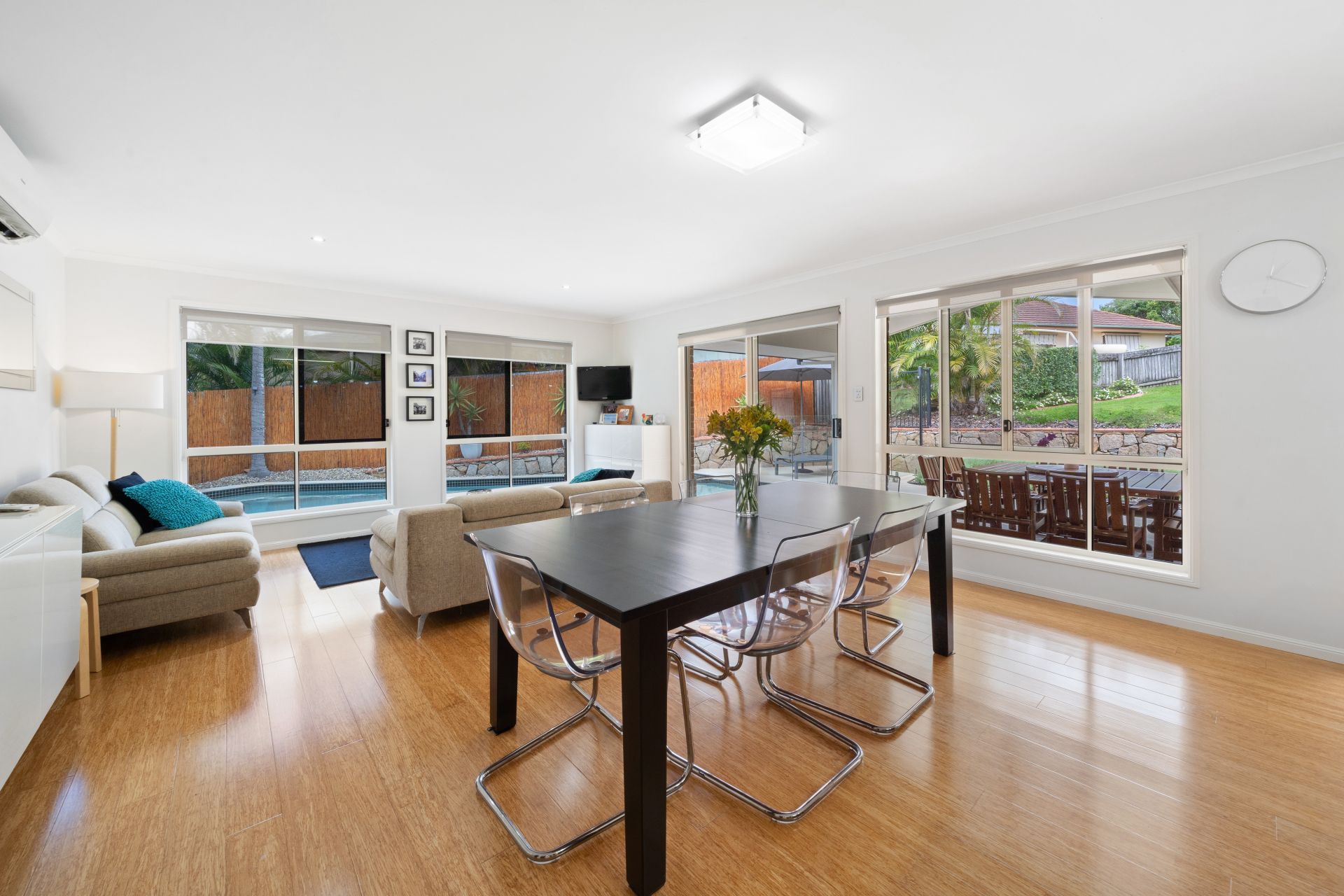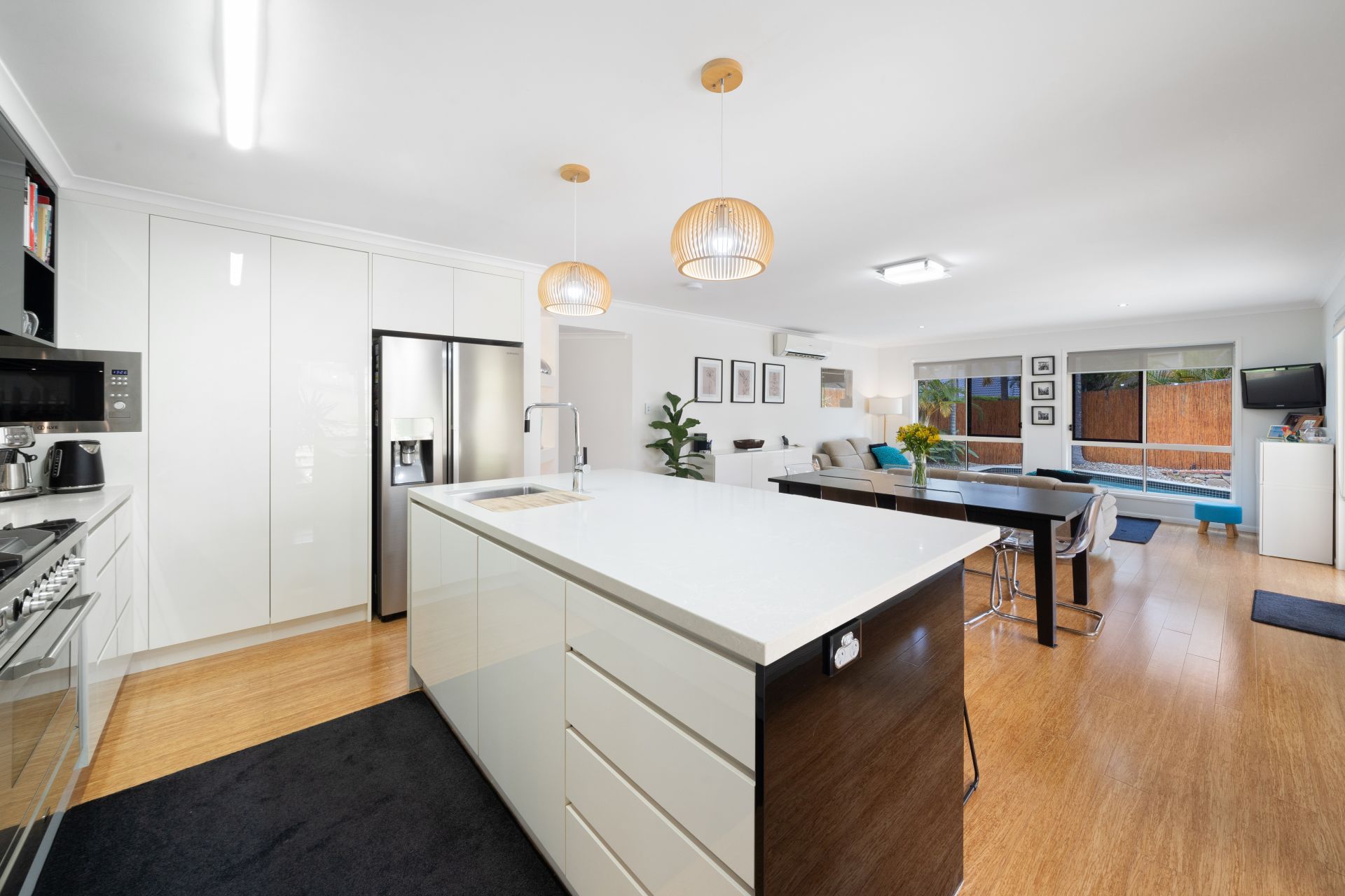 > The open-plan main living/dining areas, located at the back of the home, flow effortlessly to the kitchen and through to the outdoor entertaining area. The light and contemporary colour scheme adds to the expansive nature of the home, featuring air-conditioning, bamboo timber flooring, roller blinds, custom built-in cabinetry, sliding windows with security screens, and large glass sliding doors allowing access to the outdoor entertaining with security mesh.