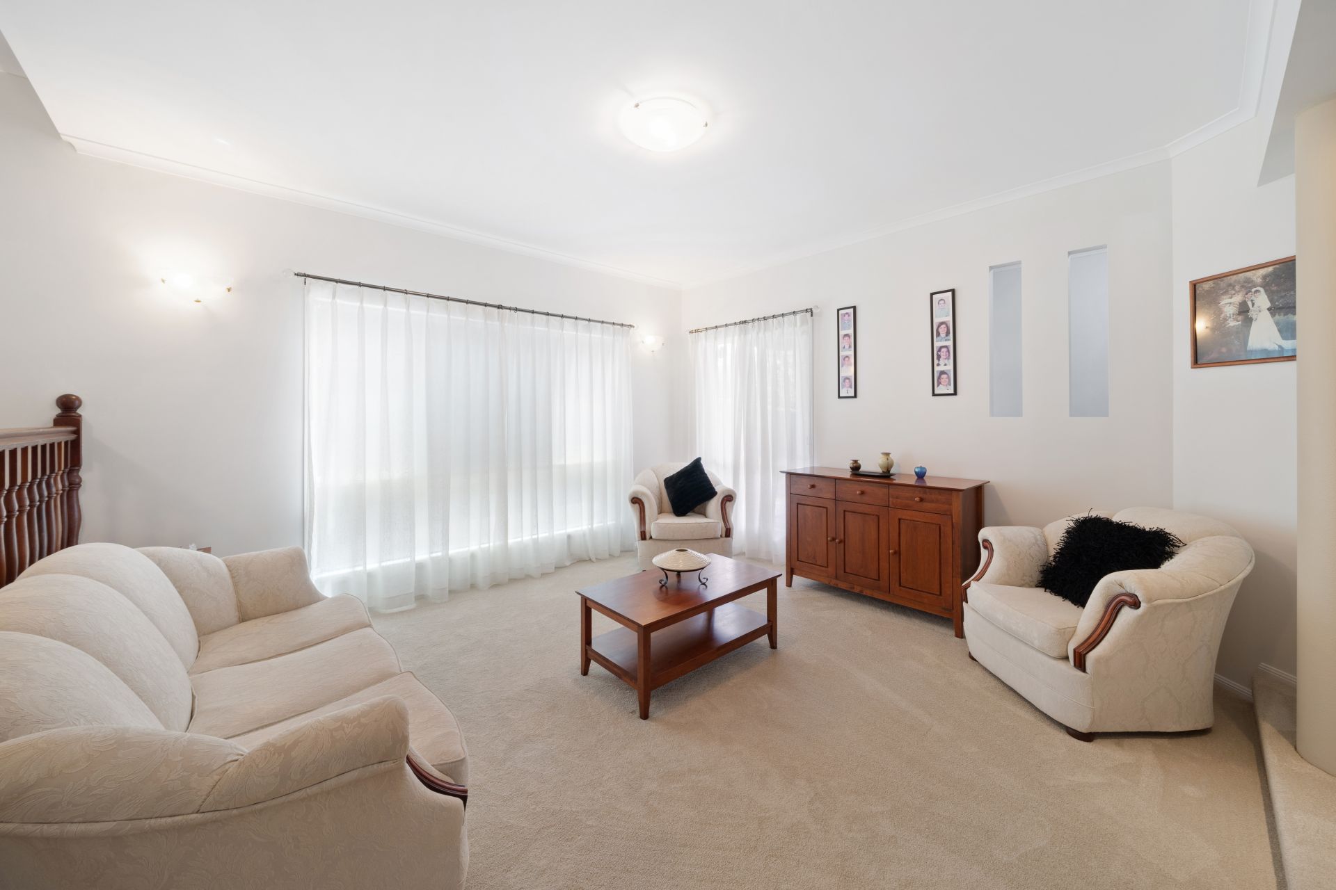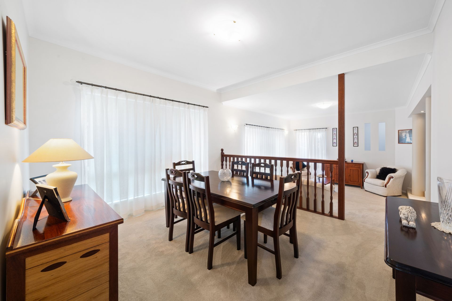 > The formal lounge/dining area, located off the entry of the property, features carpet flooring, sliding windows with security screens, curtains, oyster lighting, and sconce lighting.
