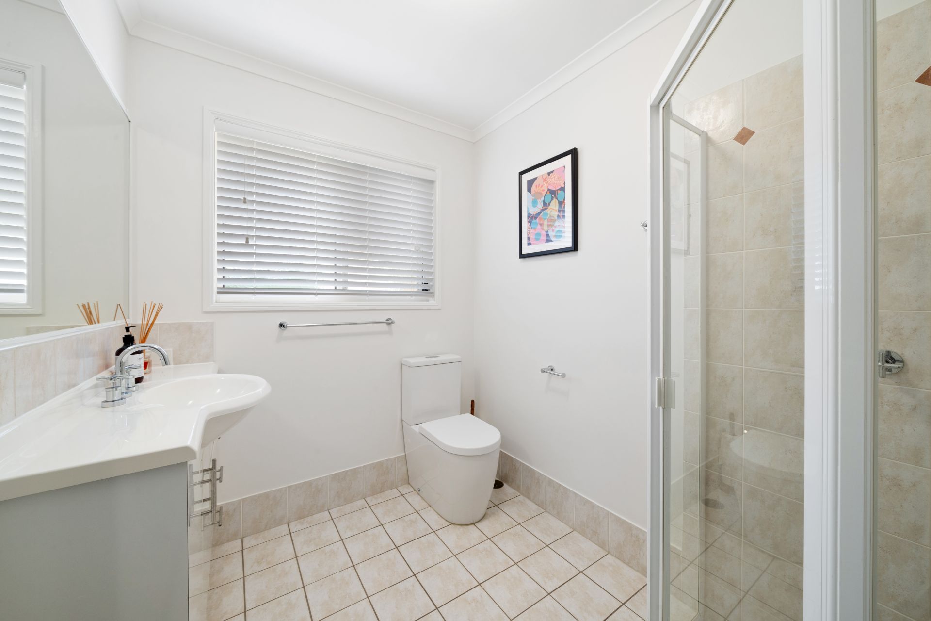 > Located on the top level is the main bathroom, featuring sperate bath configuration, shower, single basin vanity with plenty of storage, large vanity mirror, vanity lighting, towel rails, hand towel rail. sliding window, security screen, venetian blind, heat/light/extractor combo, and separate toilet.
