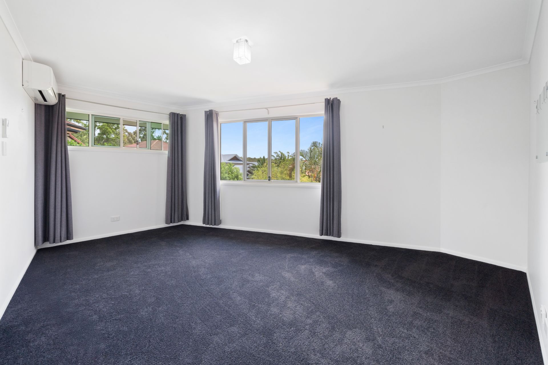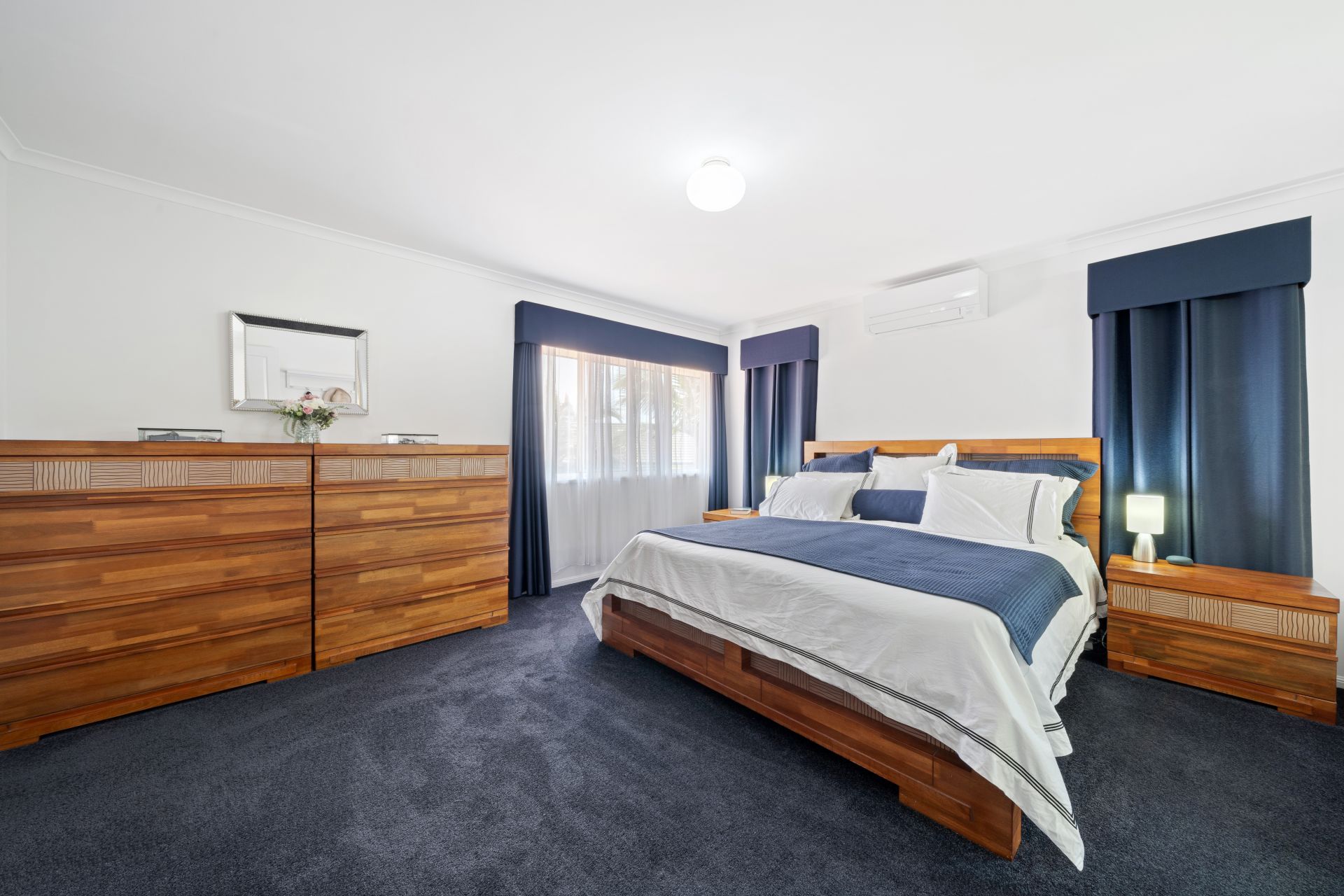 > The palatial master is perfect for those who enjoy their own space, air-conditioning, large walk-in robe, carpet flooring, standard lighting, sliding windows, security mesh, curtains and a well-appointed ensuite.