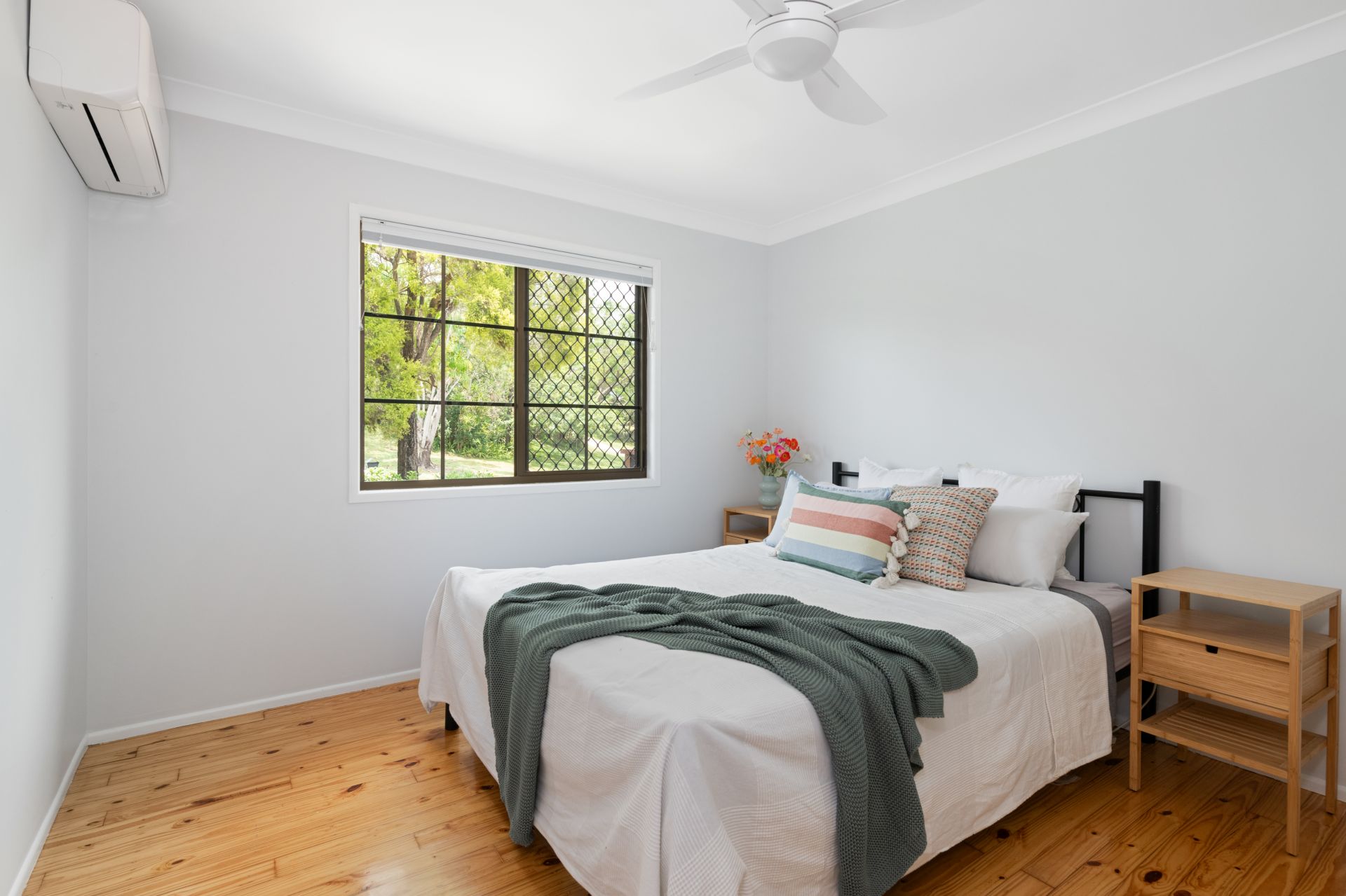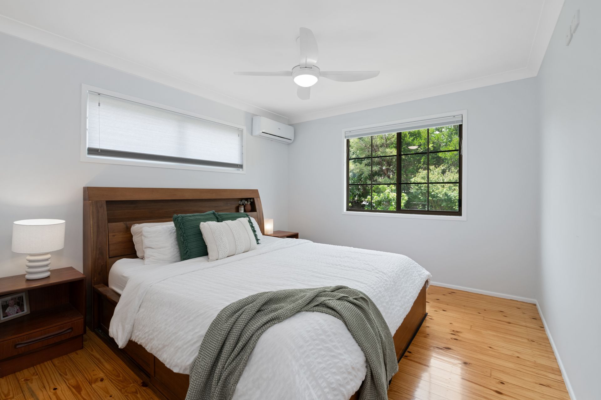 > Bedroom one is the home's master bedroom featuring polished timber flooring, split system air-conditioning, ceiling fan, built-in-robe and Night & Day Honeycomb blinds.