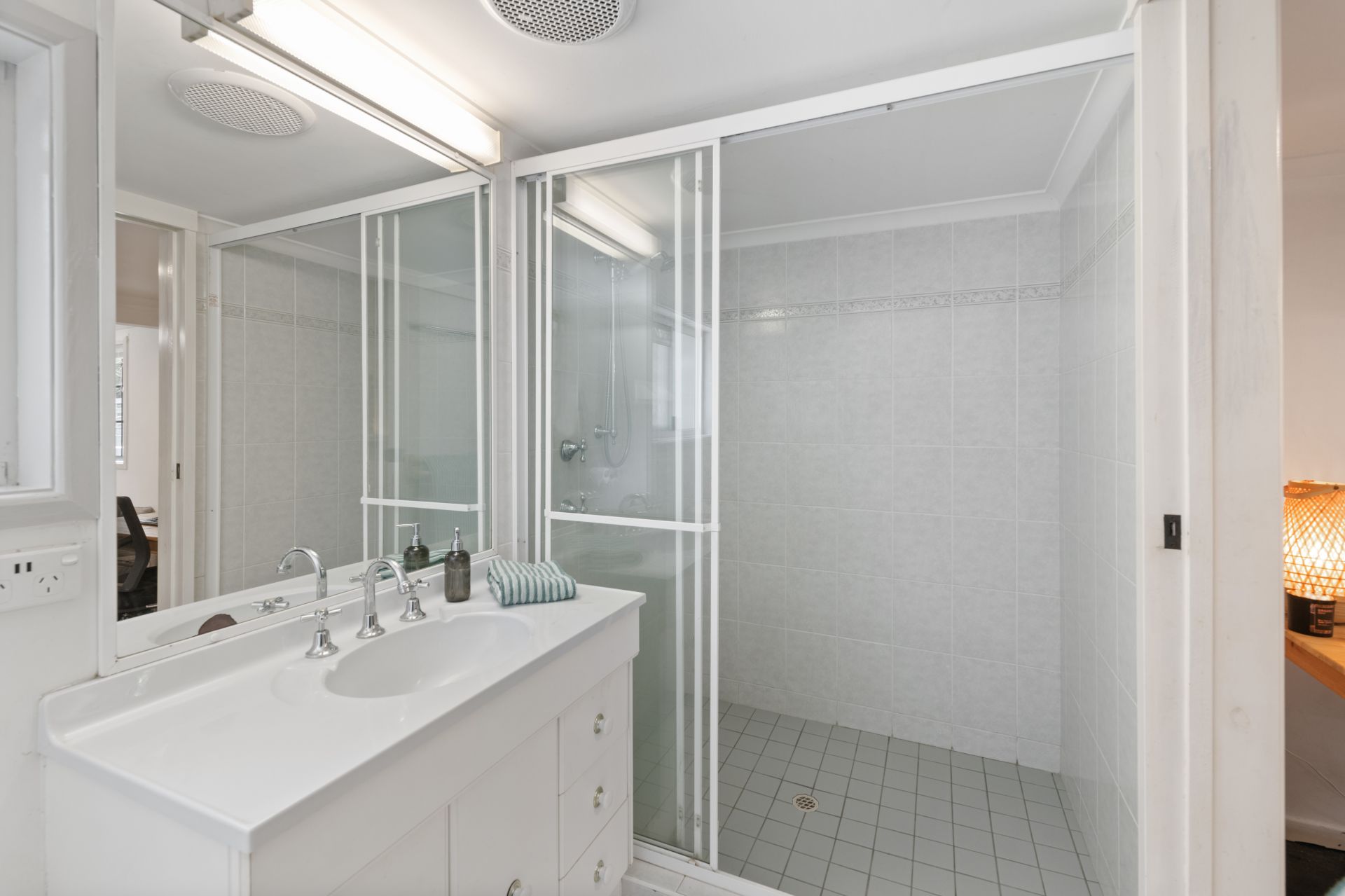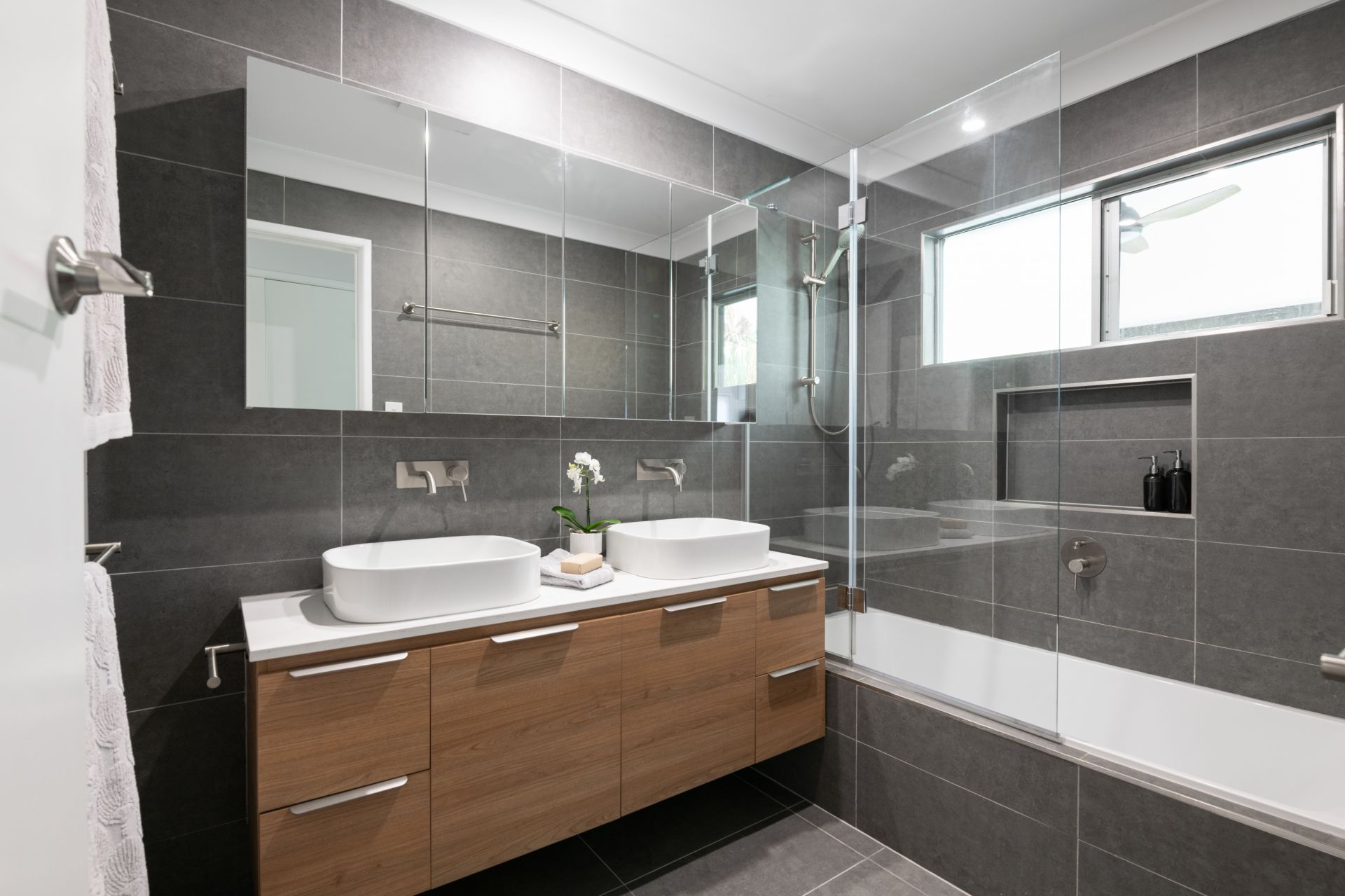 > Bathroom one is the home's beautifully renovated main bathroom boasting tiled flooring, floor-to-ceiling tiles, shower-over-bath combo with detachable showerhead and wall niche, double vanity with stone benchtop and soft-close cabinetry, large mirrored cabinet and separate toilet.
