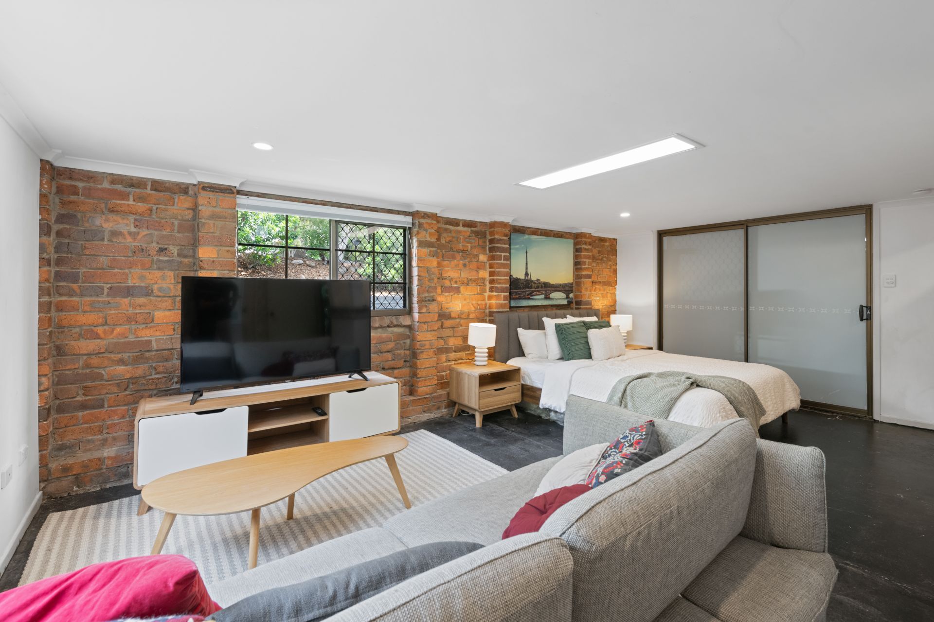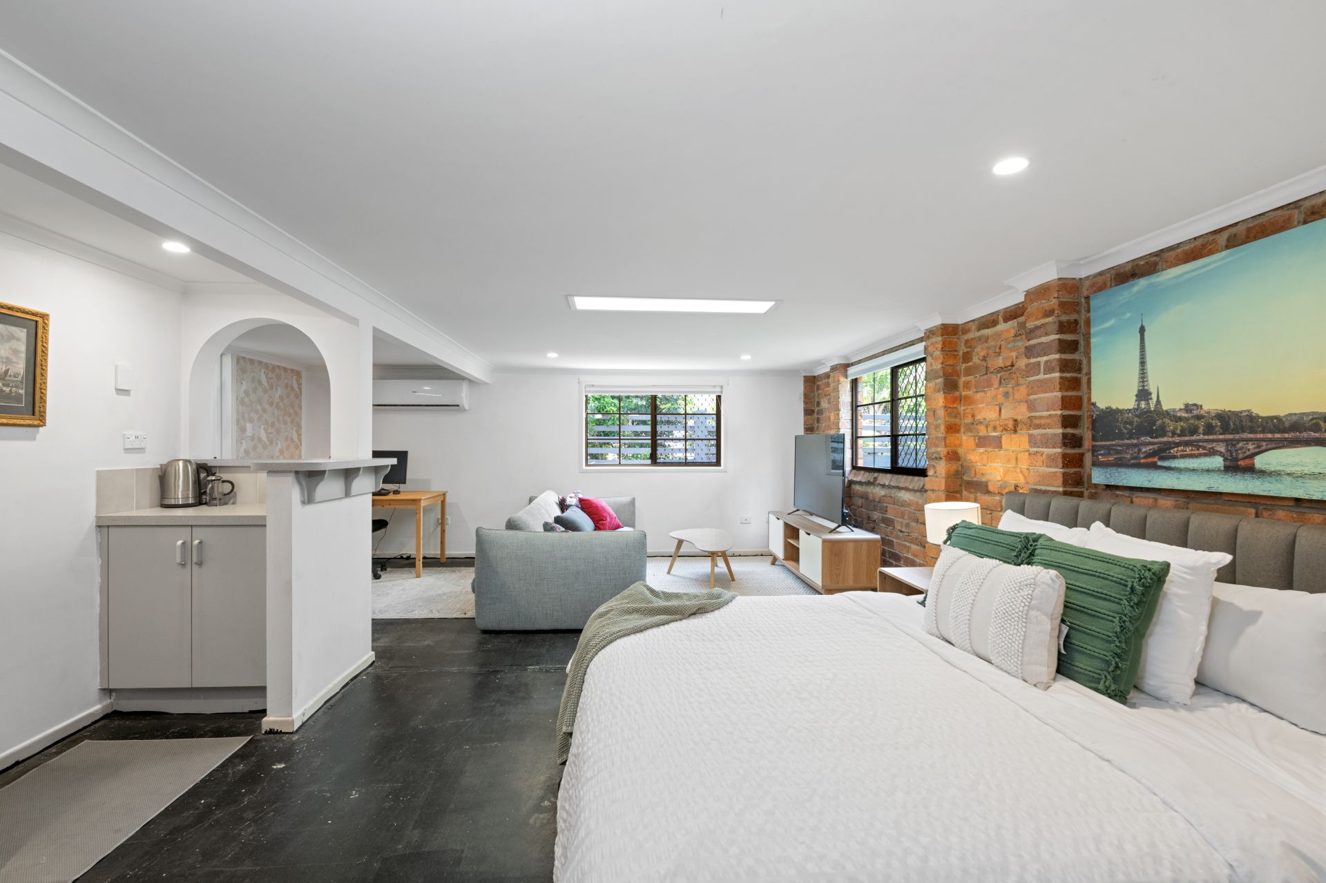 > Large Multipurpose room located downstairs, while being just shy of legal height, is ideal for dual purpose living. This great space features painted concrete flooring, split system air-conditioning, bathroom and kitchenette area with ample room for a full-sized fridge.