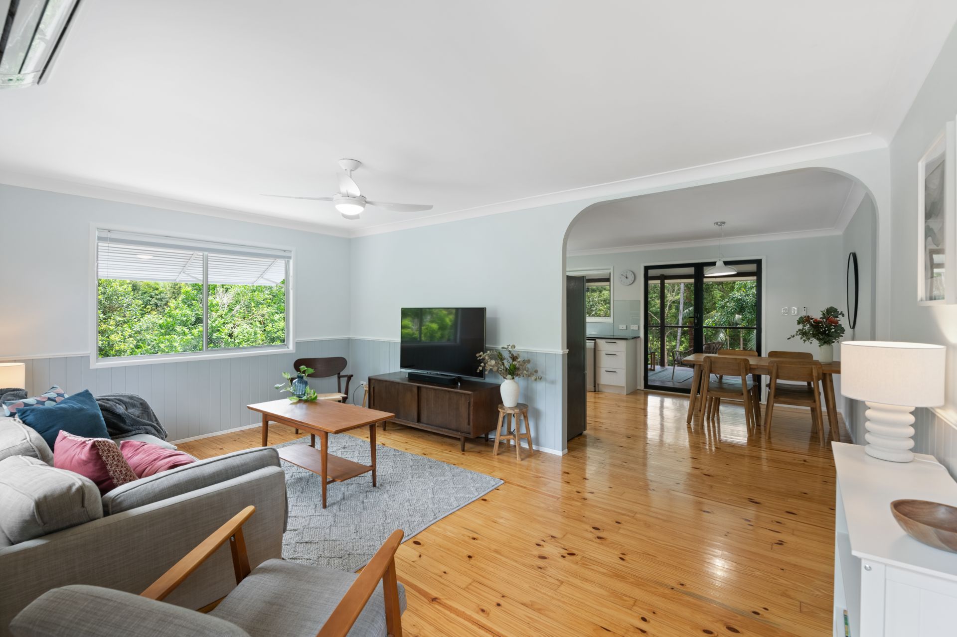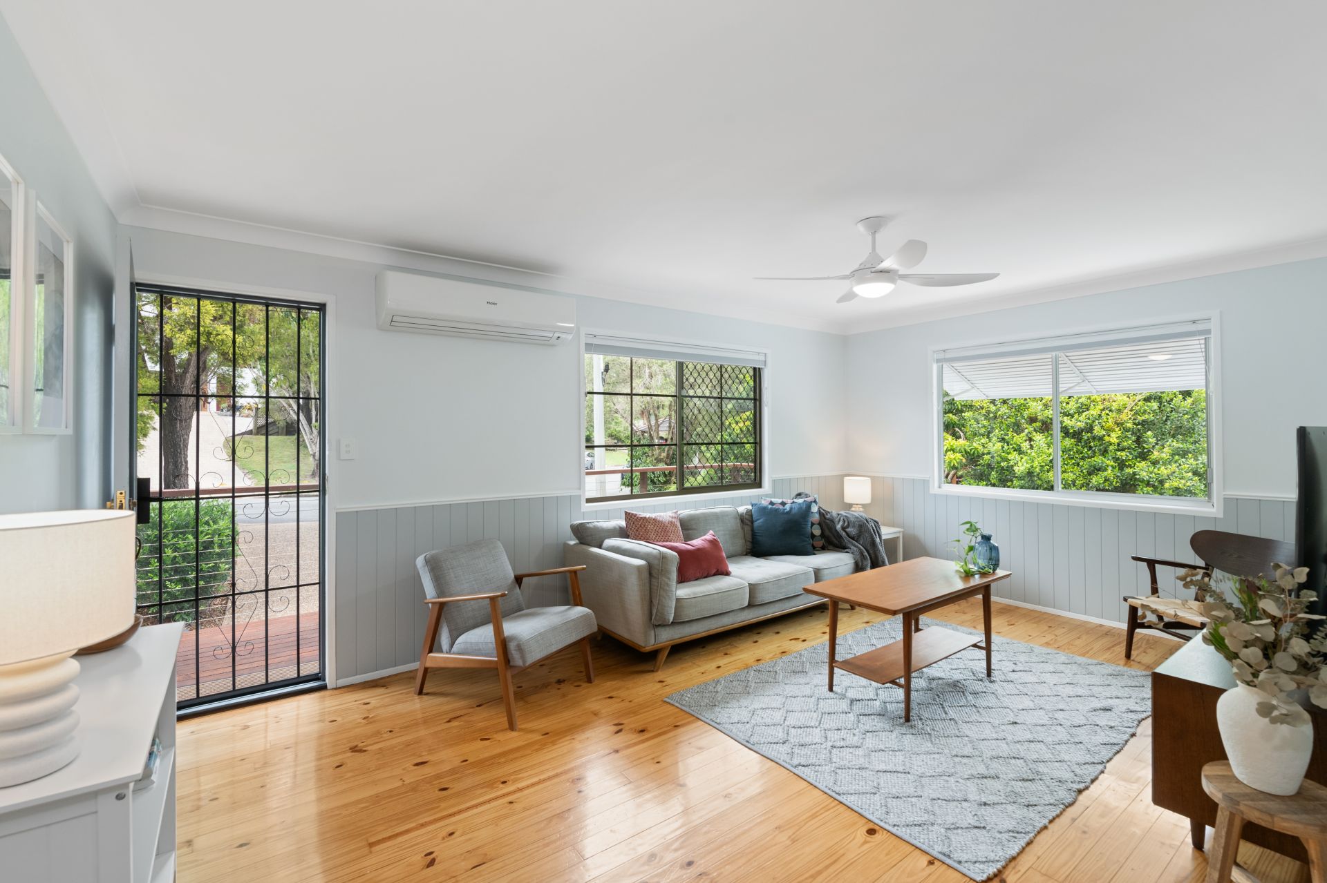 > The Home's living room at the front of the home features polished timber flooring, split system air-conditioning, ceiling fan, VJ panelling and Day & Night Honeycomb blinds.