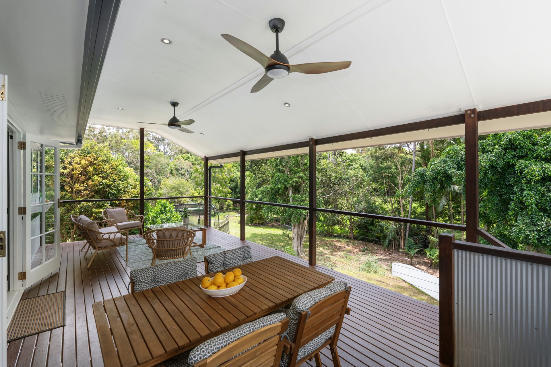 > The large, covered entertainers deck at the rear of the home flows out from the Kitchen and Meals area and overlooks the spacious back yard and private bushland beyond. It features timber decking, ceiling fans, lighting, breakfast bar with seating x3, outdoor power points and storage locker.