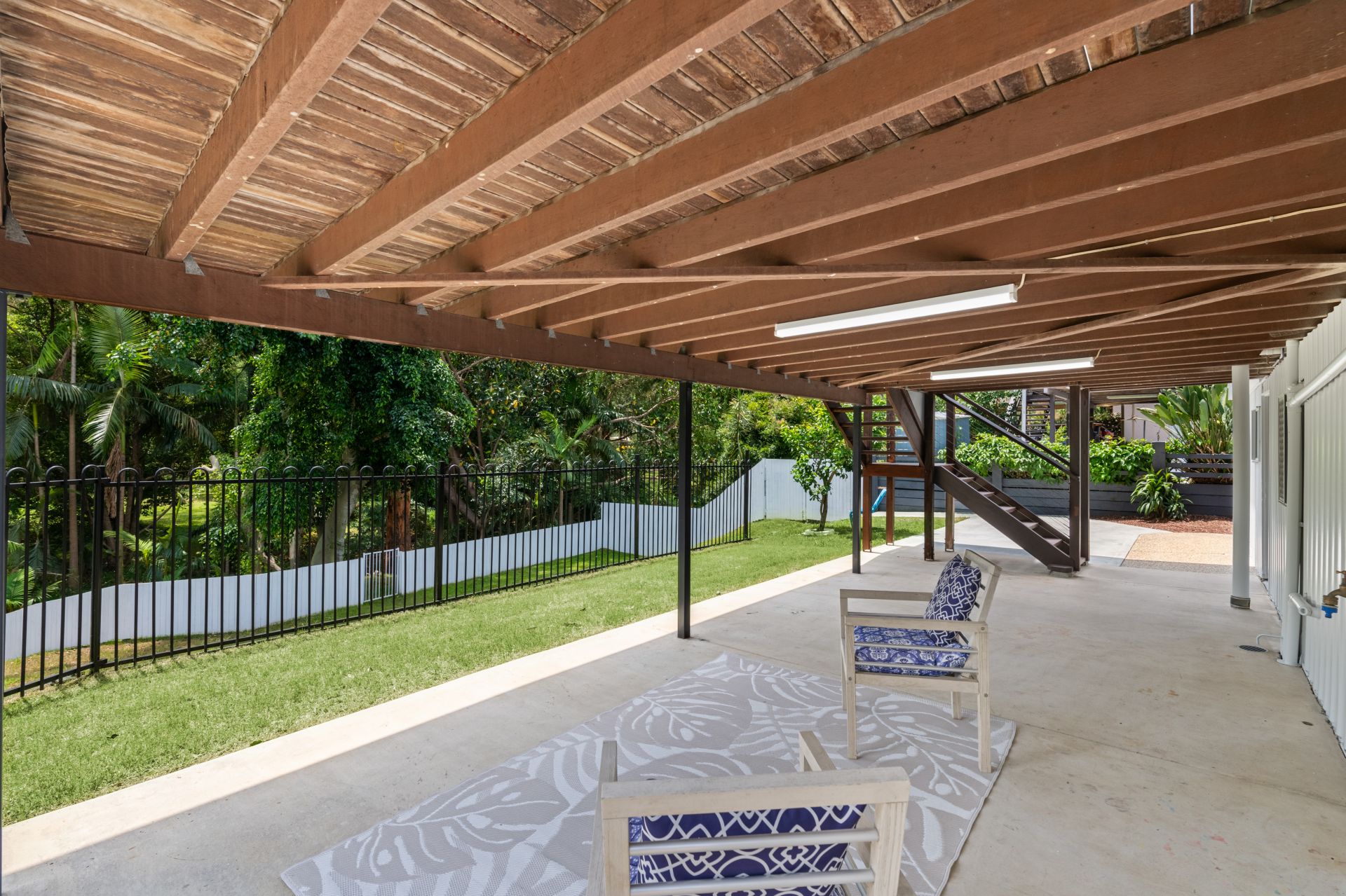 > Spacious, covered patio under the rear deck provide additional outdoor living space with new LED lighting and outdoor power.