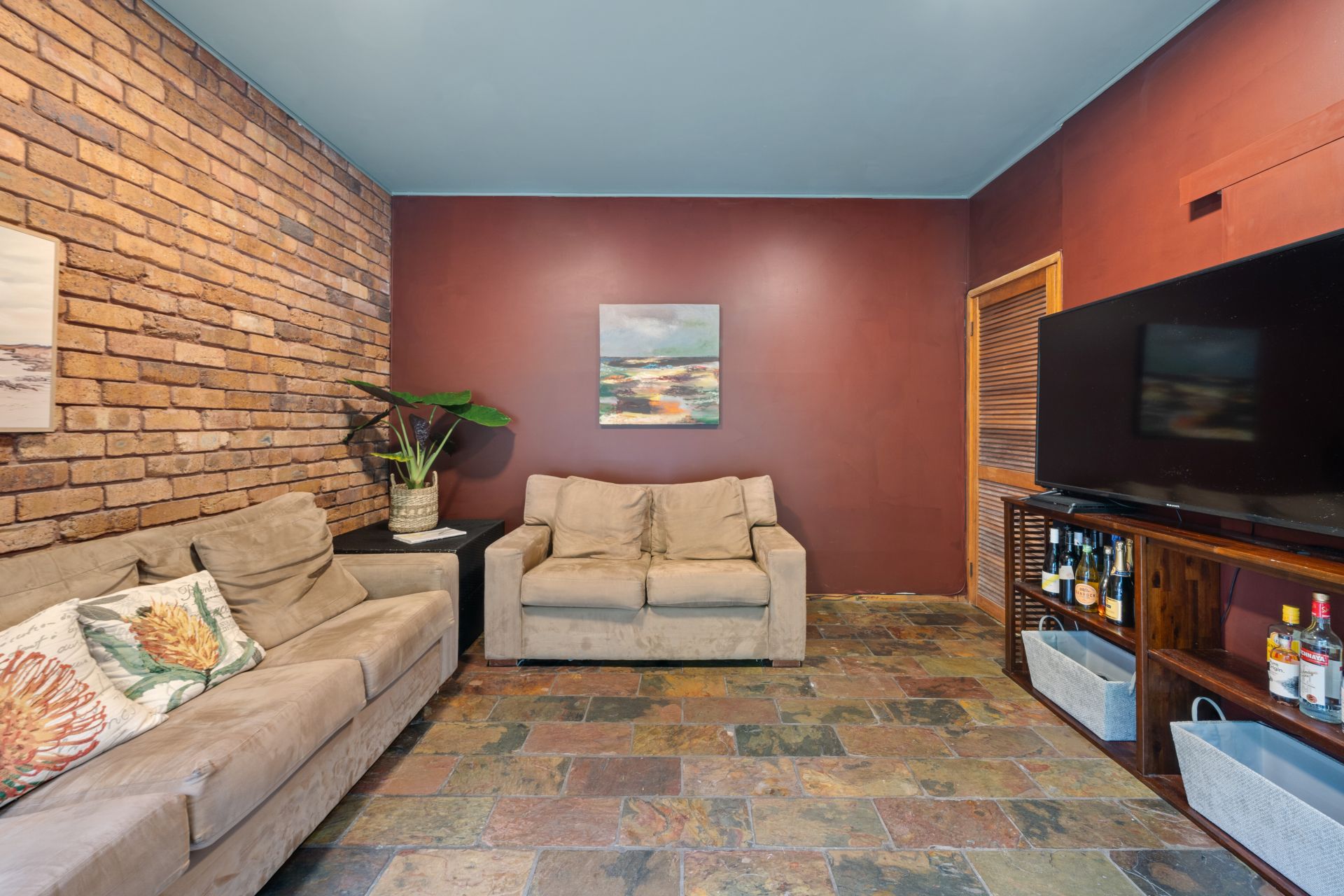 > Located on the middle level, the family room features air conditioning, tiled flooring, a storage cupboard, and sliding doors providing access to the rear outdoor entertaining area.