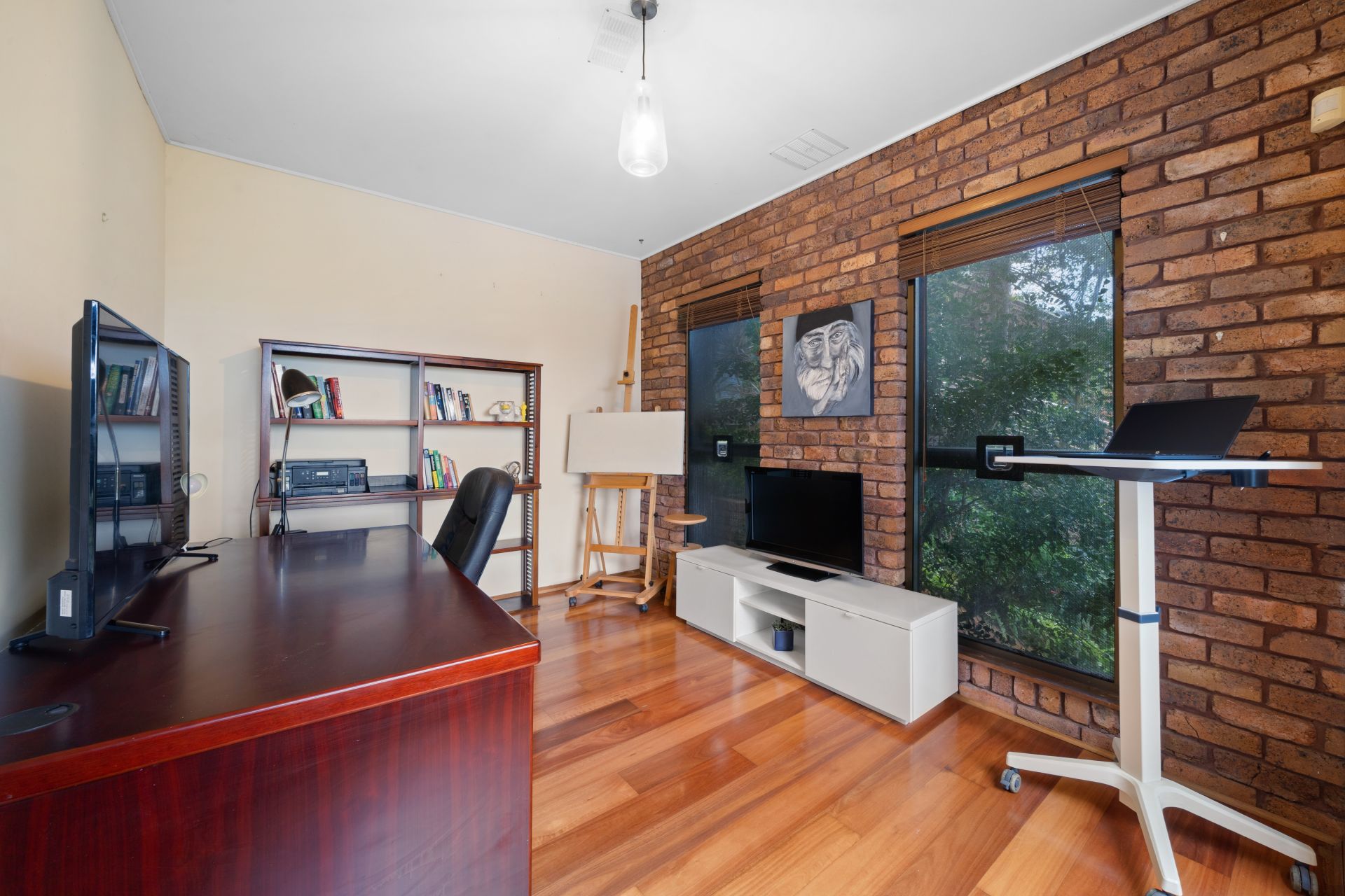 > Located on the entry level, the home office/study features rich timber flooring, pendant lighting, awning and sliding windows, and security screens.