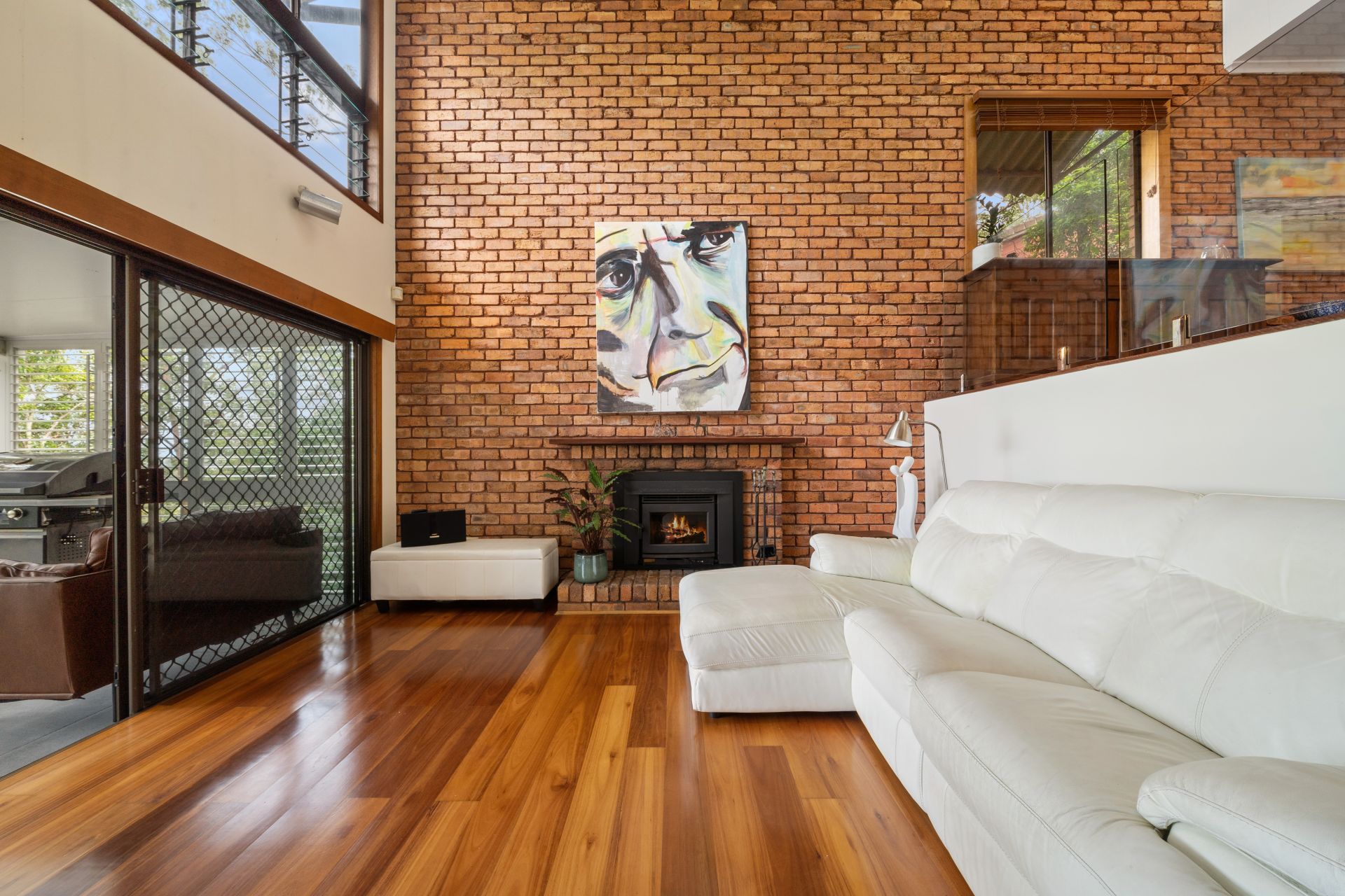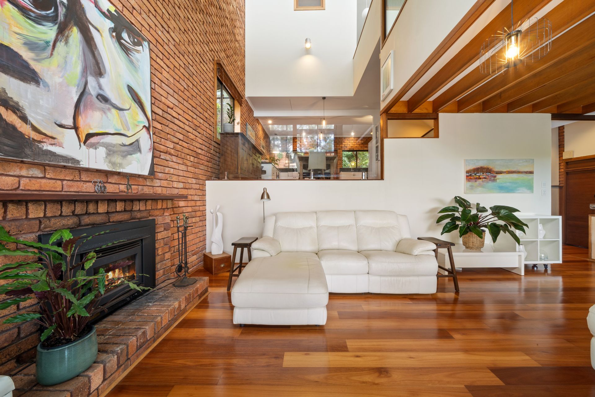 > The open-plan main living area, located on the entry level, flows through to the outdoor entertaining area. The light and contemporary colour scheme adds to the expansive nature of the home, boasting 5.9m high ceilings, fire place, pendant and gallery-lighting, rich timber flooring, louver windows and sliding doors with security screens.