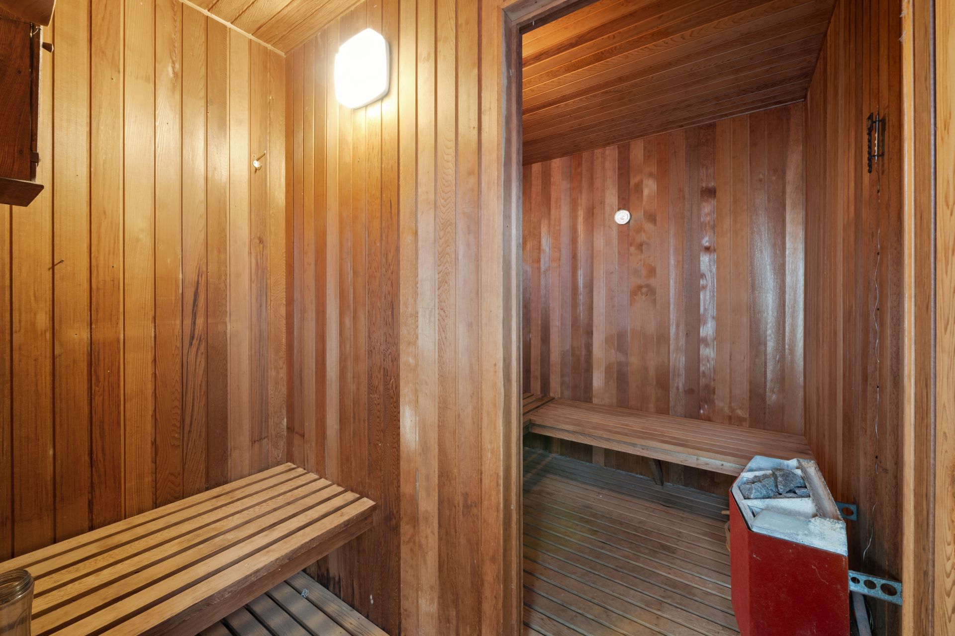 > Pool house features a custom bar, powder room, shower, and large sauna.