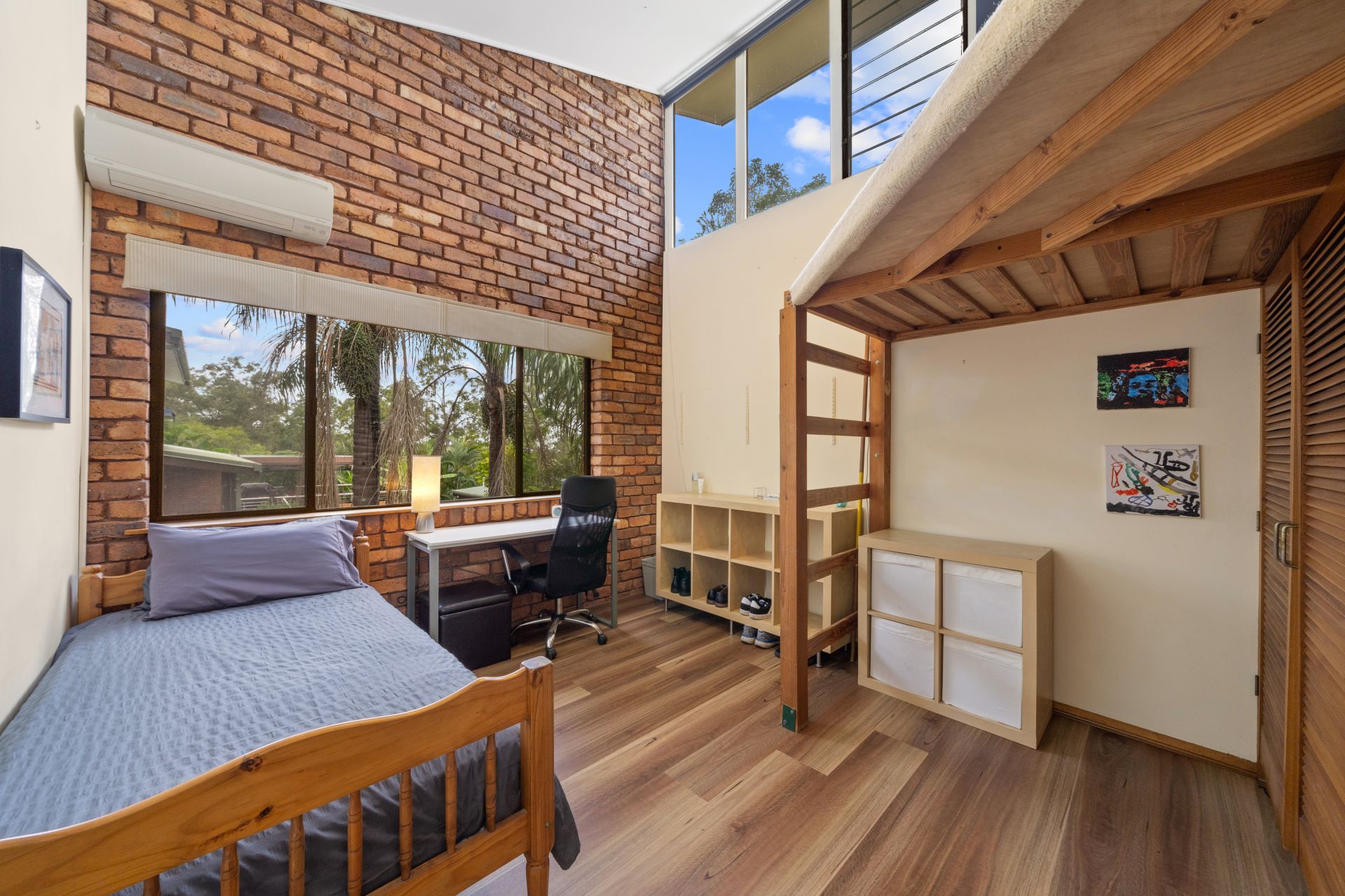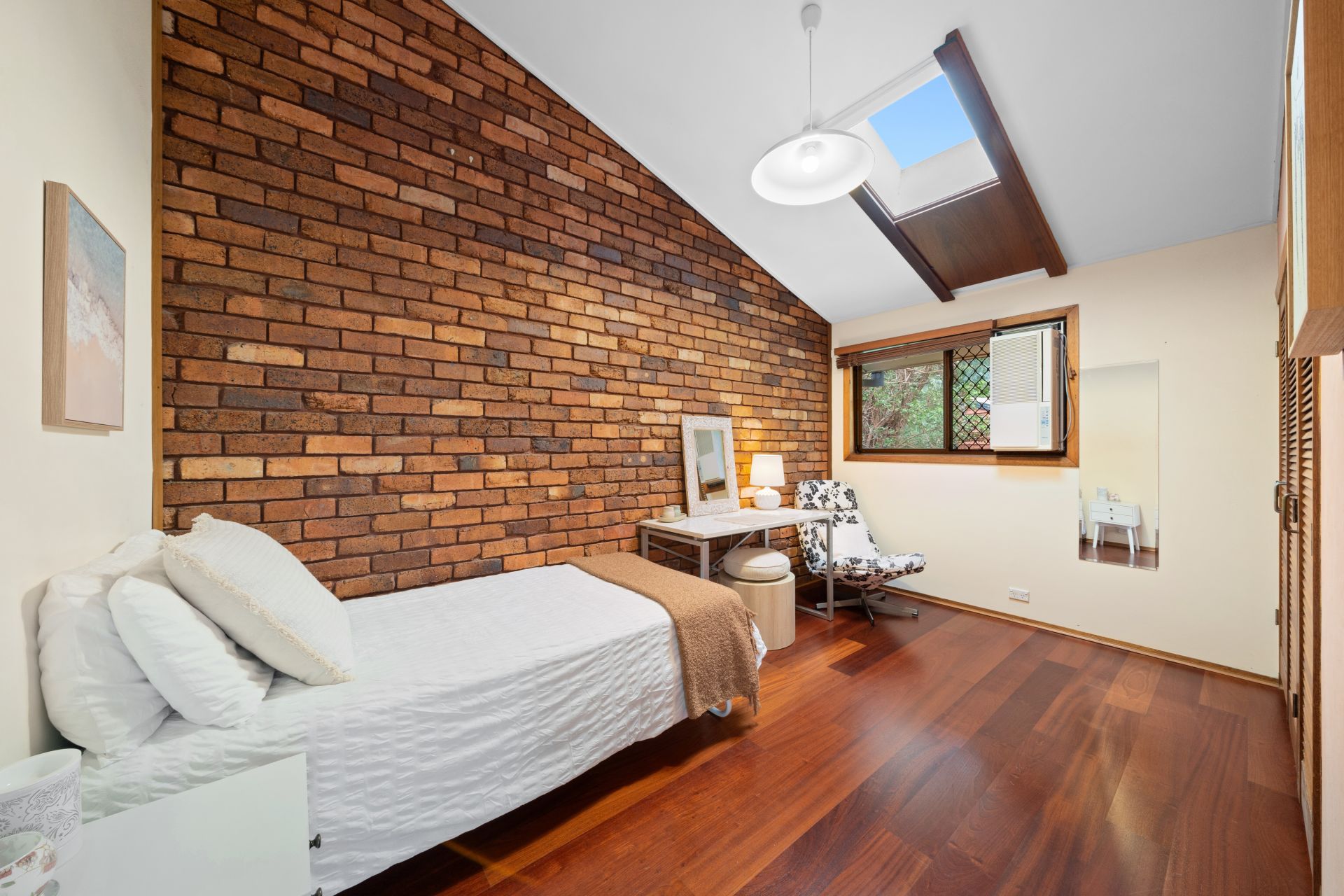 > Bedroom 4, located on the top level, features extra high-pitched ceiling, air conditioning, built-in robe, rich timber flooring, pendant-lighting, sliding windows, security screens, skylight and venetian blinds.