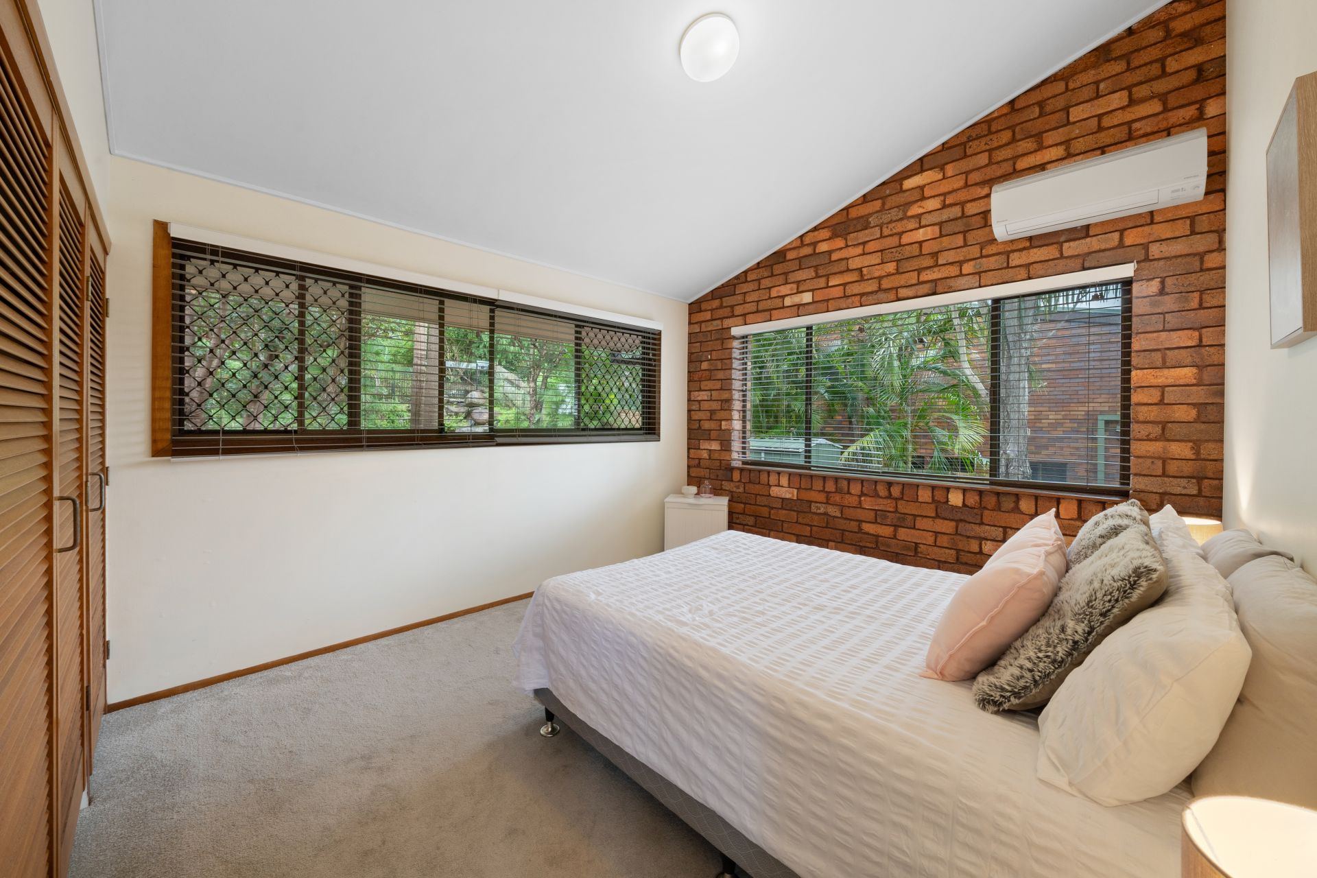 > Bedroom 2, located on the top level, features extra high-pitched ceiling, air conditioning, built-in robe, plush carpet flooring, oyster lighting, sliding windows, security screens, and venetian blinds.