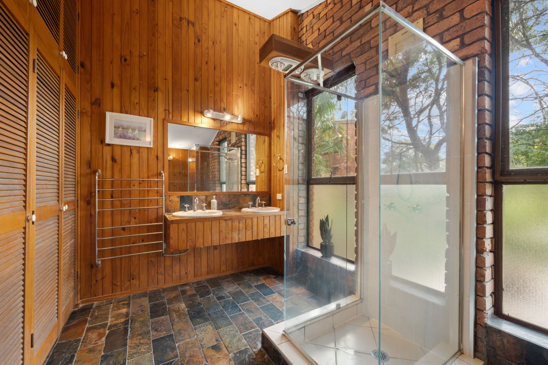 > The ensuite bathroom features a shower with detachable shower head, a dual-basin vanity with storage, a vanity mirror, heated towel rail, awning window, a heat/light/extractor combo, gallery lighting and a separate toilet.