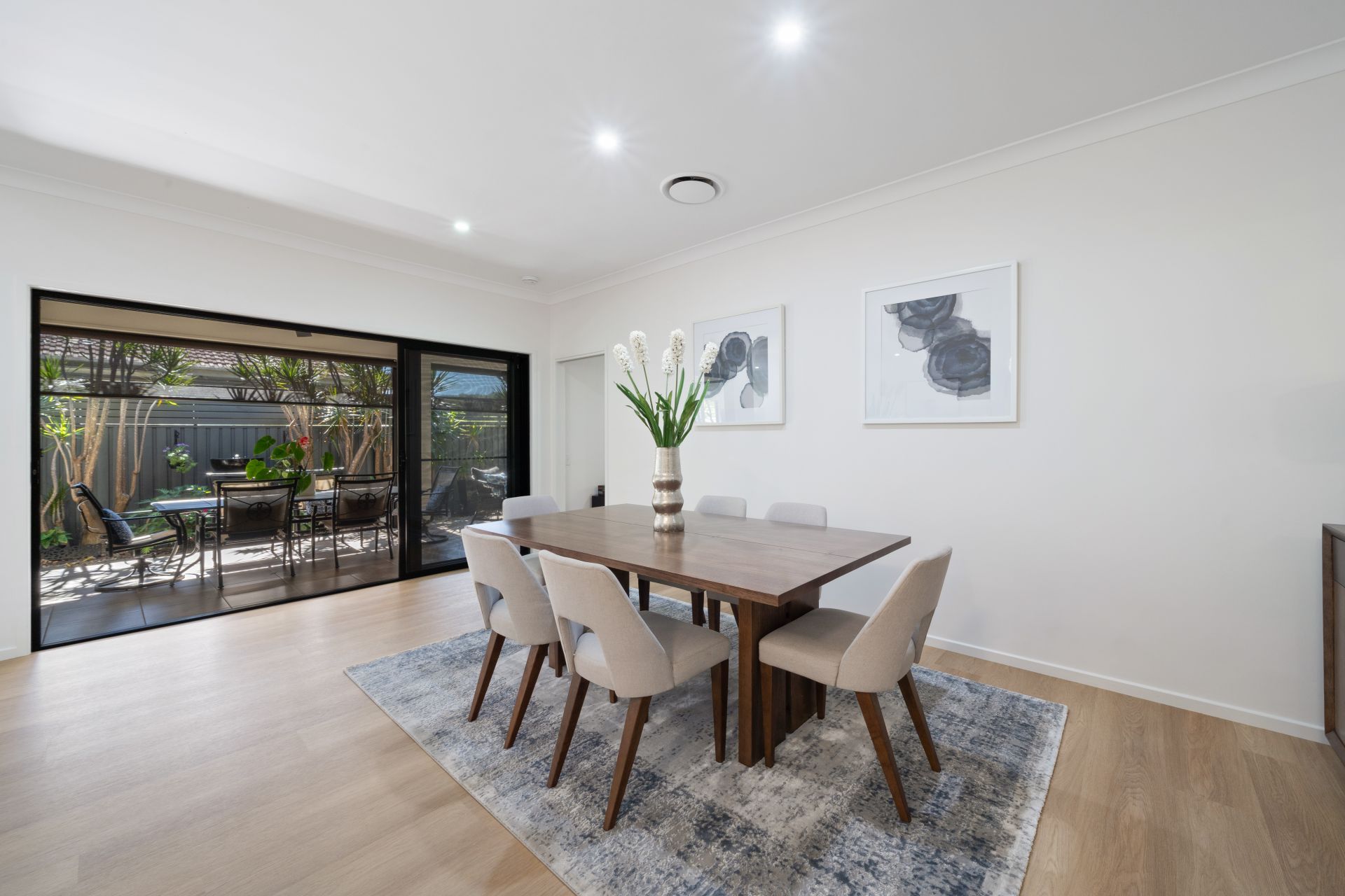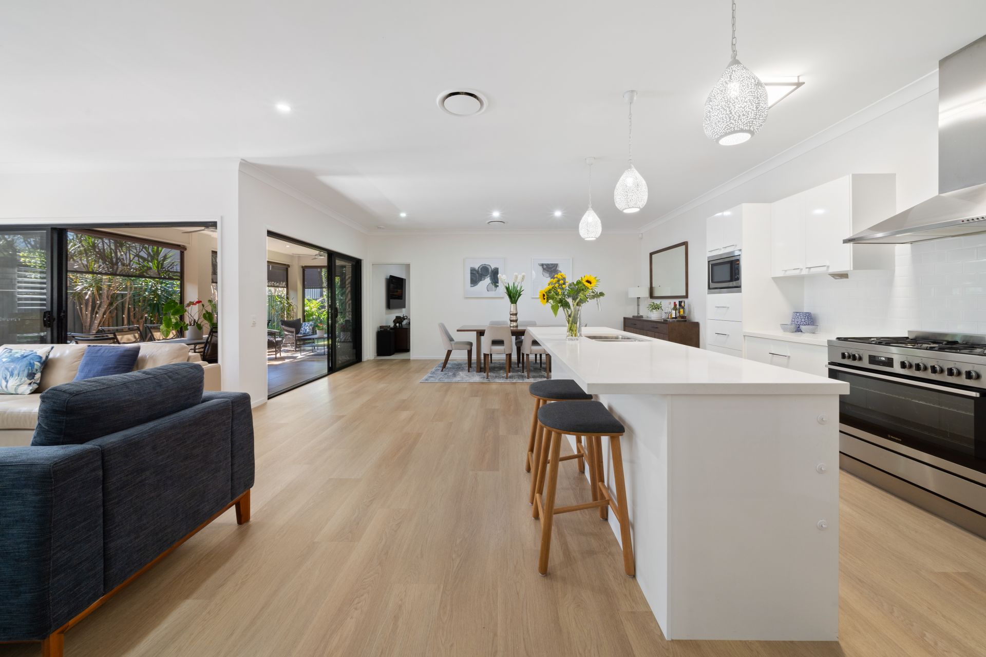 > The open-plan main living and dining areas, located at the heart of the home, flow seamlessly into the kitchen and extend to the outdoor entertaining area. The light and contemporary colour scheme enhances the spacious feel, featuring a ducted air conditioning, downlighting, durable vinyl timber look flooring, sliding windows with security screens, plantation shutters, and large glass doors providing access to the outdoor entertaining area.