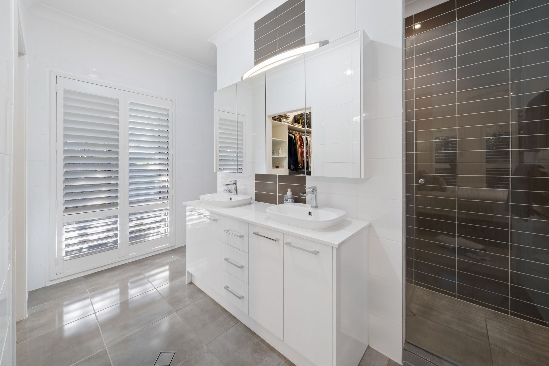 > The ensuite to the primary bedroom features a shower with detachable showerhead, a double-basin stone topped vanity with storage, floor-to-ceiling tiles, a wall-mounted vanity mirror cabinet, over-vanity lighting, an extractor/heat/light combo, towel rail, sliding windows with security screen, plantation shutters and toilet.