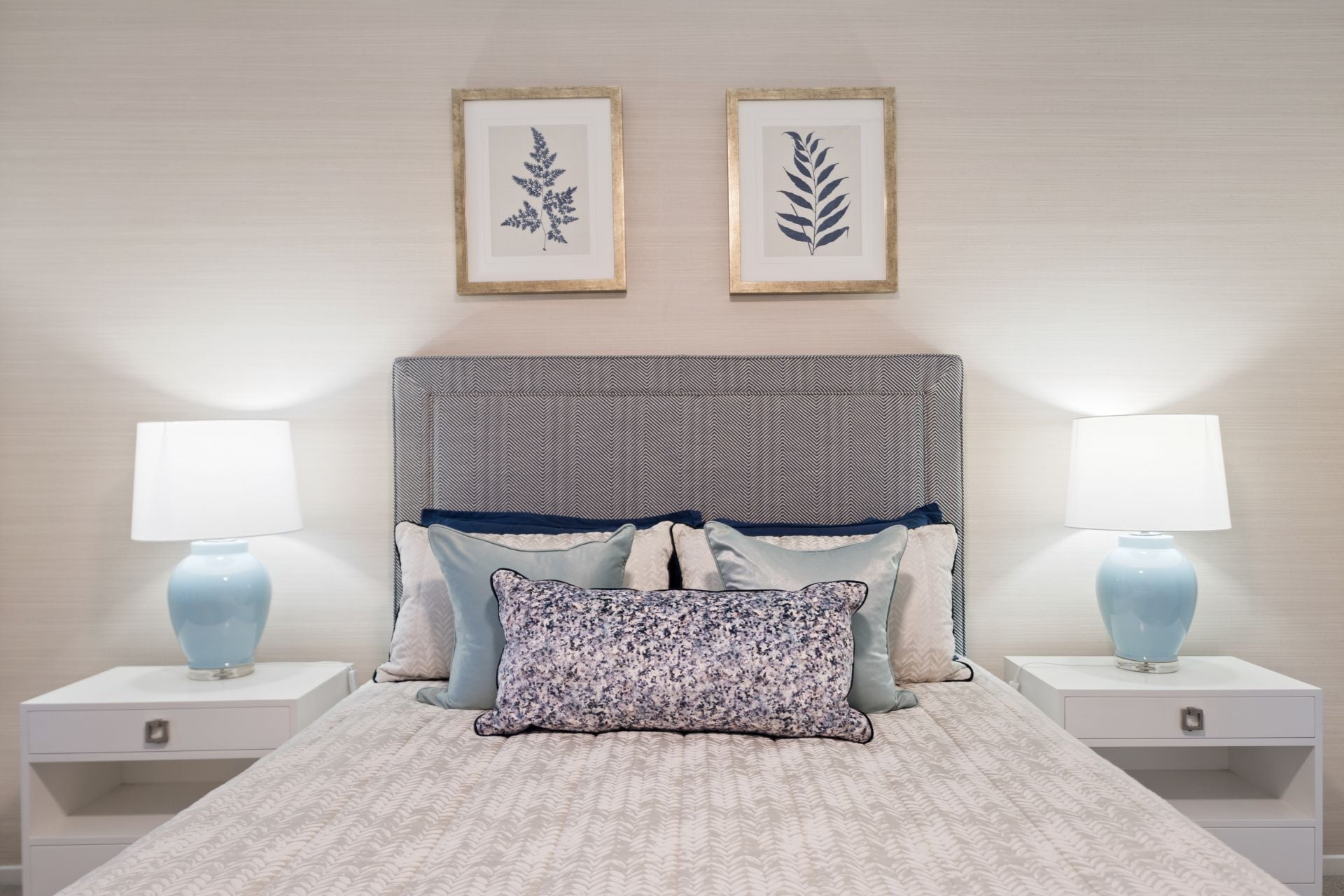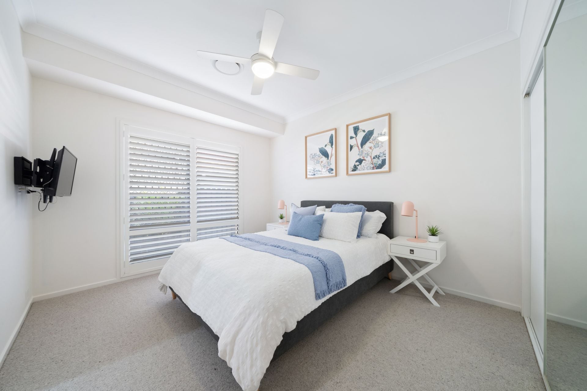 > Bedroom 2 features plush carpet, high ceilings, ducted air-conditioning, a built-in robe, a ceiling fan with lighting, sliding windows with security screens, plantation shutters and access to the 2-way bathroom.
