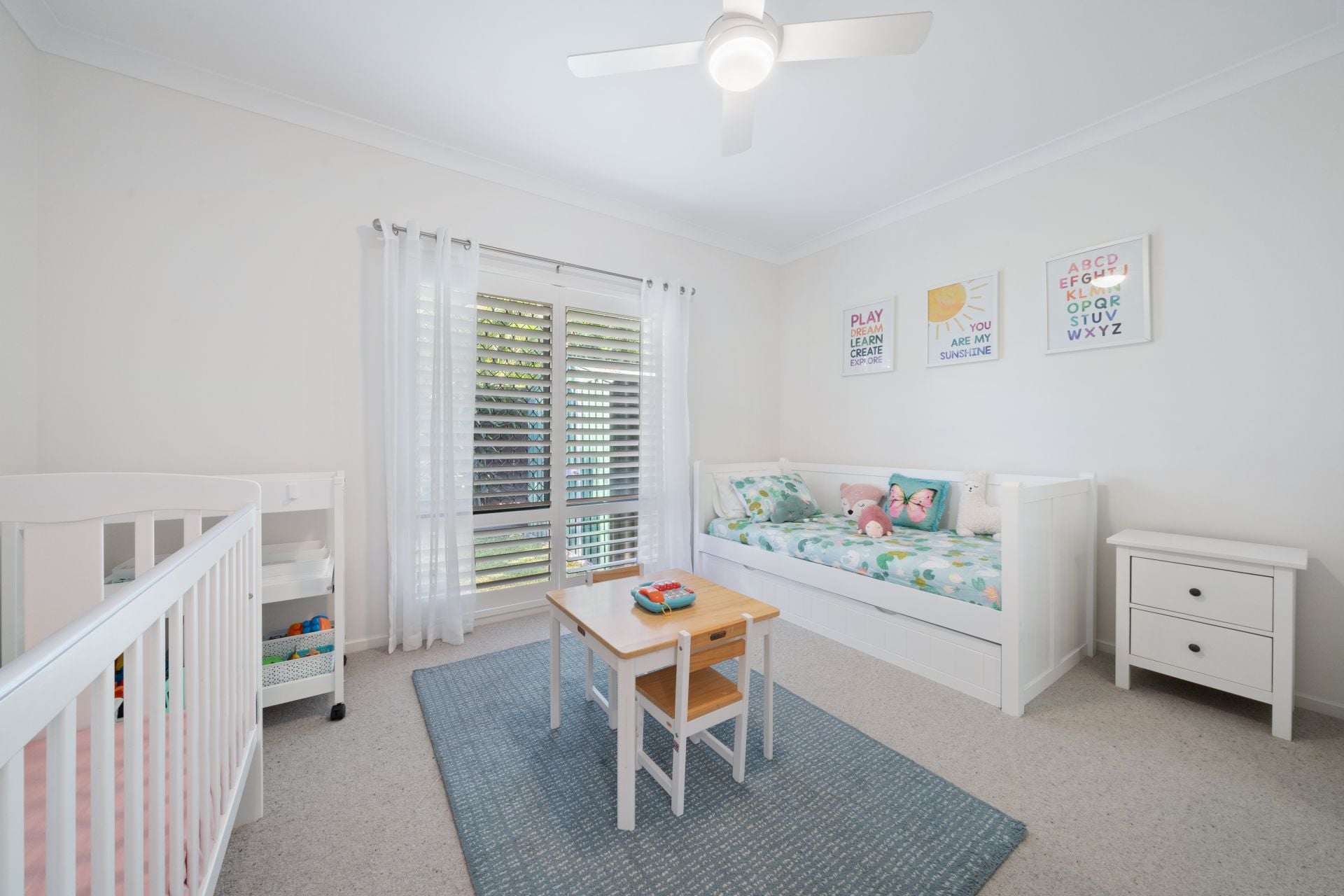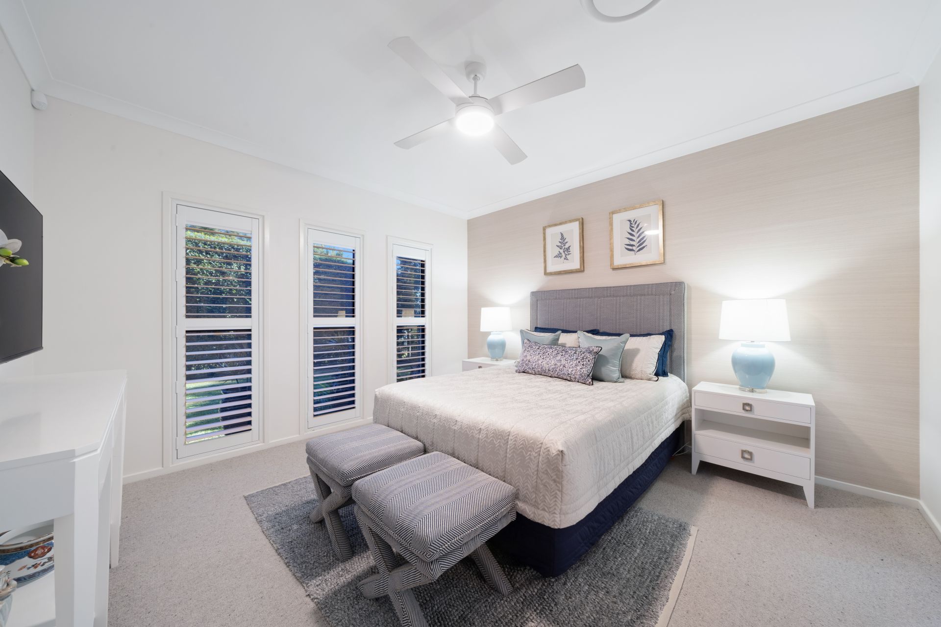 > Bedroom 3 features plush carpet, high ceilings, ducted air-conditioning, a built-in robe, a ceiling fan with lighting, sliding windows with security screens, plantation shutters and curtains.
