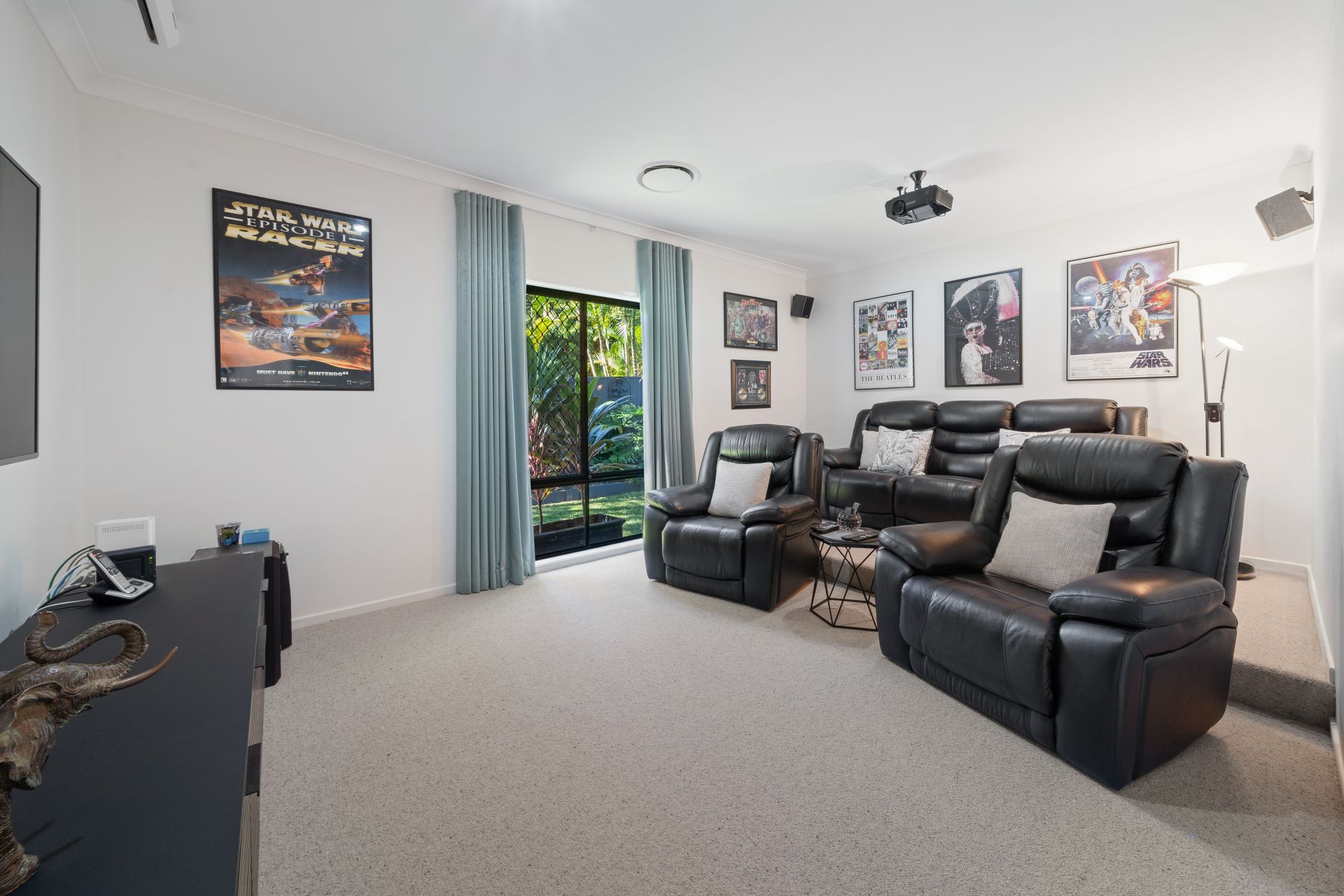 > Bedroom 4 currently being used as a media room, features plush carpet, high ceilings, ducted air-conditioning, down lighting, sliding windows with security screen, rolldown projector screen and projector.