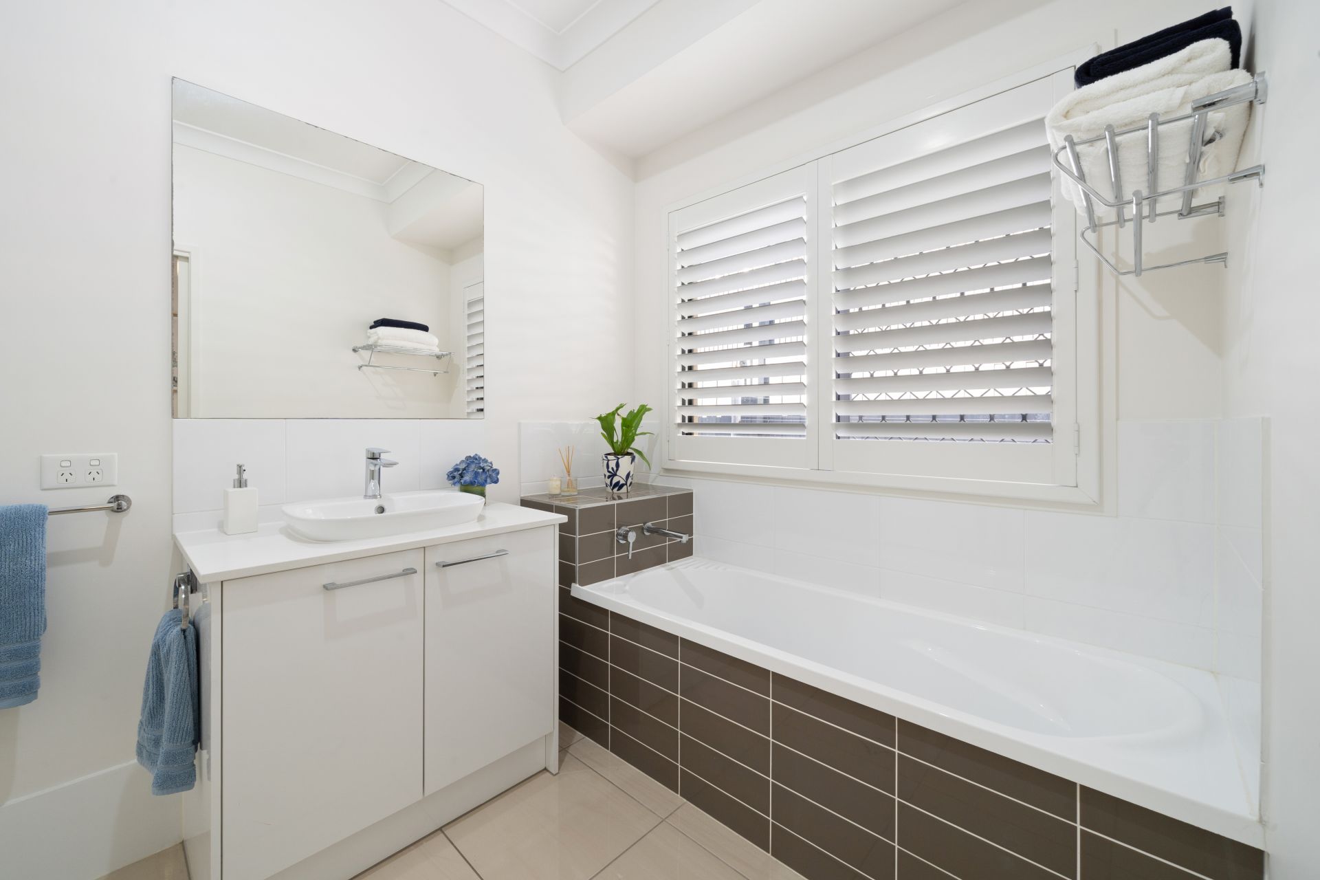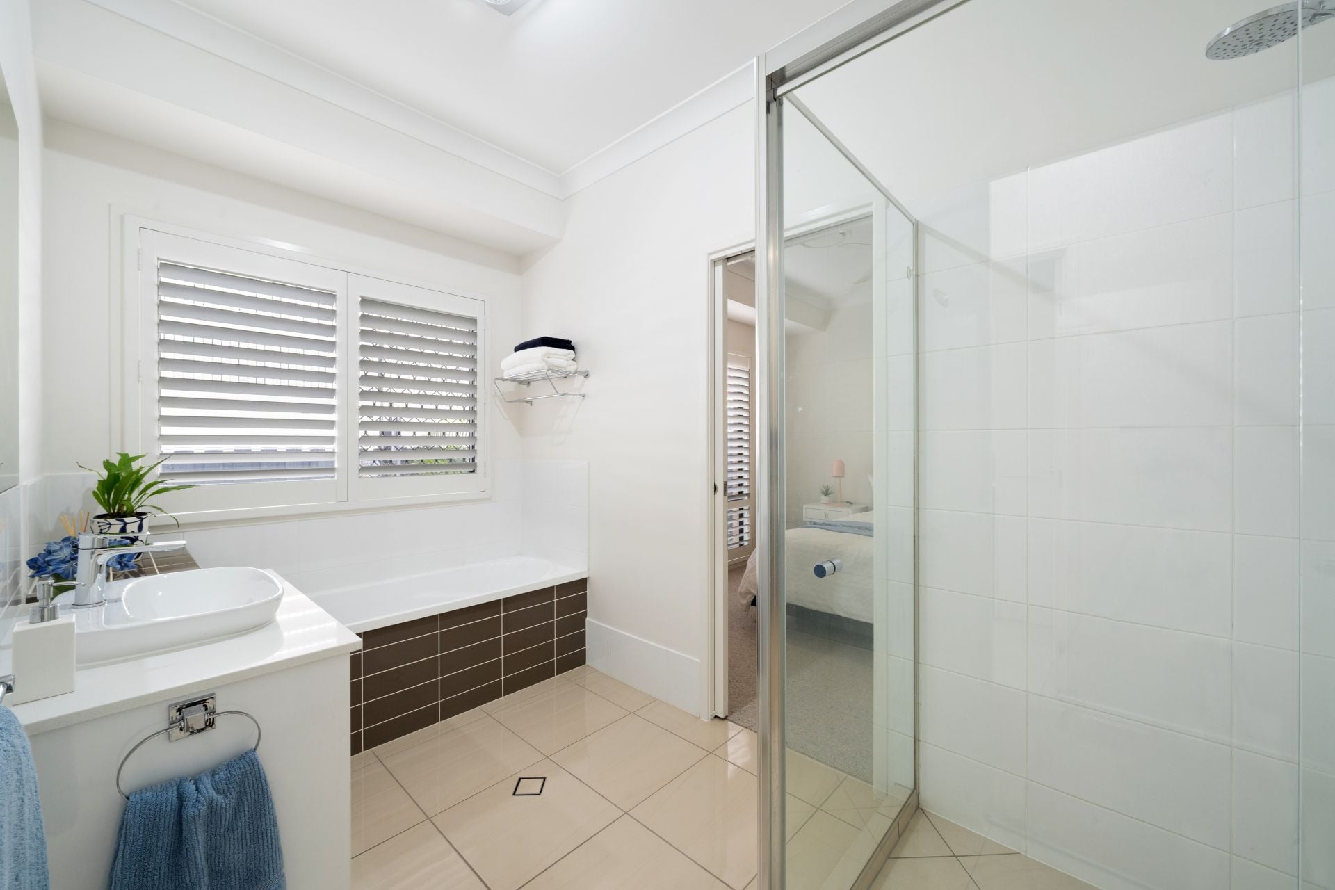 > The 2-way bathroom boasts a shower, a separate bath, a detachable showerhead, a single-basin stone topped vanity with storage, a tiled splashback, vanity mirror, an extractor/heat/light combo, towel rail, sliding window with security screen, tiled planation shutters, tiled flooring, and a separate toilet.