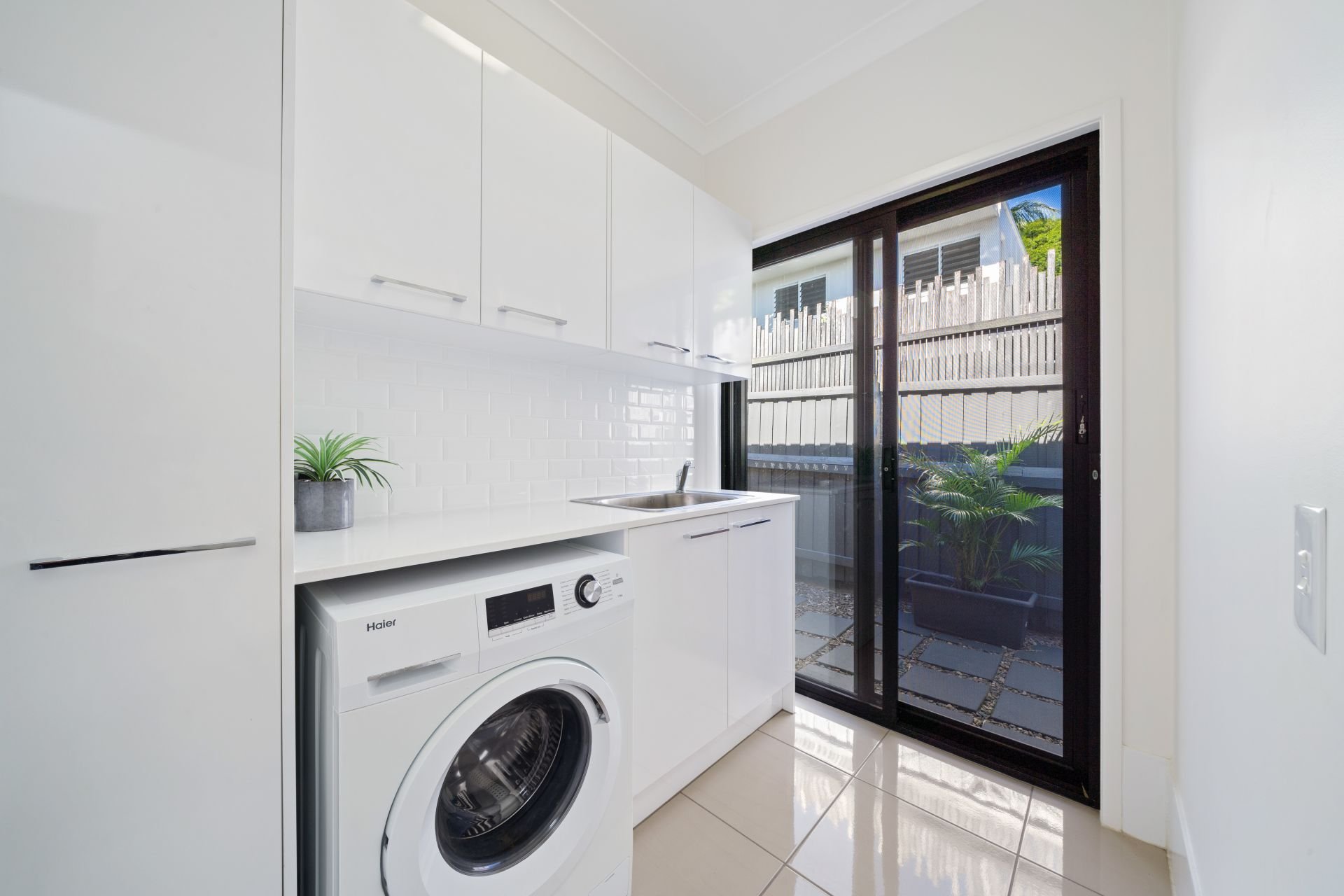 - The laundry boasts custom cabinetry with a stone benchtop, a washer cavity, sliding doors with security screens, and access to the yard.