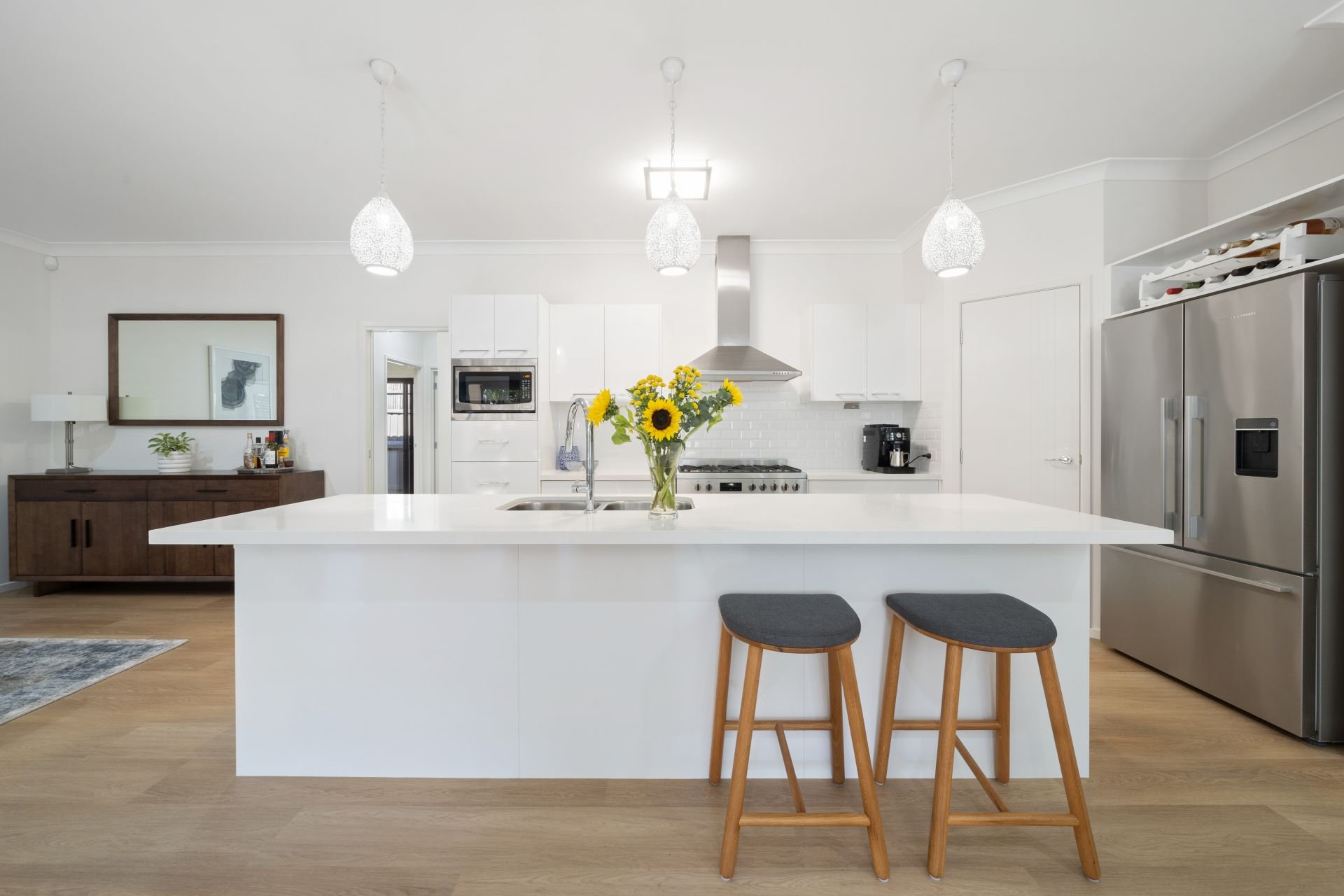 - The kitchen joins seamlessly to the main living and dining areas, featuring: