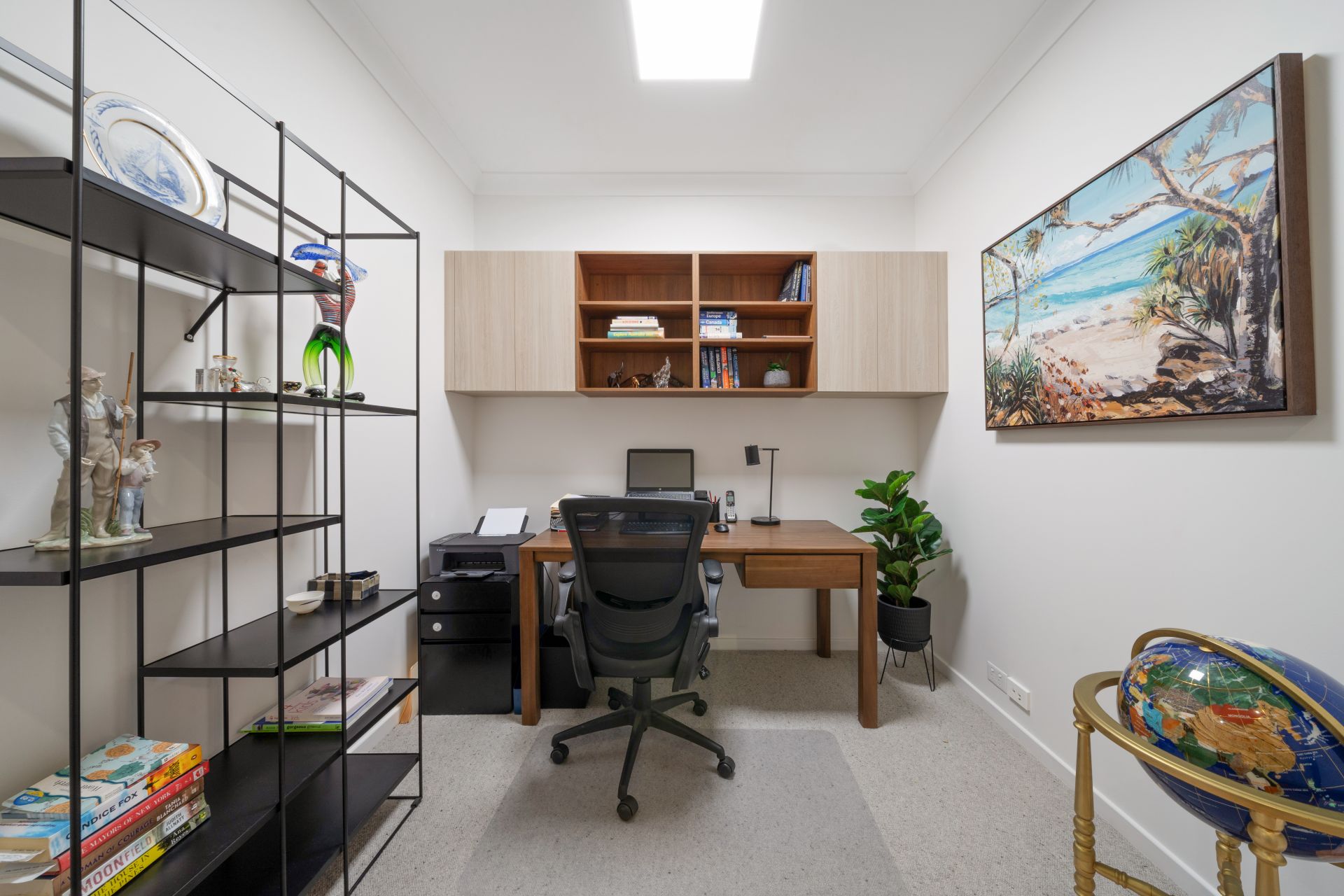 > Located at the front of the property is the home office featuring plush carpet flooring, custom cabinetry, solar sky light, ducted air-conditioning.